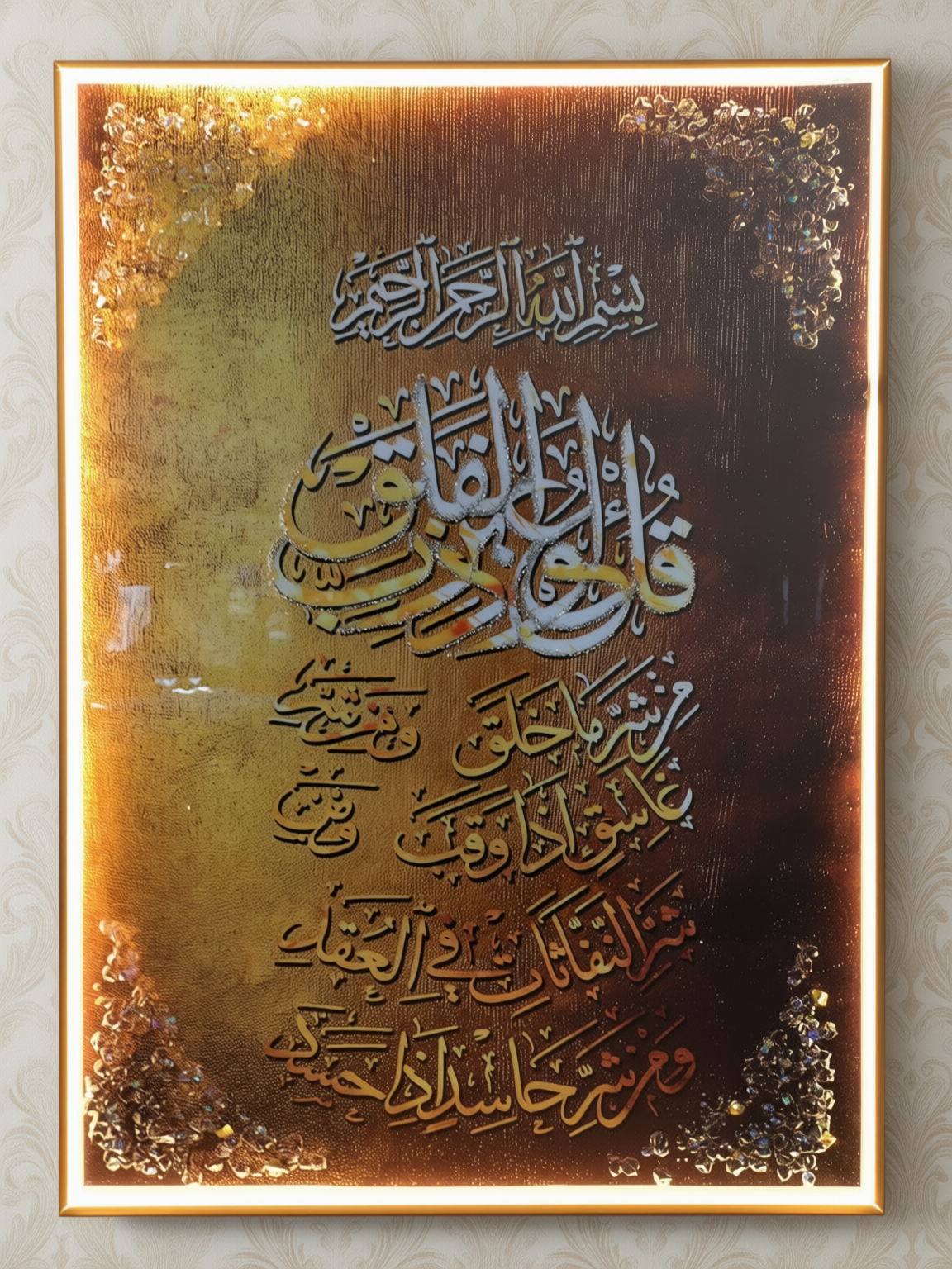 Skapa en atmosfär av ro, trygghet och exklusivitet i ditt hem med Al-Falaq Lumina 3D. Denna unika väggtavla är inte bara ett konstverk; det är en kombination av uråldrig visdom och modern ljusdesign. Med sin integrerade belysning och subtila relief-effekt blir tavlan rummets naturliga mittpunkt och sprider ett harmoniskt sken över sin omgivning.