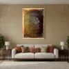 Konstnärlig finish: Bakgrunden har en rik textur i varma jordtoner och guld, vilket förstärks när belysningen tänds och de metalliska pigmenten börjar glöda.