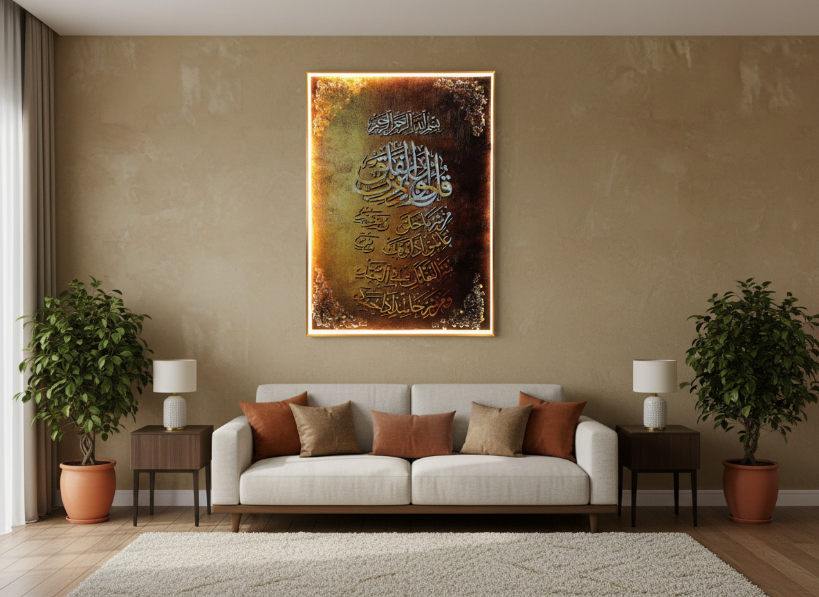 Subtil 3D-relief: Den arabiska kalligrafin och de dekorativa hörnen är skapade med en subtil relief-teknik. Detta innebär att mönstren är lätt upphöjda från den texturerade bakgrunden, vilket ger en sofistikerad taktil känsla och ett vackert spel mellan ljus och skugga.