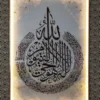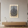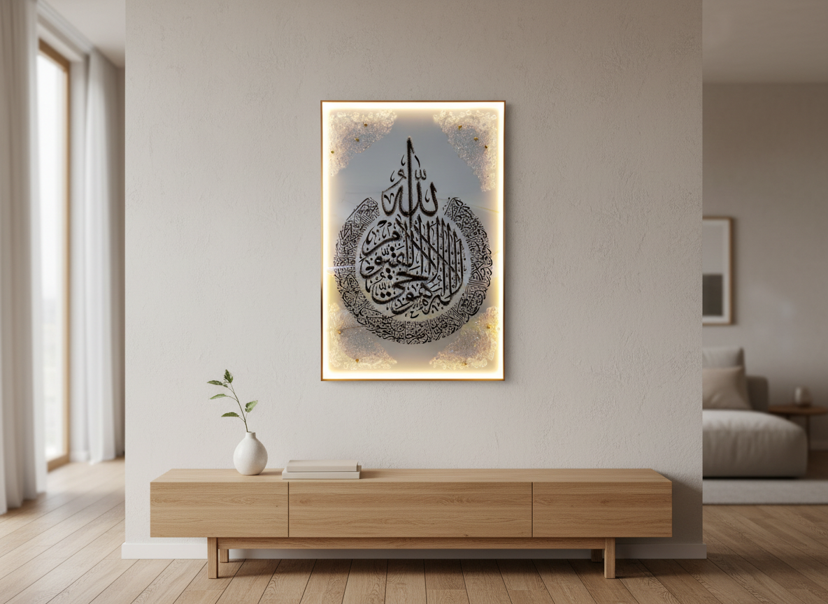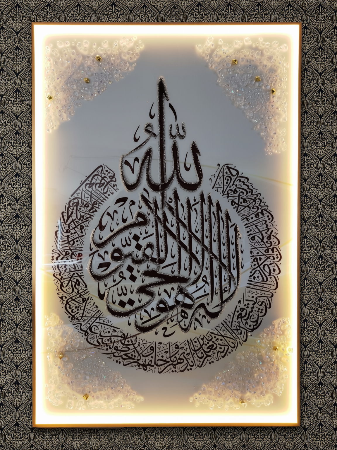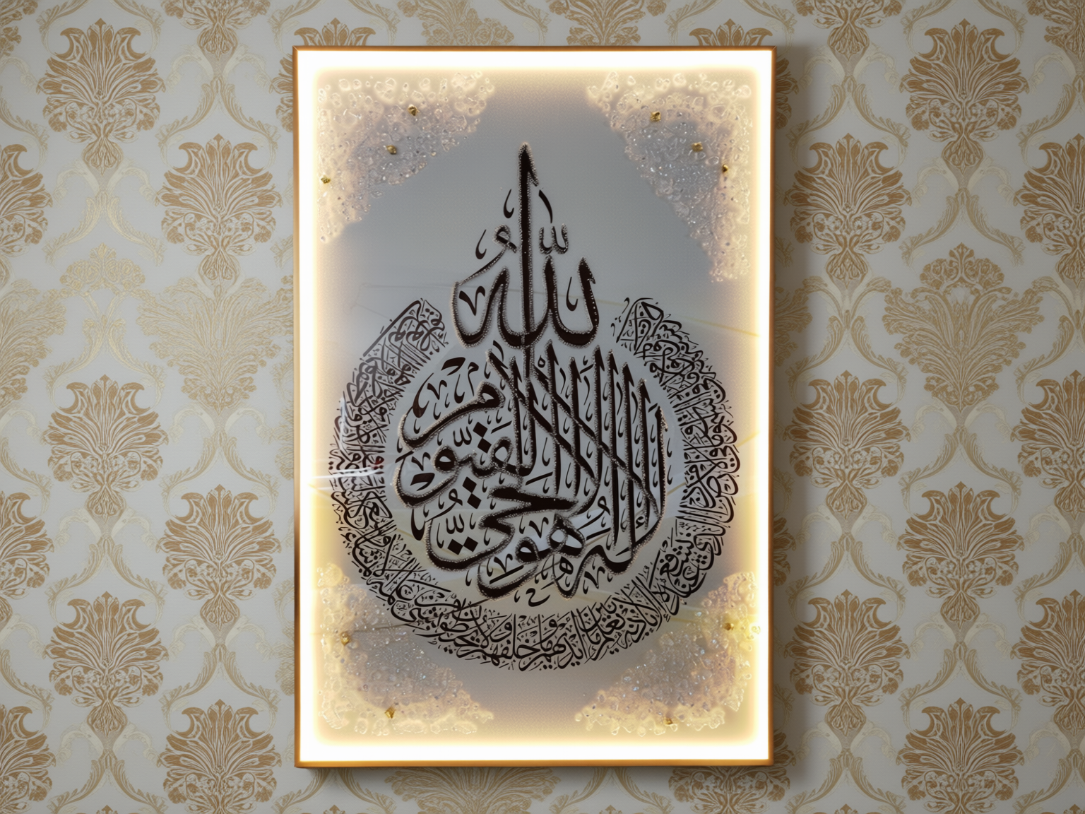 En exklusiv väggtavla (60 x 90 cm) med integrerad LED-belysning och en taktil relief-effekt. Motivet föreställer Ayatul Kursi i en magnifik silverfärgad kalligrafi, omgiven av gnistrande kristallformationer i hörnen. Tavlan ramas in av en lyxig ram i borstad metall.