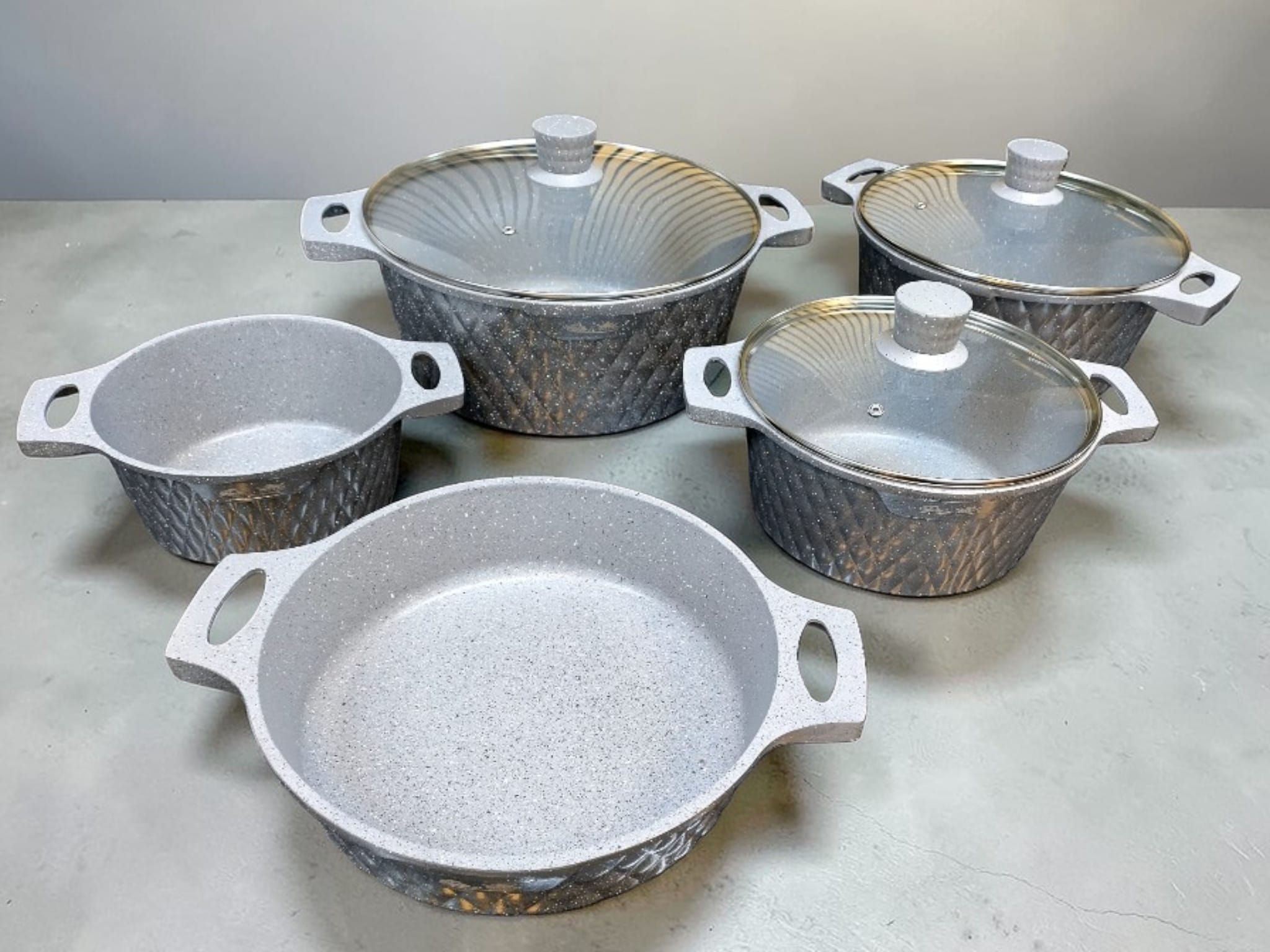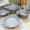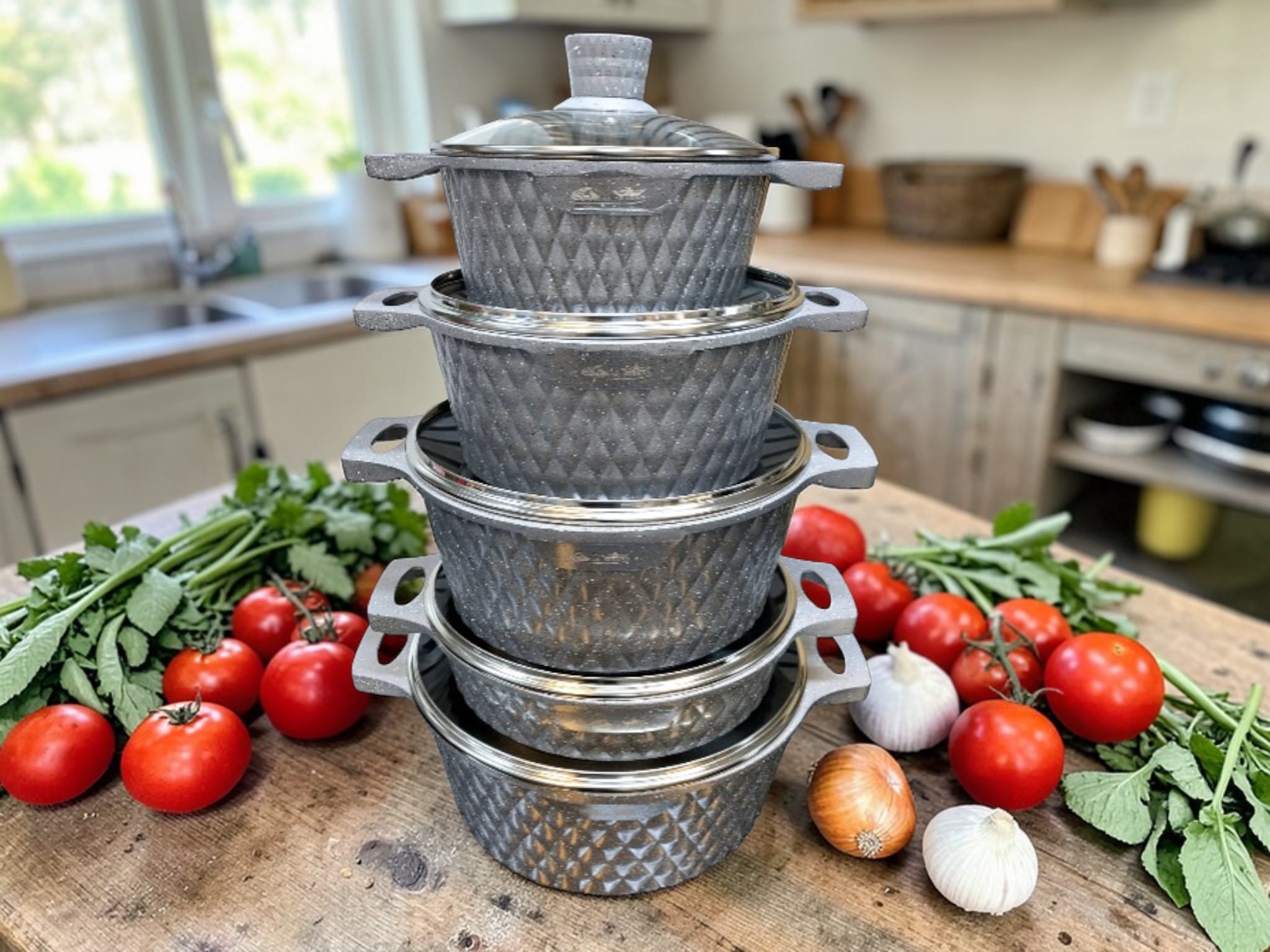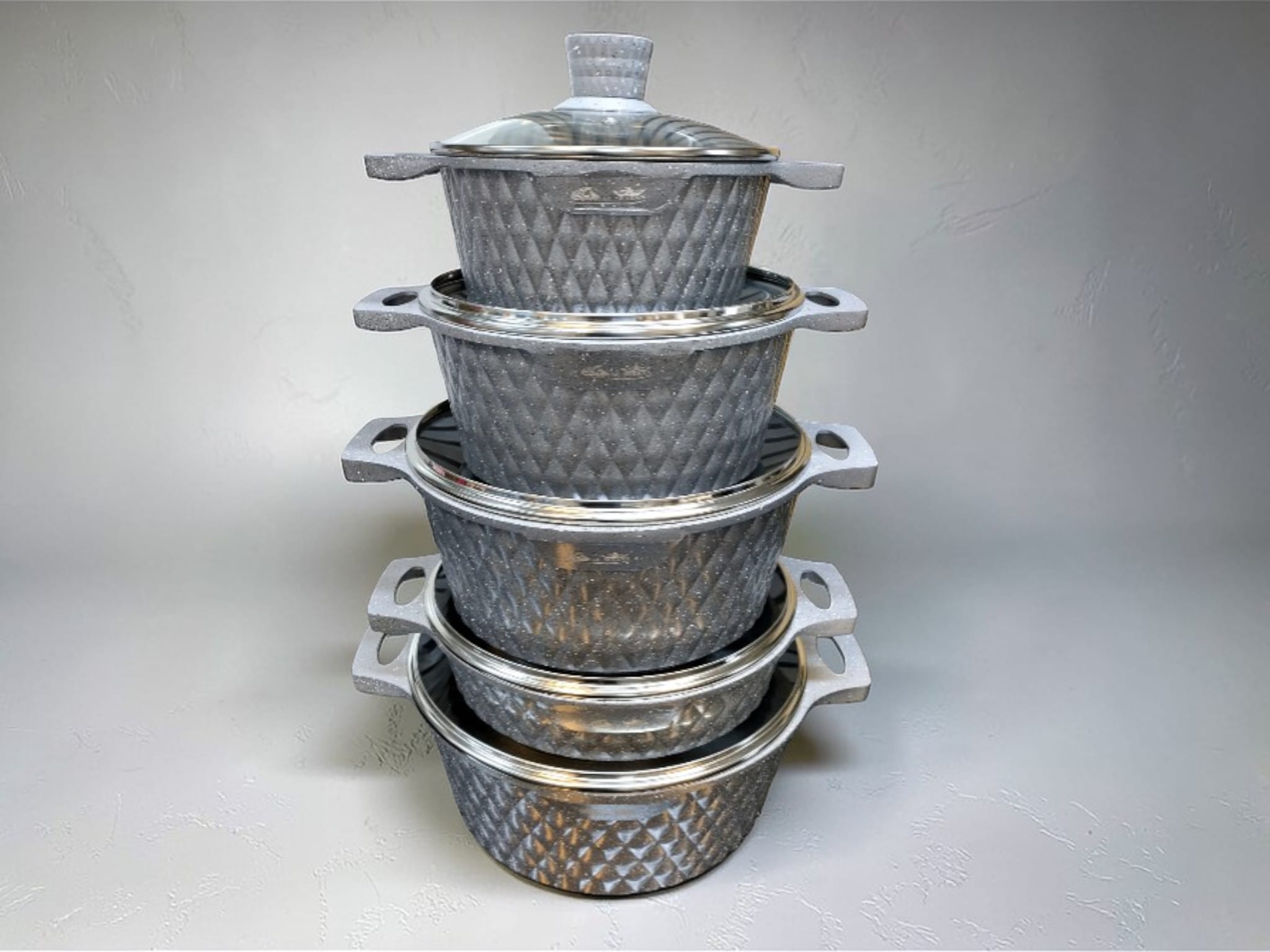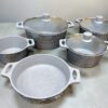 Ett komplett och visuellt imponerande grytset i 10 delar med enastående PFAS-fri granitbeläggning. Setet är tillverkat i kraftig pressgjuten aluminium med en elegant grå diamantfinish och är fullt kompatibelt med alla spistyper, inklusive induktion.
