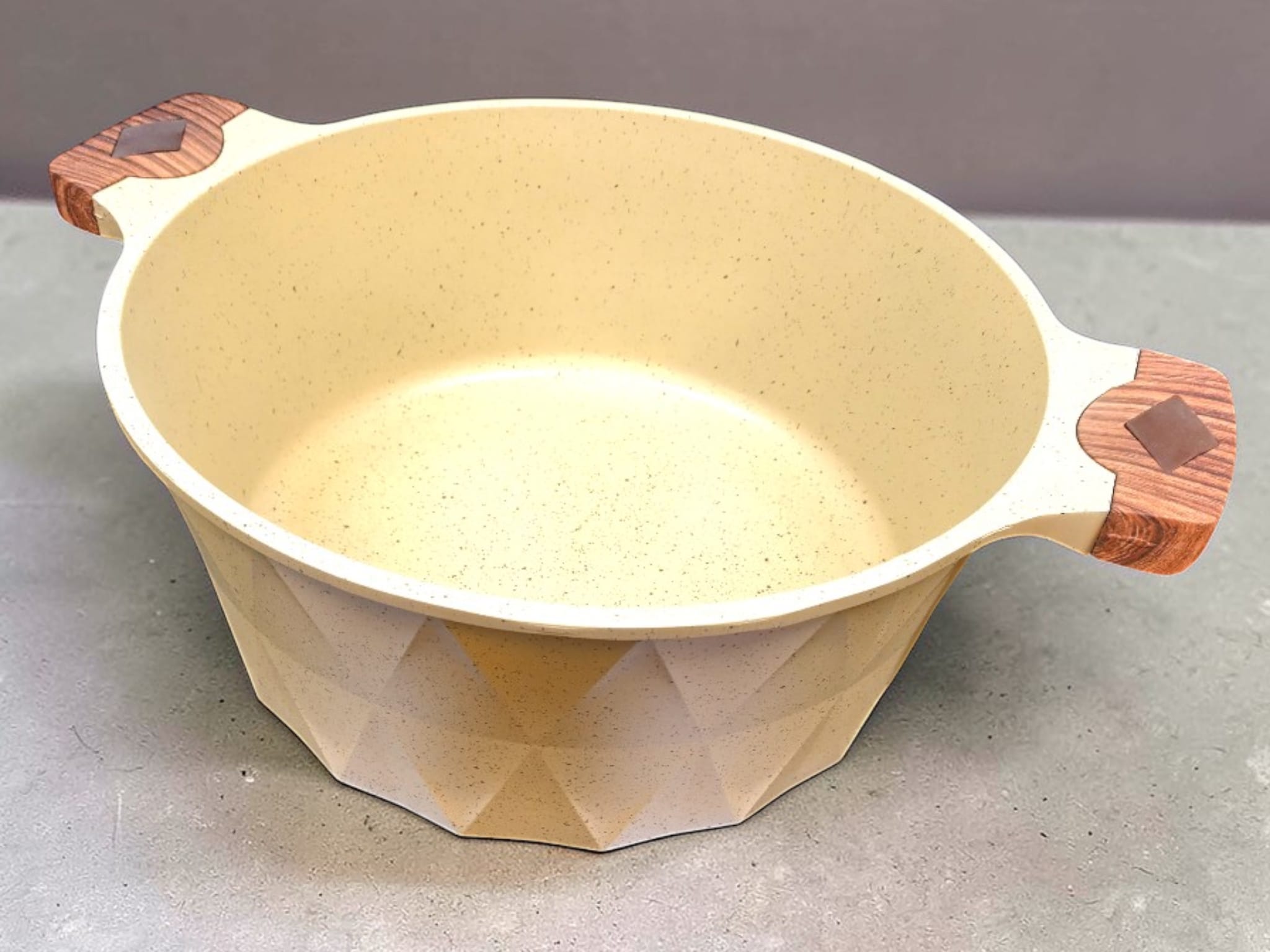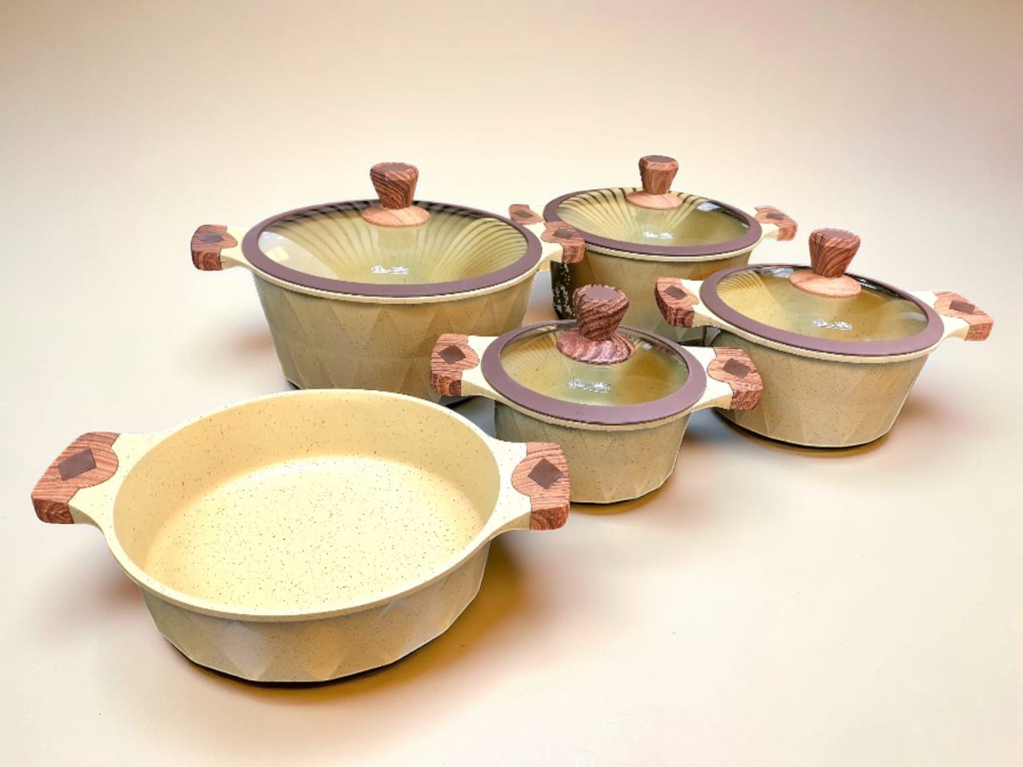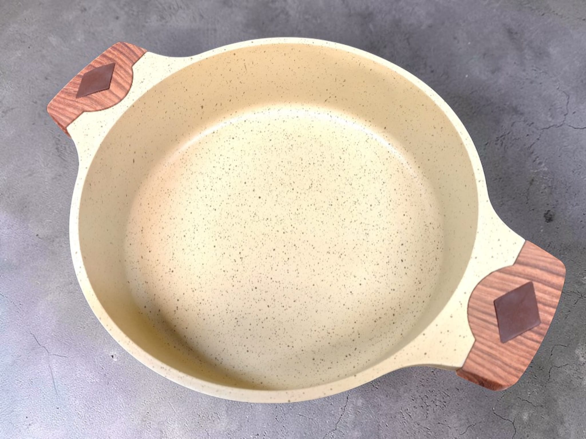 Ett komplett och visuellt slående grytset i 10 delar med en högkvalitativ PFOA-fri granitbeläggning. Setet kombinerar pressgjuten aluminium för optimal värmeledning med ergonomiska handtag i träimitation. Fungerar utmärkt på alla spistyper, inklusive induktion.