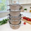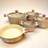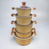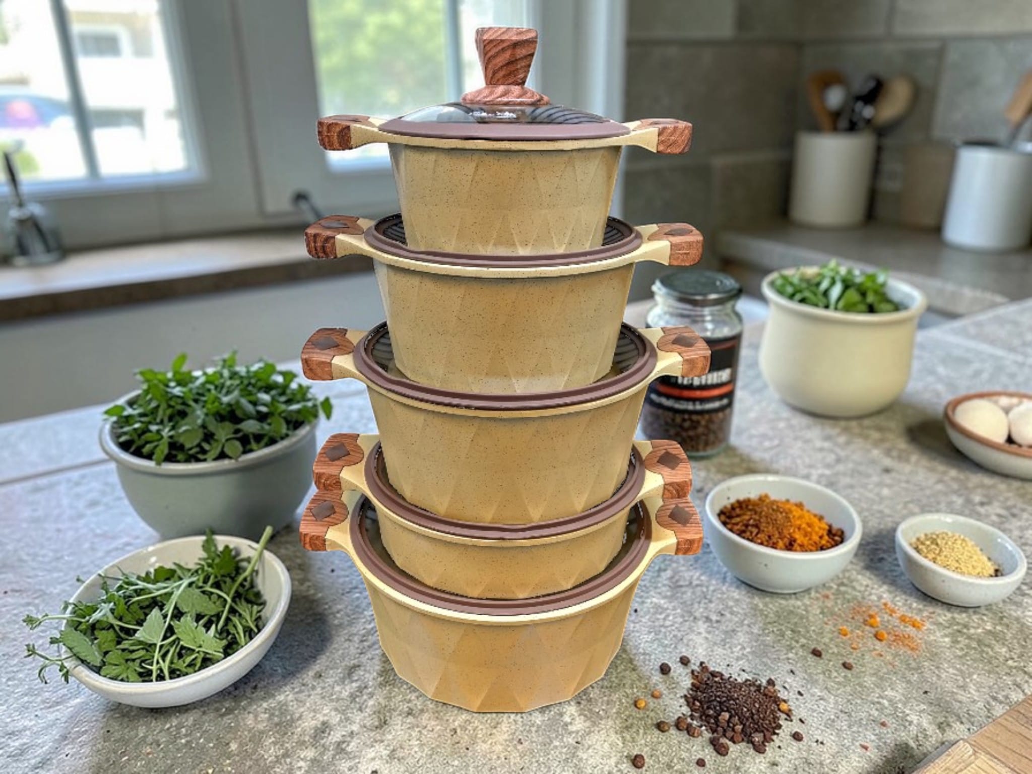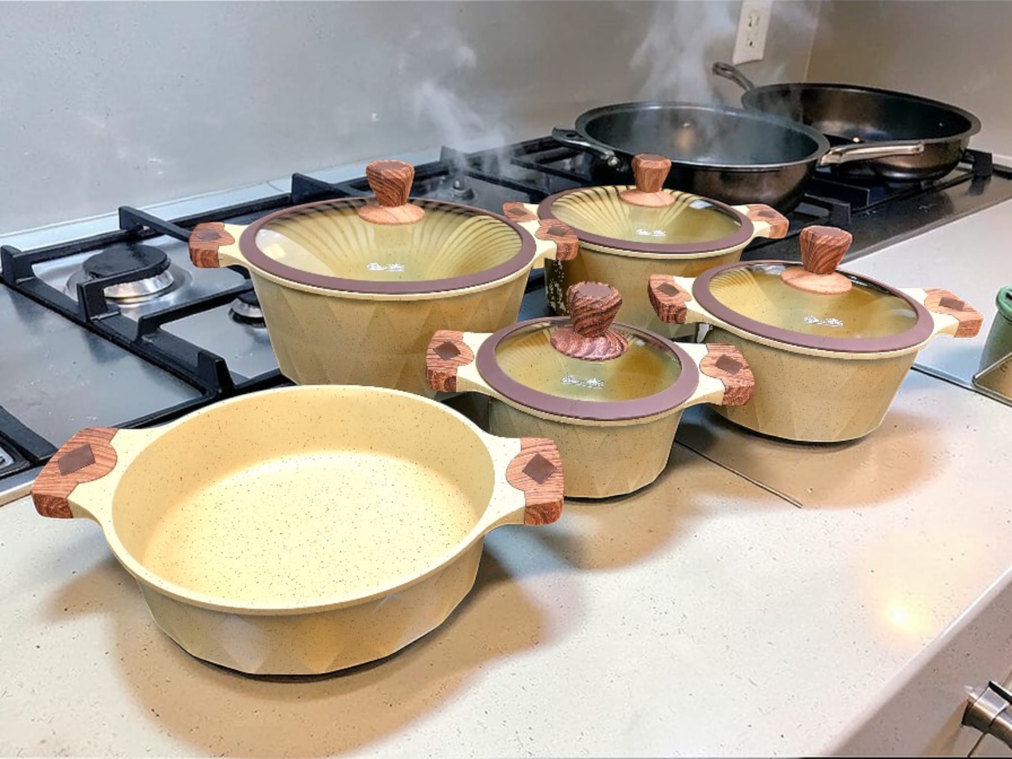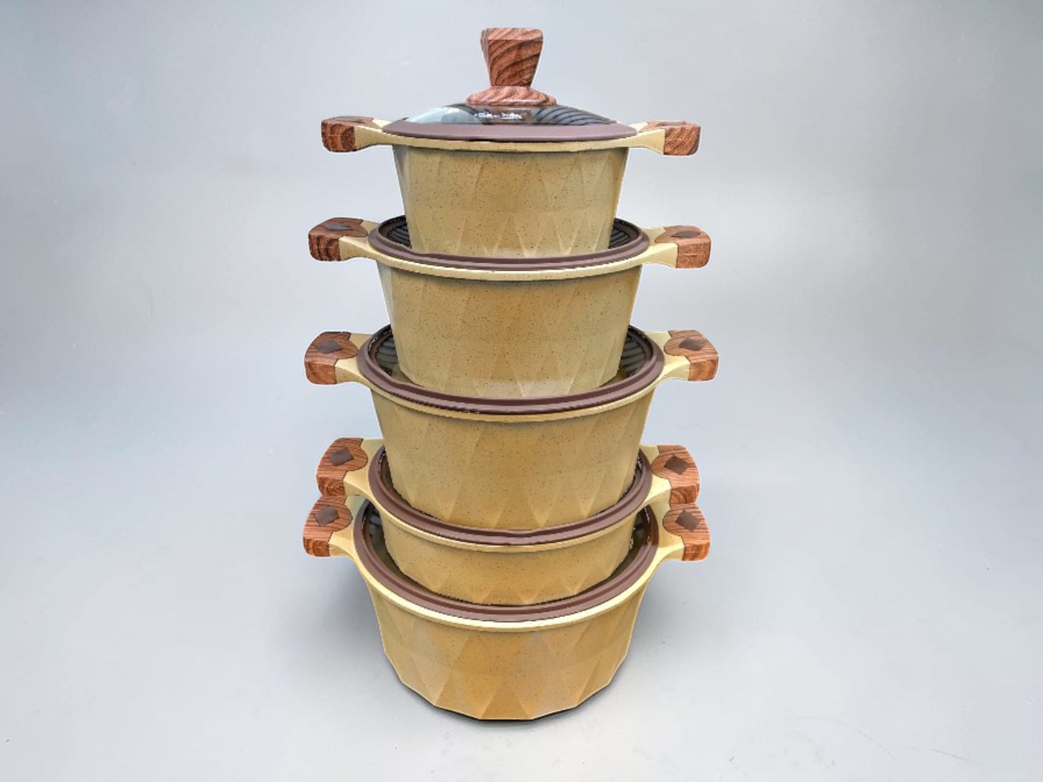 Ett komplett och visuellt slående grytset i 10 delar med en högkvalitativ PFOA-fri granitbeläggning. Setet kombinerar pressgjuten aluminium för optimal värmeledning med ergonomiska handtag i träimitation. Fungerar utmärkt på alla spistyper, inklusive induktion.