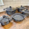Överlägsen hållbarhet: Tillverkade i pressgjuten aluminium för optimal värmefördelning och lång livslängd. De integrerade handtagen är gjutna i ett stycke, vilket gör grytorna extremt stabila och ugnssäkra.