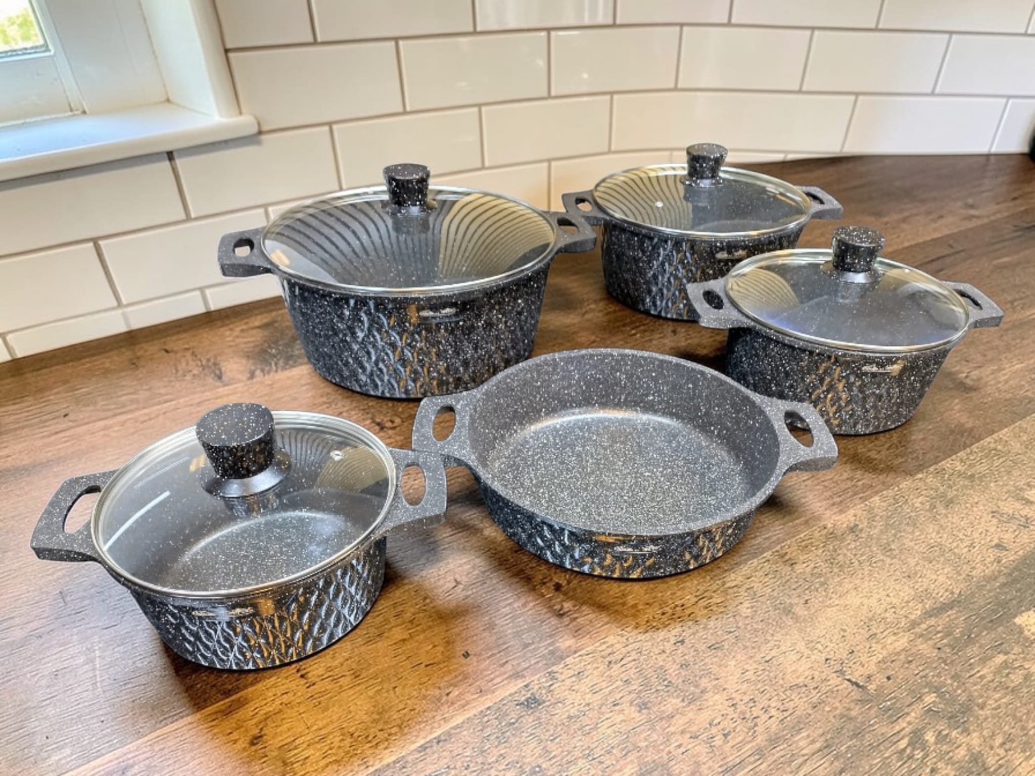 Härdade glaslock med ångventil: De transparenta locken låter dig ha full koll på matlagningen. De har rejäla knoppar i svart granitfinish och en inbyggd ventil som släpper ut överskottsånga.