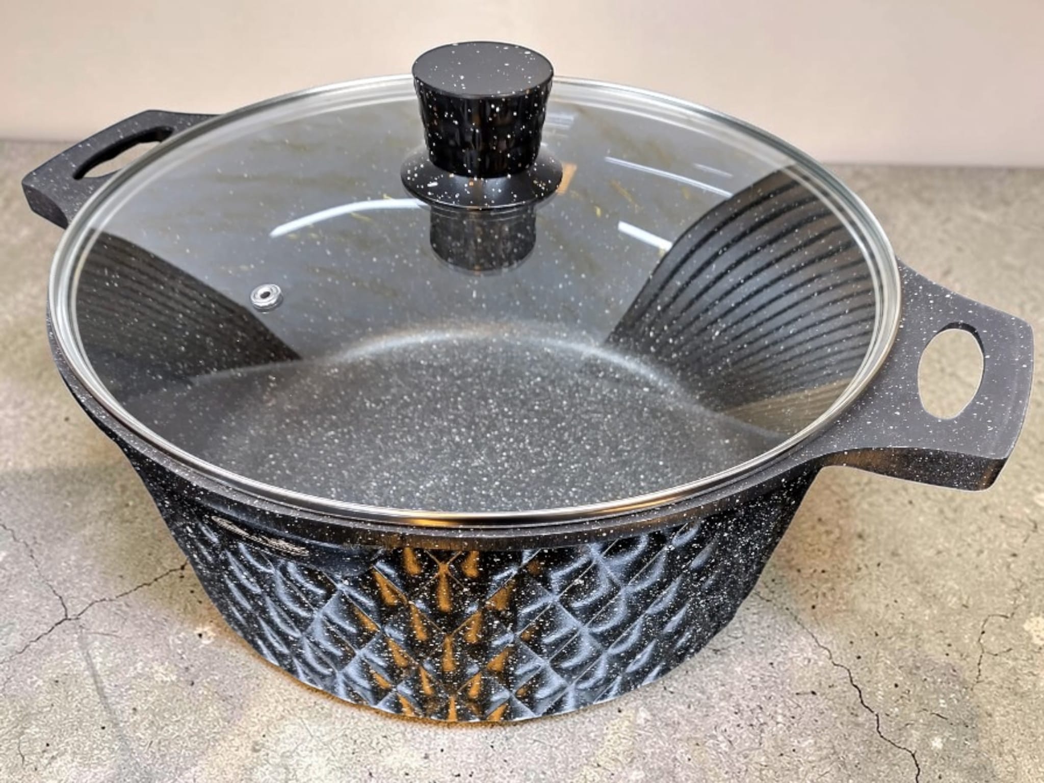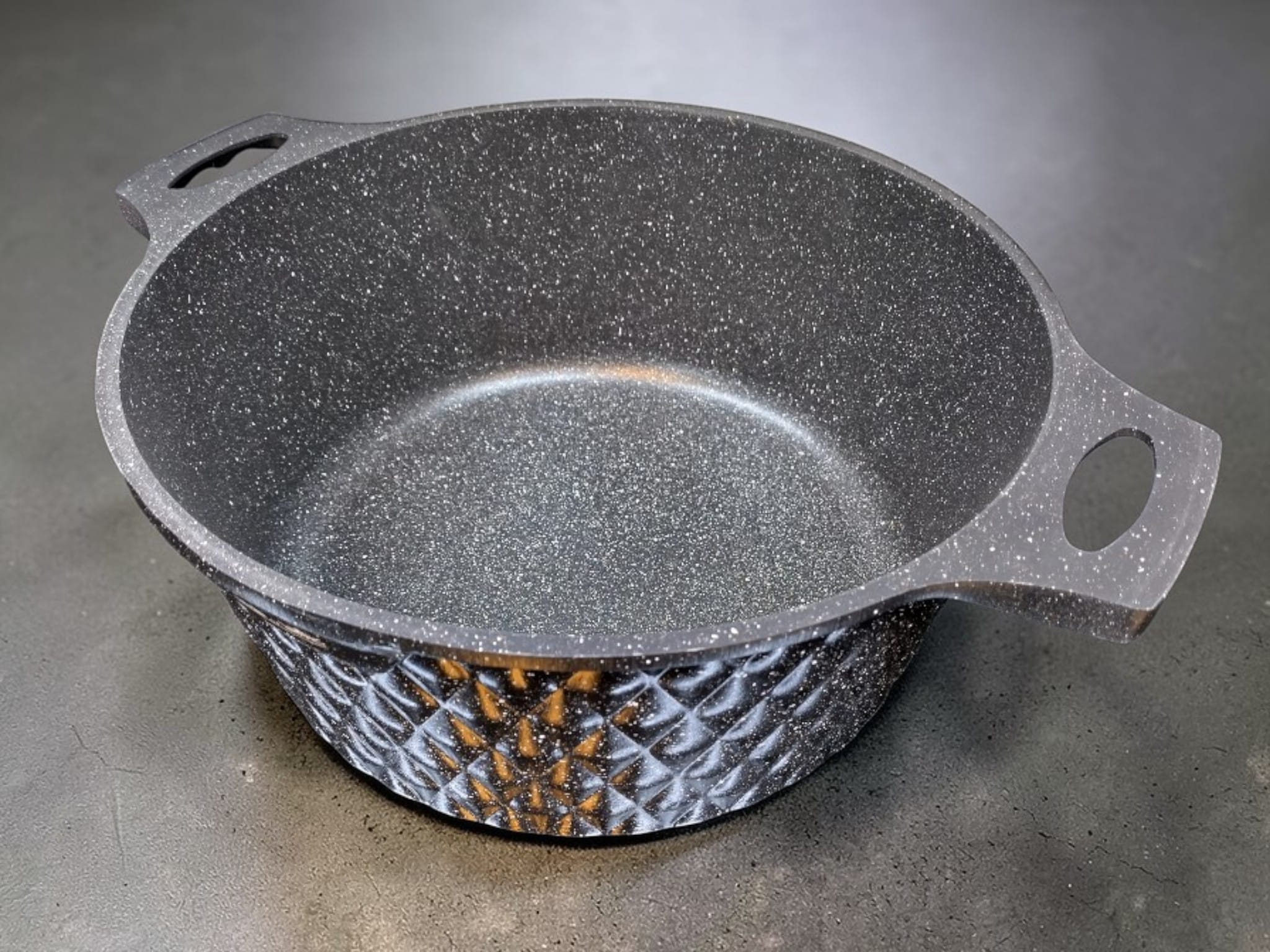 Dramatisk Diamond Cut-design: Den fasettslipade svarta utsidan ger grytorna en exklusiv 3D-struktur som är både reptålig och lättskött, samtidigt som den blir ett snyggt blickfång på spisen.