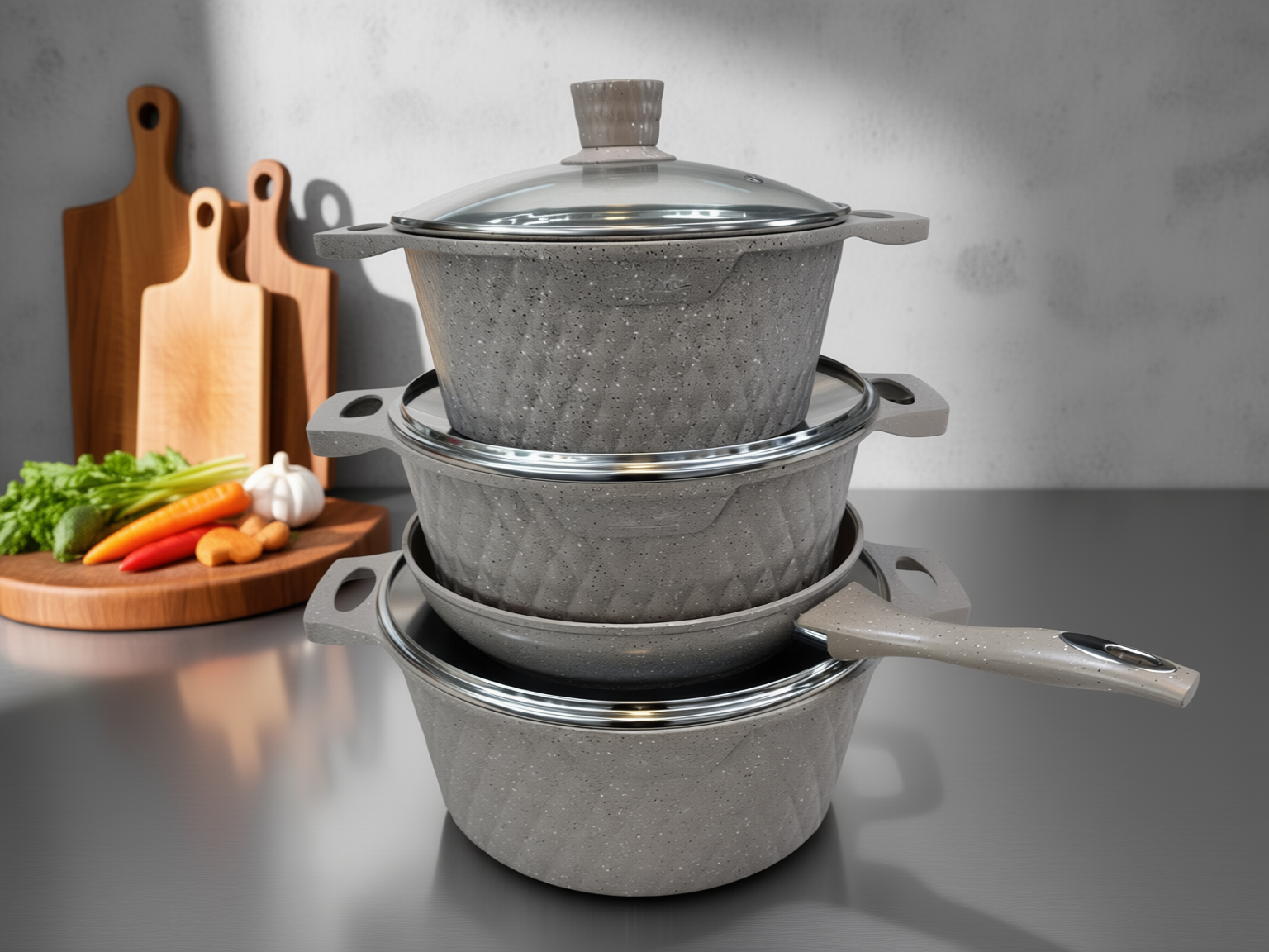 Setet består av 4 kokkärl (varav 3 med lock):