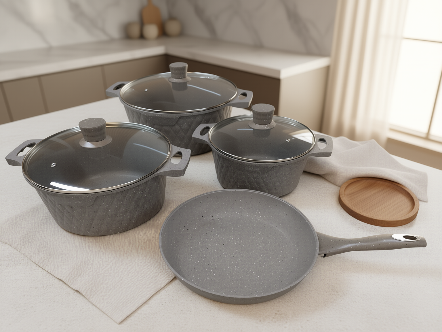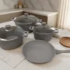 Integrerade och stabila handtag: Grytorna har gjutna handtag i ett stycke, vilket gör dem mycket hållbara och enkla att hantera. Stekpannan har ett ergonomiskt handtag i matchande champagnefinish.