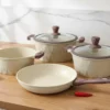 Eleganta detaljer i trädekor: Handtagen på både grytor, stekpanna och lockens knoppar har en vacker trätextur. De är ergonomiskt utformade för ett säkert och behagligt grepp som håller sig svalt under matlagningen.