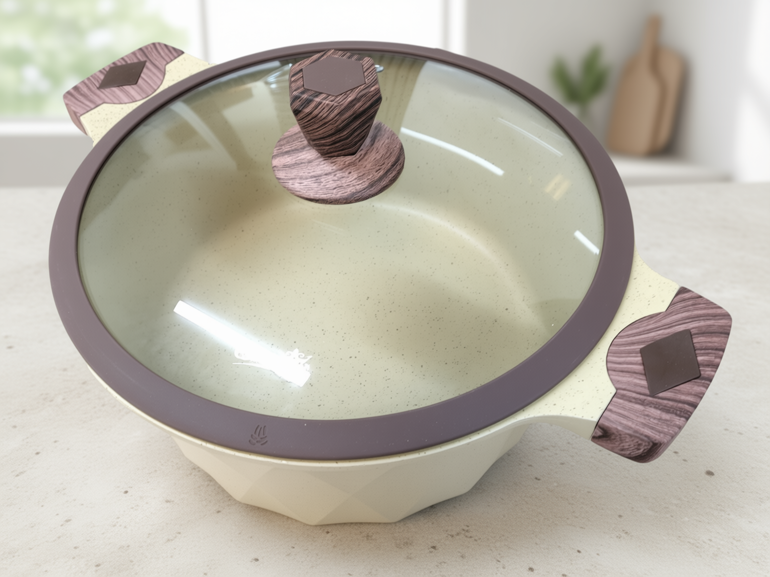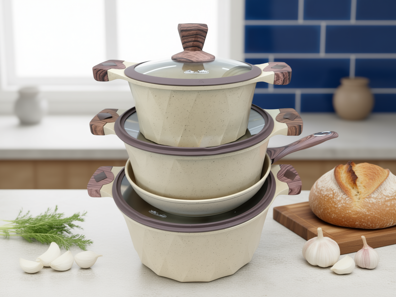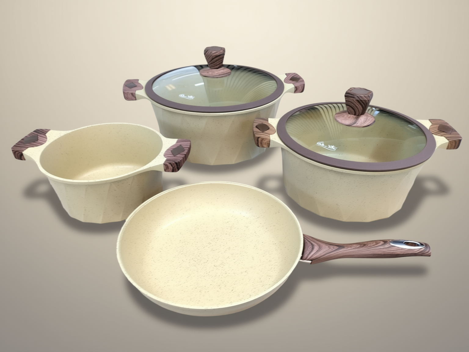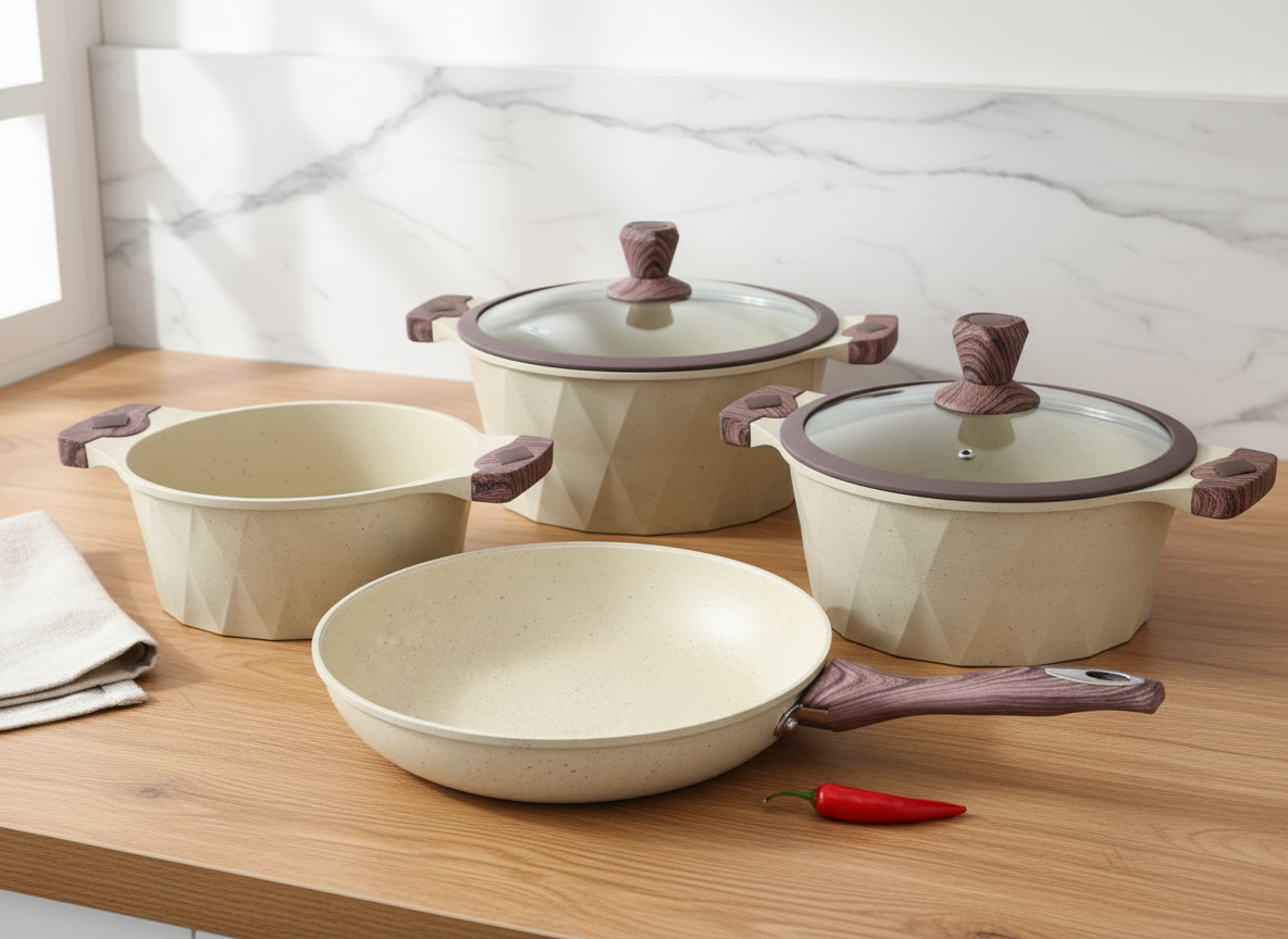 Ge ditt kök en modern och naturnära touch med Al Sultan i utförandet Gul/Trä. Detta set förenar en rå, diamantslipad exteriör med eleganta detaljer i träimitation, vilket skapar en perfekt balans mellan industriell design och hemtrevlig värme. Det är det ultimata valet för dig som vill ha högpresterande kokkärl som ser lika bra ut på spisen som vid serveringen på bordet.