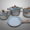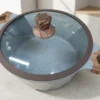 Eleganta detaljer i trädekor: Handtagen på både grytor, stekpanna och lockens knoppar har en vacker trätextur. De är ergonomiskt utformade för ett säkert och behagligt grepp som håller sig svalt under matlagningen.