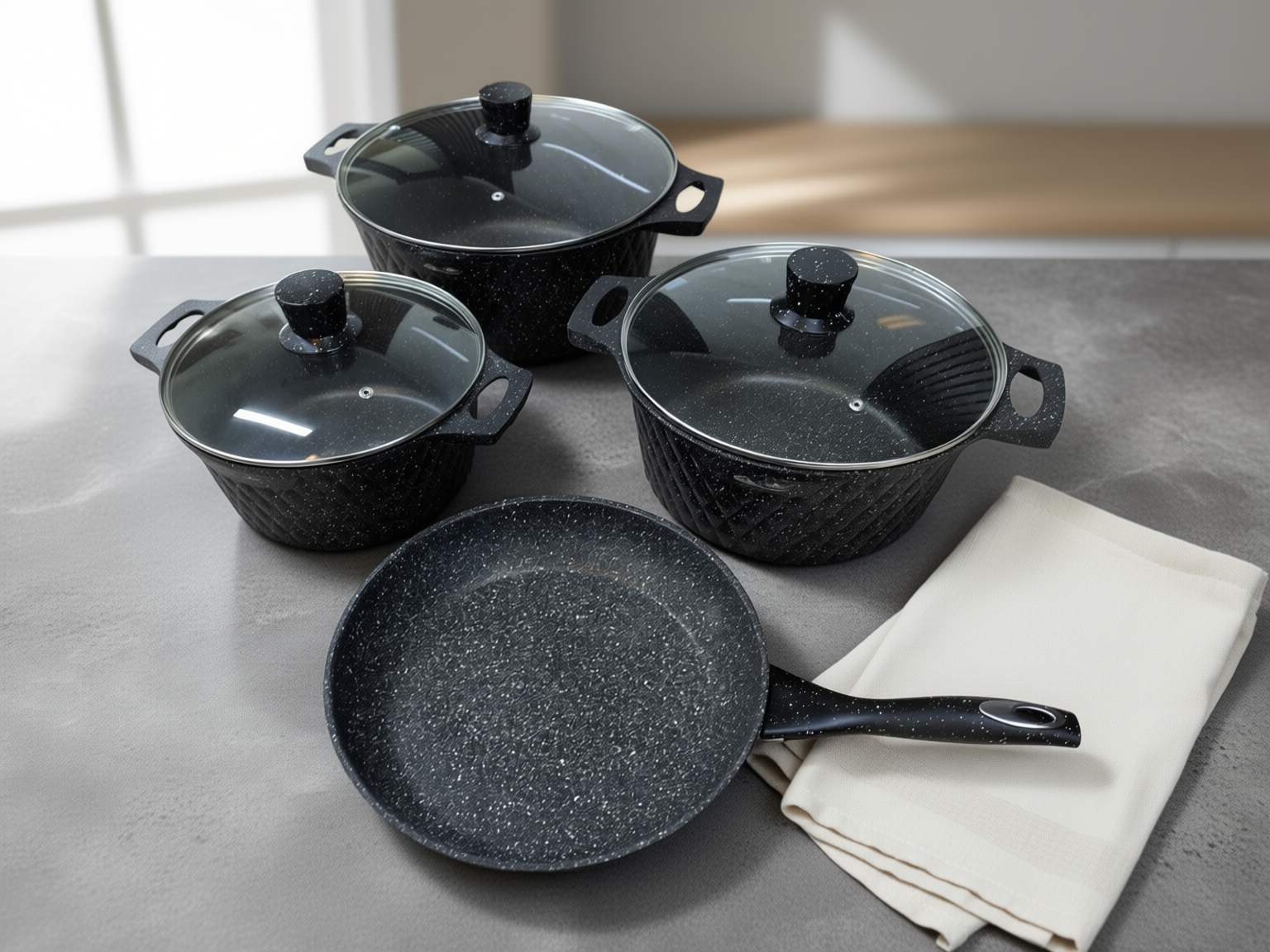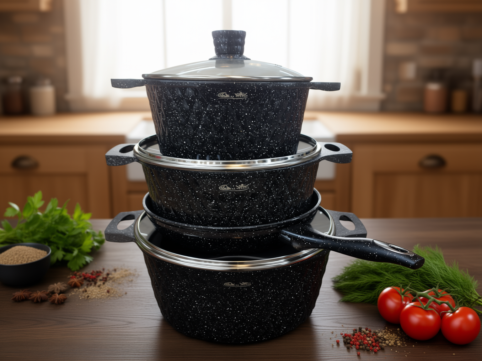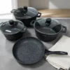 Ergonomiska och integrerade handtag: Grytorna har gjutna handtag som gör dem stabila och säkra att hantera. Stekpannan har ett matchande, greppvänligt handtag som ligger stadigt i handen.
