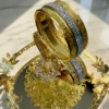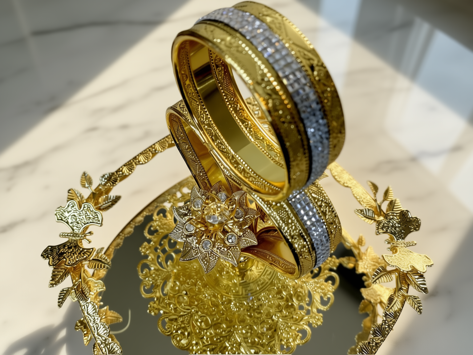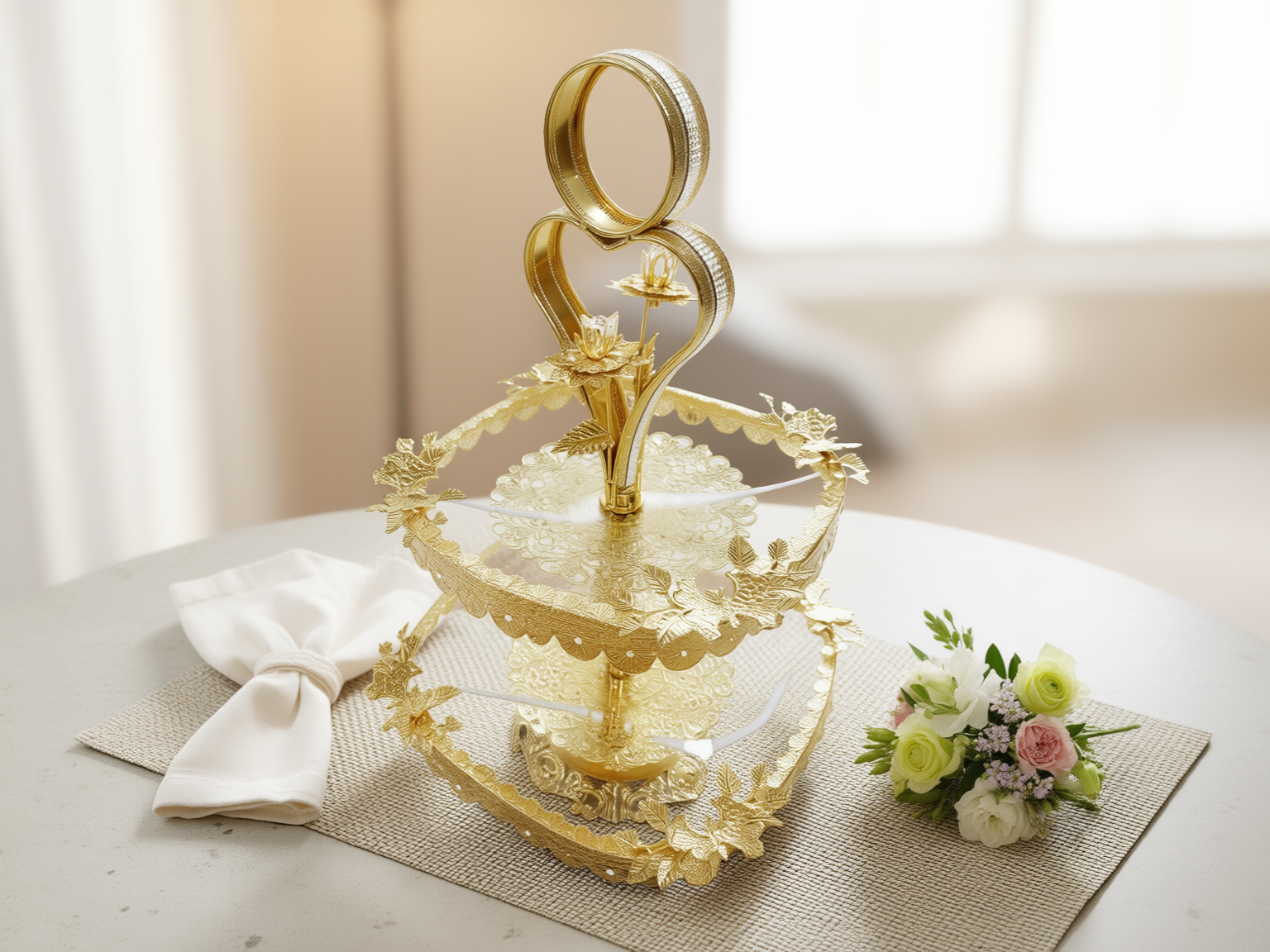 Ett magnifikt serveringsfat i en strålande guldfärgad finish som andas kunglig lyx och tidlös elegans. Denna variant kombinerar intrikata filigranmönster med tallrikar i klart glas, prydda med en sofistikerad guldkant och ett vackert mönstrat centrum. Med sitt unika hjärtformade handtag och den centrala lotusblomman smyckad med gnistrande kristaller, är detta fatet som förvandlar varje bjudning till en kunglig upplevelse.