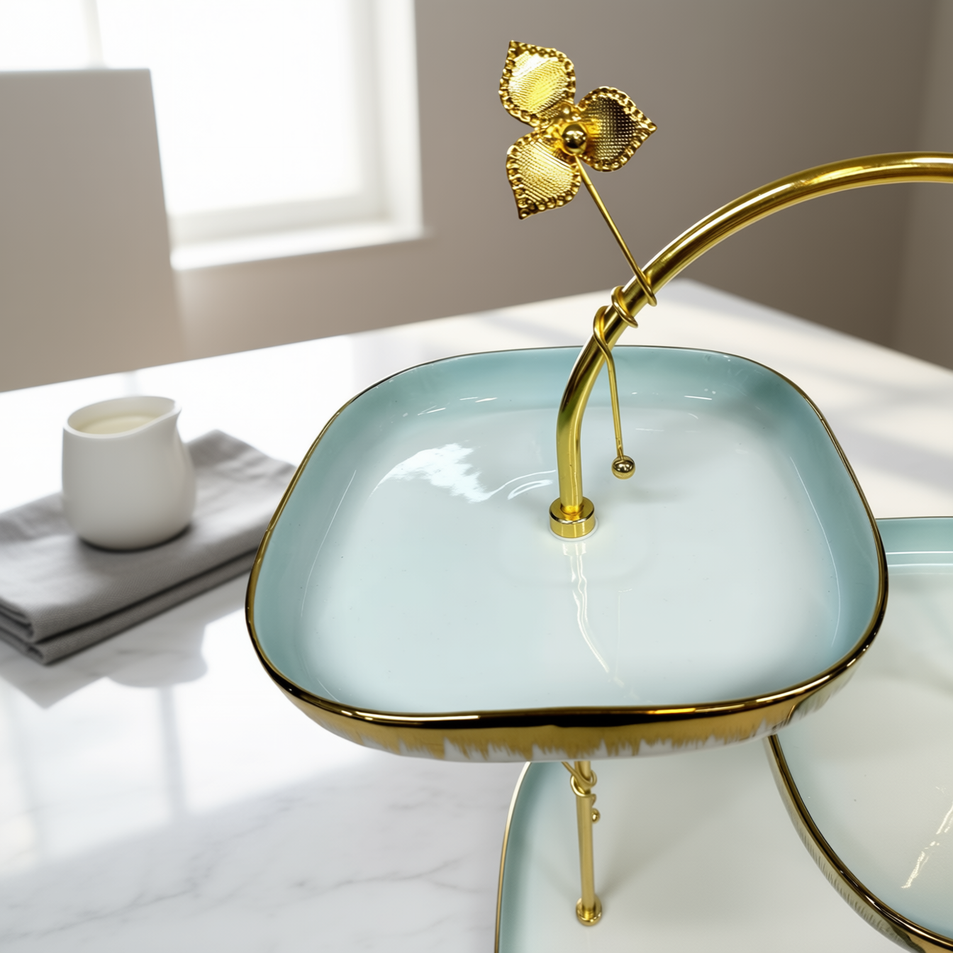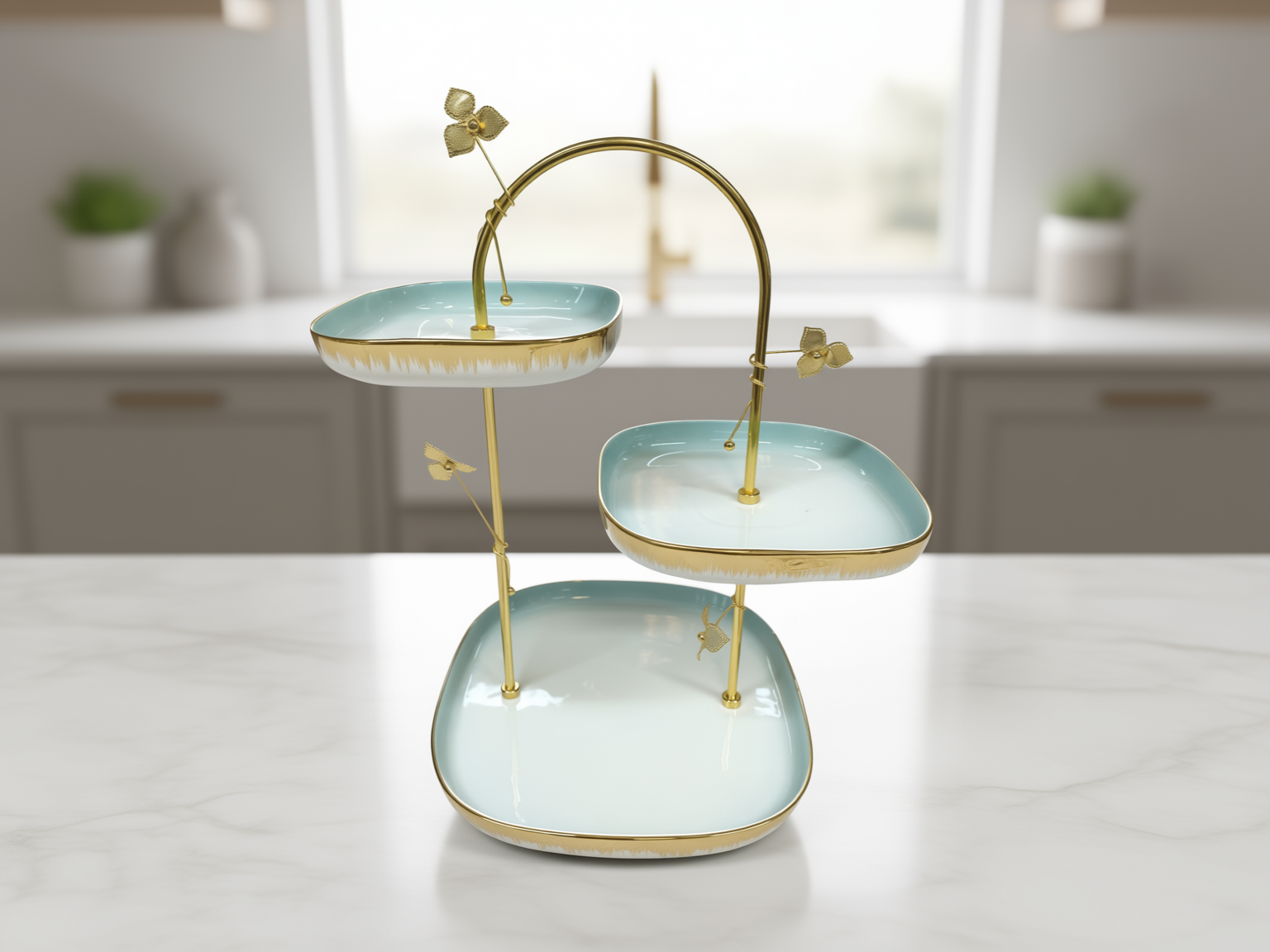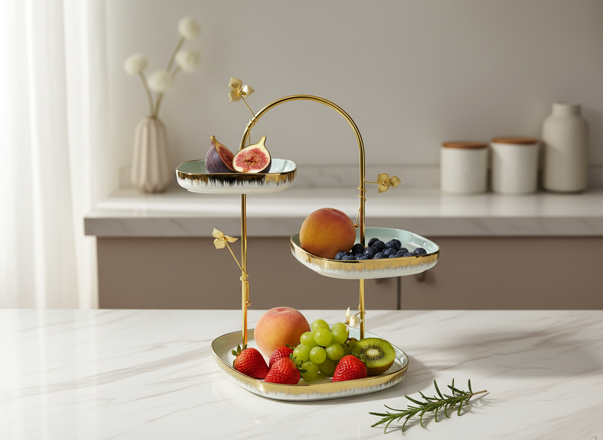 Ett exklusivt och konstnärligt kakfat i tre nivåer som kombinerar dramatisk design med lyxiga detaljer. Ställningen i guldfärgad metall har en unik, flödande bågform som efterliknar en slingrande gren. Tallrikarna i vitt och sofistikerat grönt pryds av delikata smaragdringar med blad- och prickmönster samt eleganta guldband, vilket gör detta fat till den ultimata mittpunkten för en pampig och stilren bjudning.