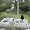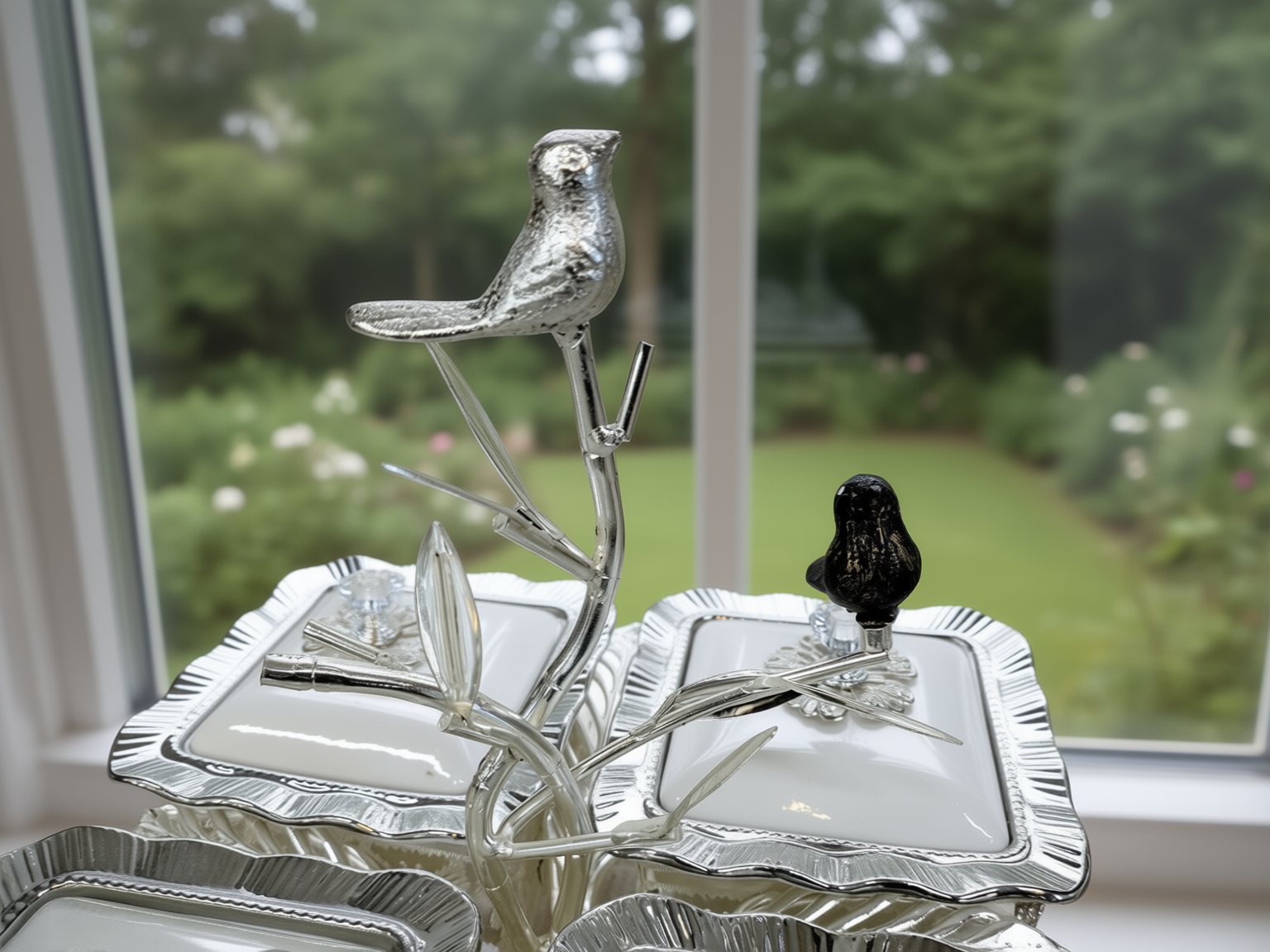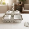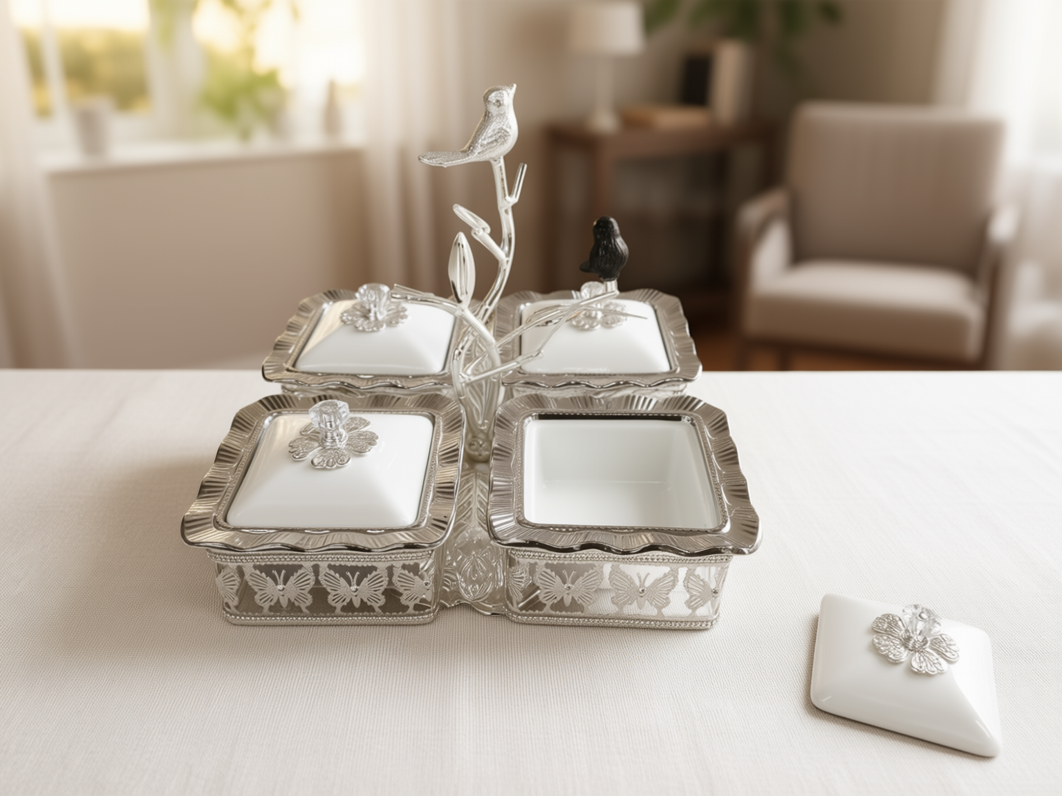 Basen utgörs av en vackert detaljerad silverfärgad hållare prydd med ett genombrutet fjärilsmönster. I centrum reser sig en elegant gren där två små fåglar – en i matchande silver och en i kontrasterande midnattsvart – har slagit sig till ro. De fyra vita porslinsskålarna har stilrena lock dekorerade med gnistrande kristalliknande knoppar formade som blommor, vilket gör setet perfekt för allt från exklusivt godis och nötter till lyxiga tillbehör vid middagsbjudningen.