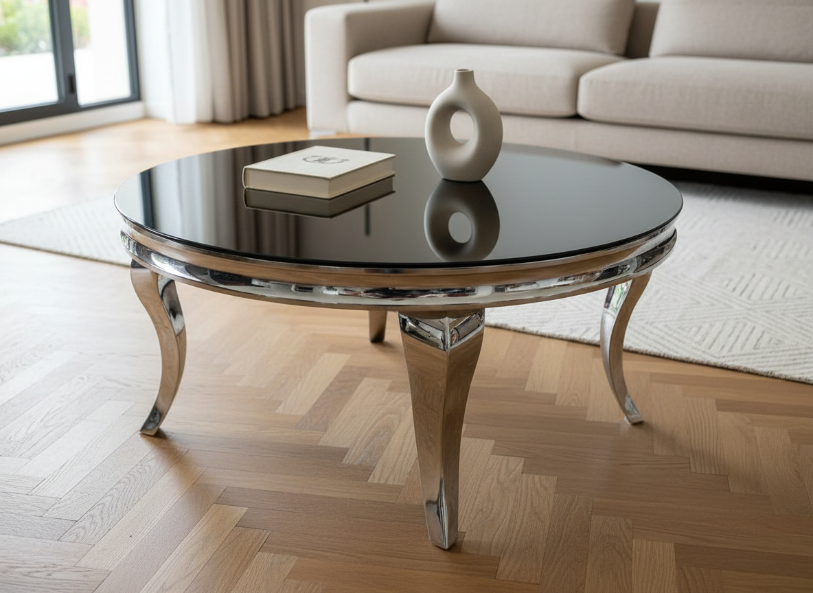 Ge ditt vardagsrum en air av sofistikerad glamour med Buenos Aires, ett runt soffbord som verkligen drar blicken till sig. Detta bord är den perfekta mittpunkten för dig som söker en balans mellan modern minimalism och klassisk barock-inspiration.