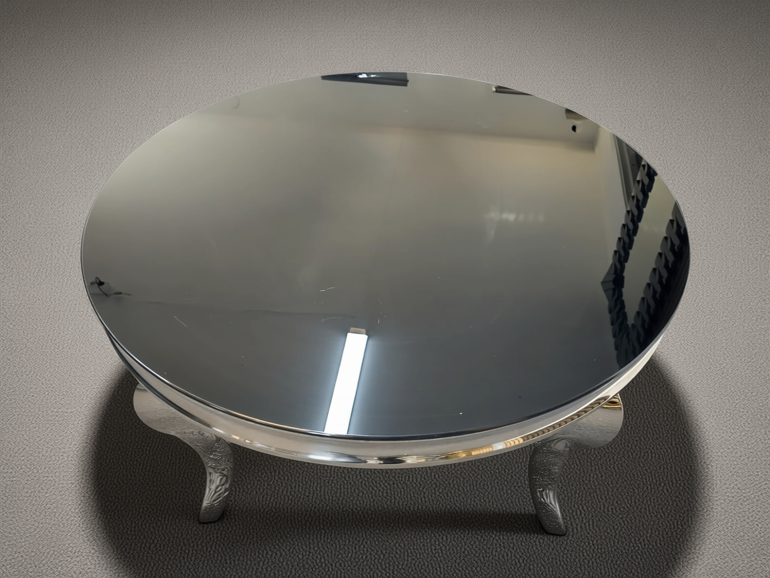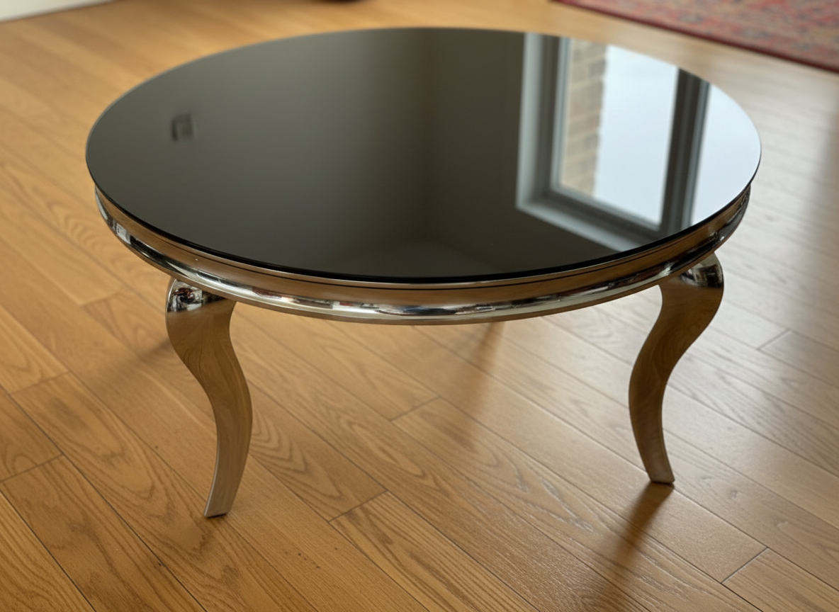 Bordet har en slående blanksvart skiva som reflekterar ljuset vackert och ger en djup, lyxig känsla. Den mörka skivan ramas in av en robust sarg i högblankt silver som vilar på fyra mjukt svängda ben. Benens skulpturala form ger bordet en unik karaktär och en känsla av hantverksmässig kvalitet, samtidigt som de kromade ytorna håller designen modern och fräsch.