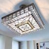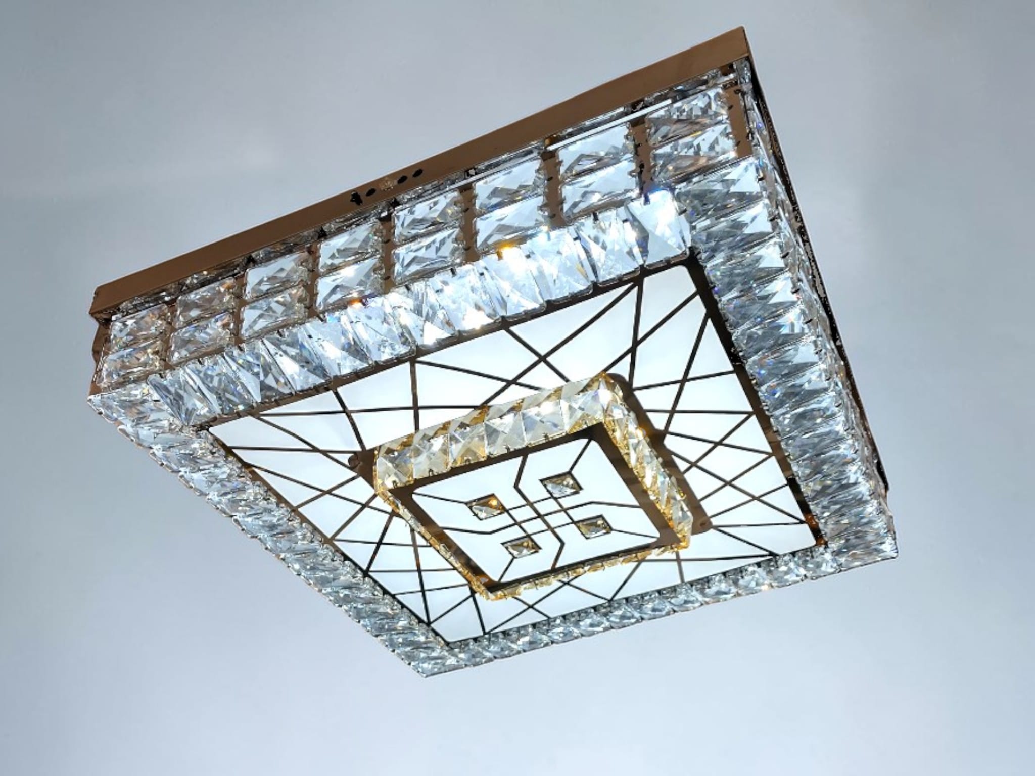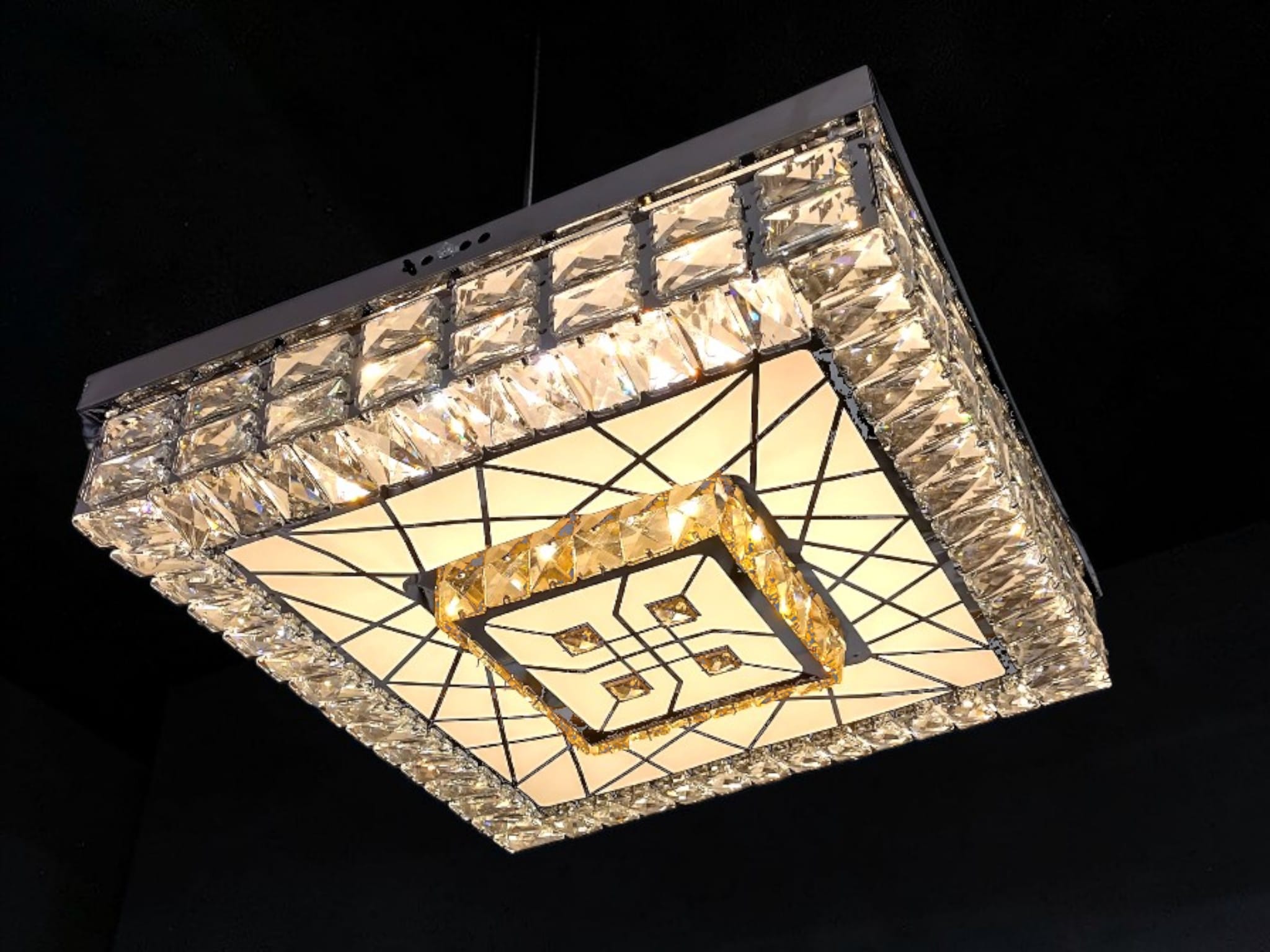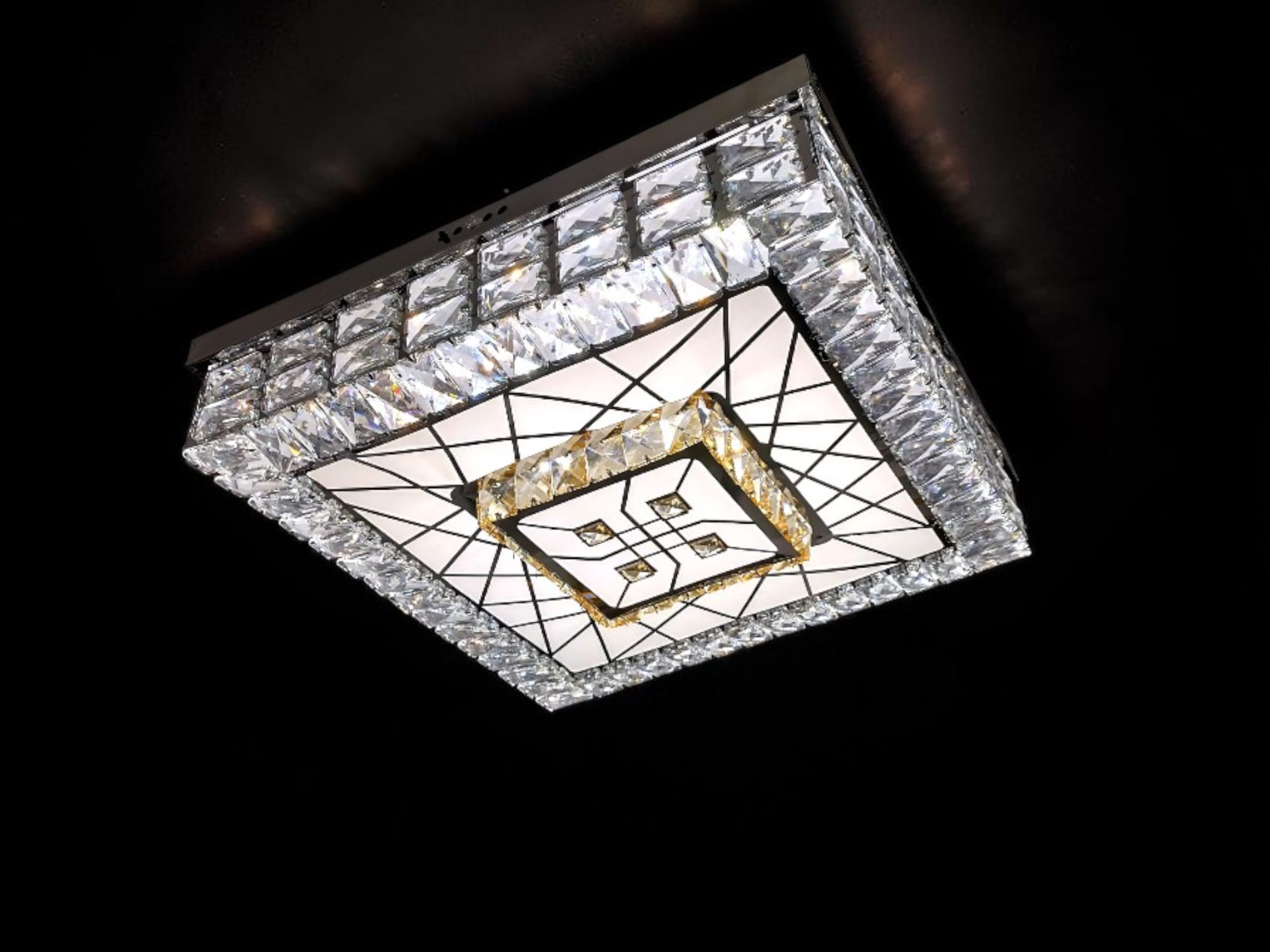 Geometriskt Center: I lampans mitt finns ett intrikat, vävt, geometriskt mönster (som påminner om flätade oändlighetstecken) av klara kristaller. Detta centrala panel fungerar som ett estetiskt galler och ger lampan en unik 3D-effekt.