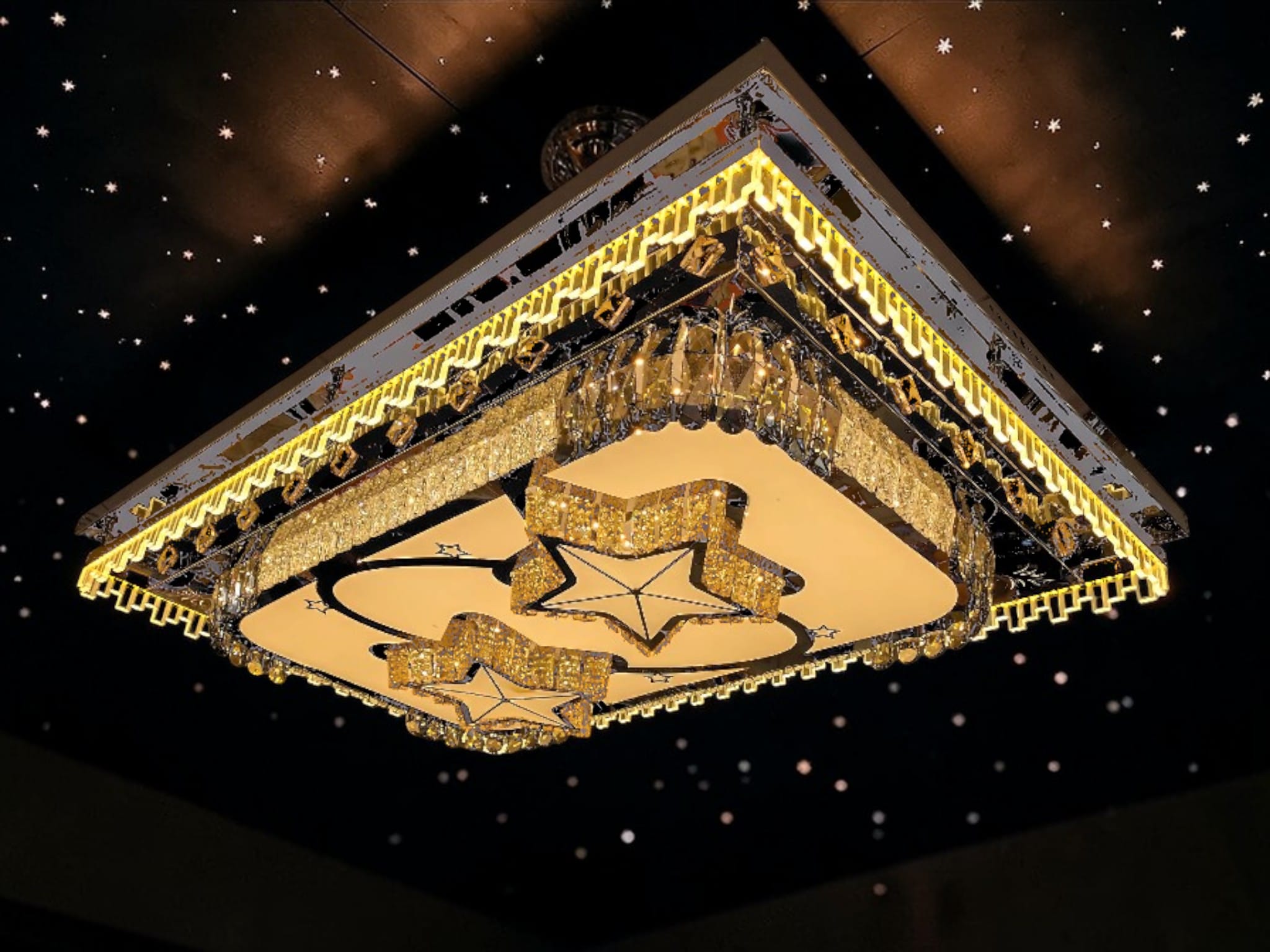 Kristallinramning i flera nivåer: Armaturen kantas av flera rader av fasettslipade K9-kristaller som bryter ljuset i tusentals riktningar och skapar ett magiskt mönster i taket.