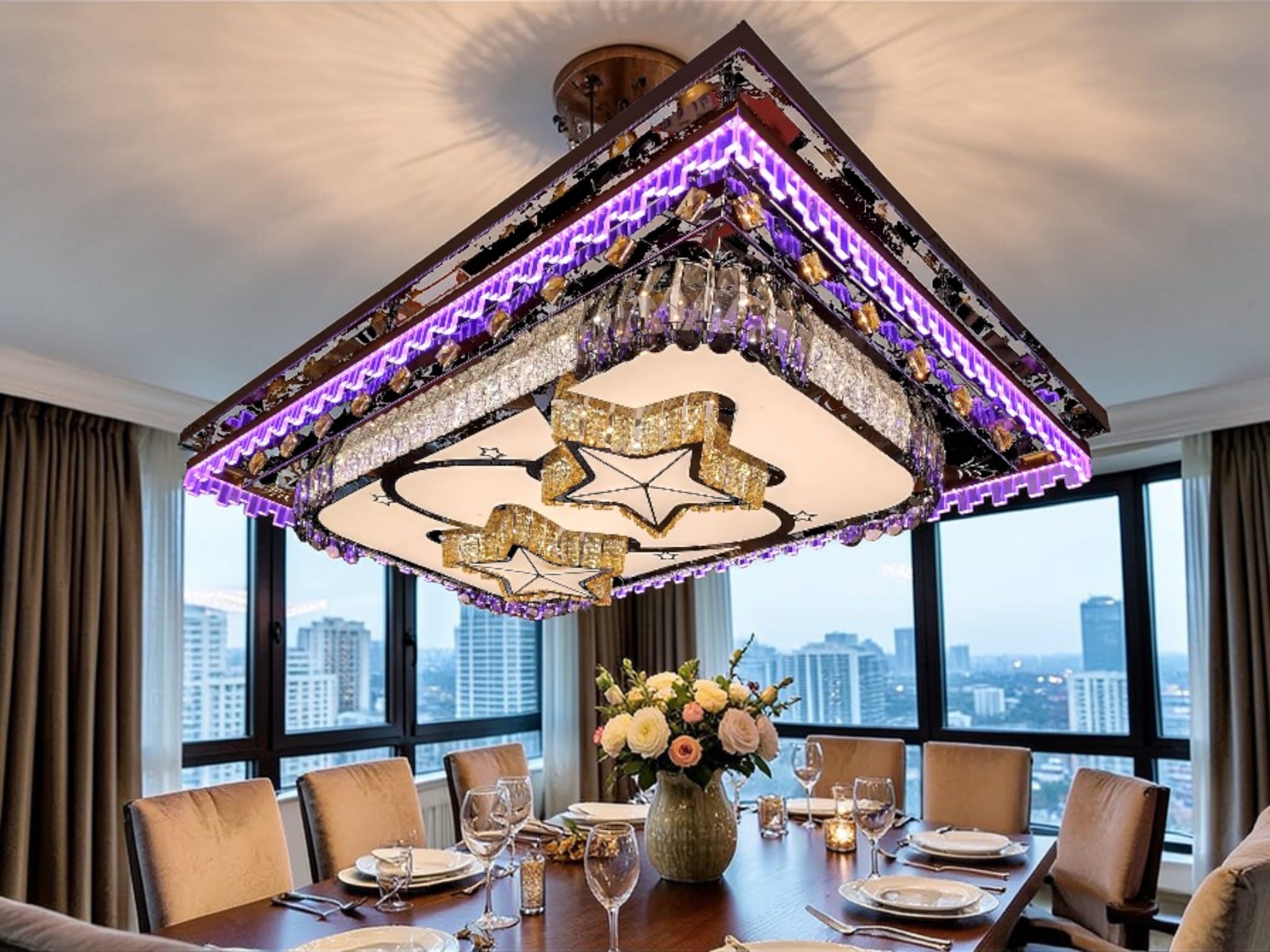 Celestia är inte bara en taklampa; det är en storslagen installation designad för att förvandla ditt rum till en lyxig galax. Med en längd på över 1,2 meter är denna rektangulära plafond skapad för att dominera stora ytor och sprida en atmosfär av både exklusivitet och lekfullhet.