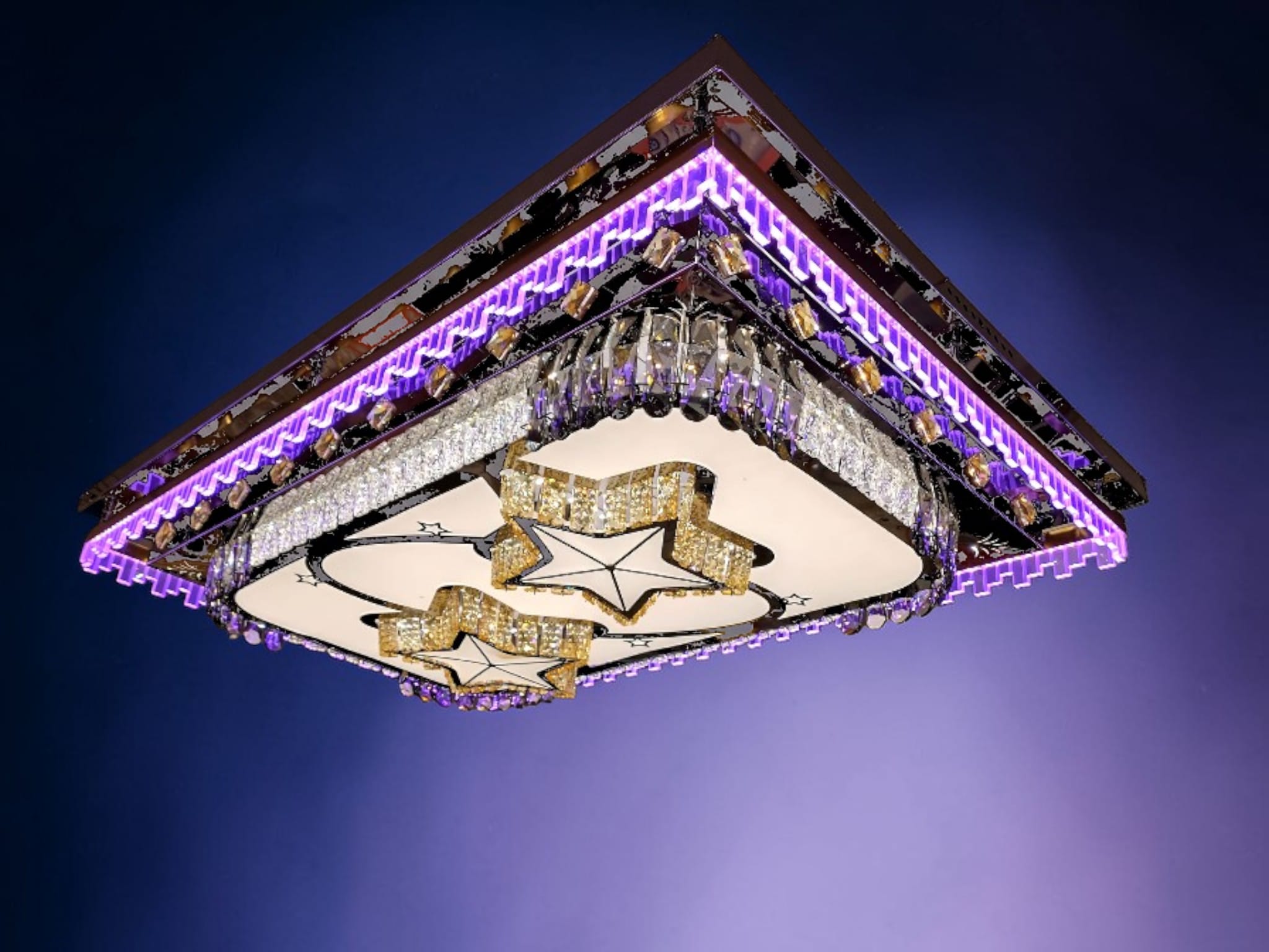Dubbla centerstjärnor: Lampans hjärta består av två stora, lysande stjärnor inramade av bärnstensfärgade kristaller som ger ett varmt och karaktäristiskt sken.