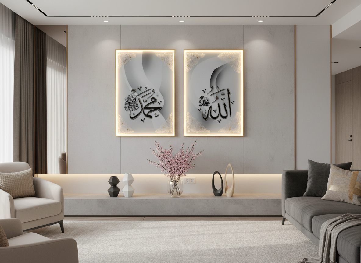 Skapa en komplett och fridfull atmosfär i ditt hem med Divine Light Duo 3D. Detta matchande set om två tavlor är en hyllning till de mest centrala namnen inom islamisk tro. Genom att kombinera minimalistisk estetik med kraftfull 3D-teknologi och mjuk belysning, erbjuder detta set en tidlös elegans som lyfter hela rummets karaktär. Det är den perfekta lösningen för dig som söker en balanserad och storslagen väggdekoration.