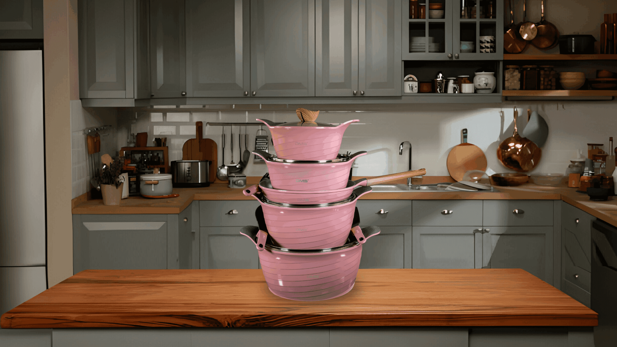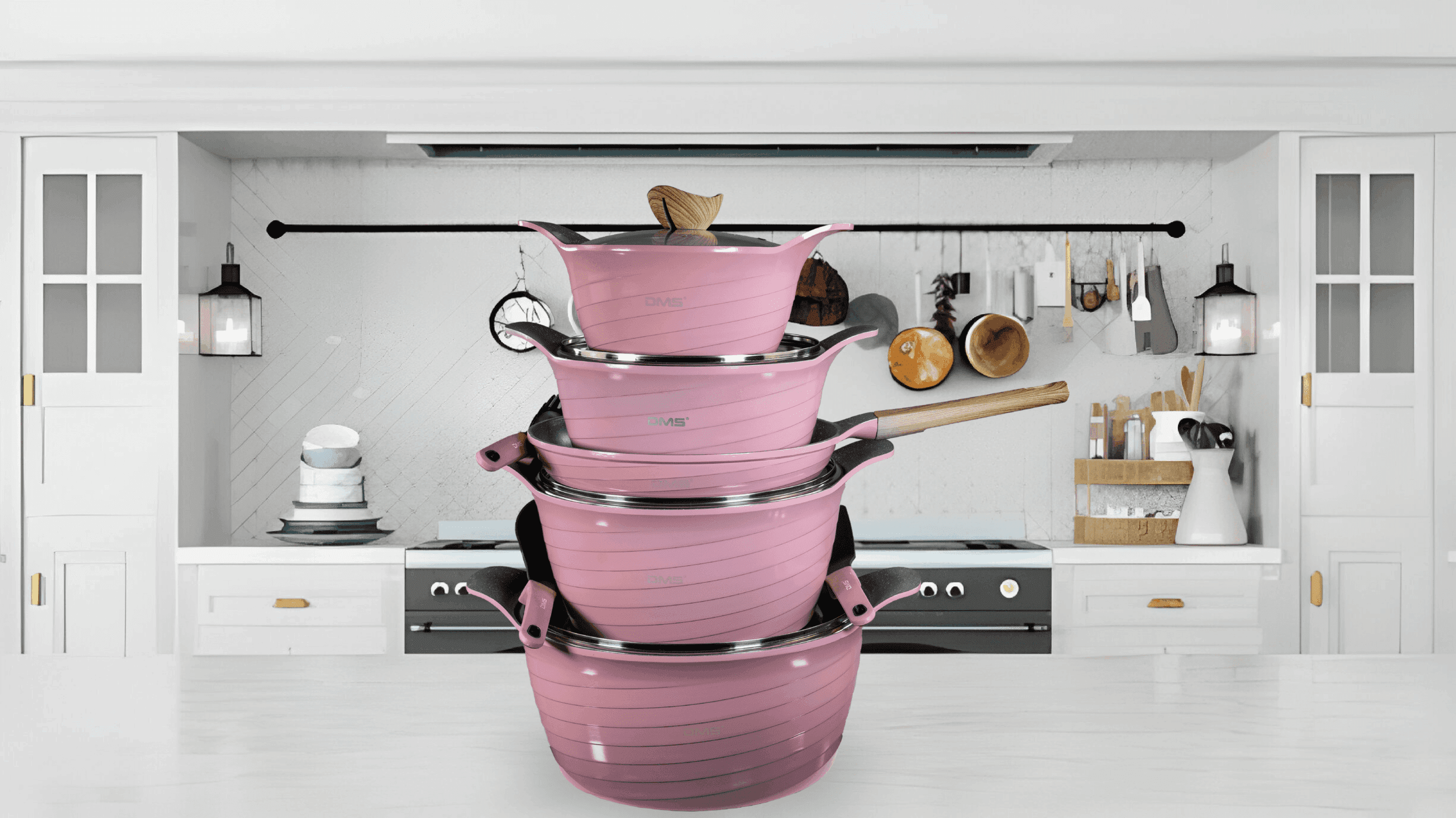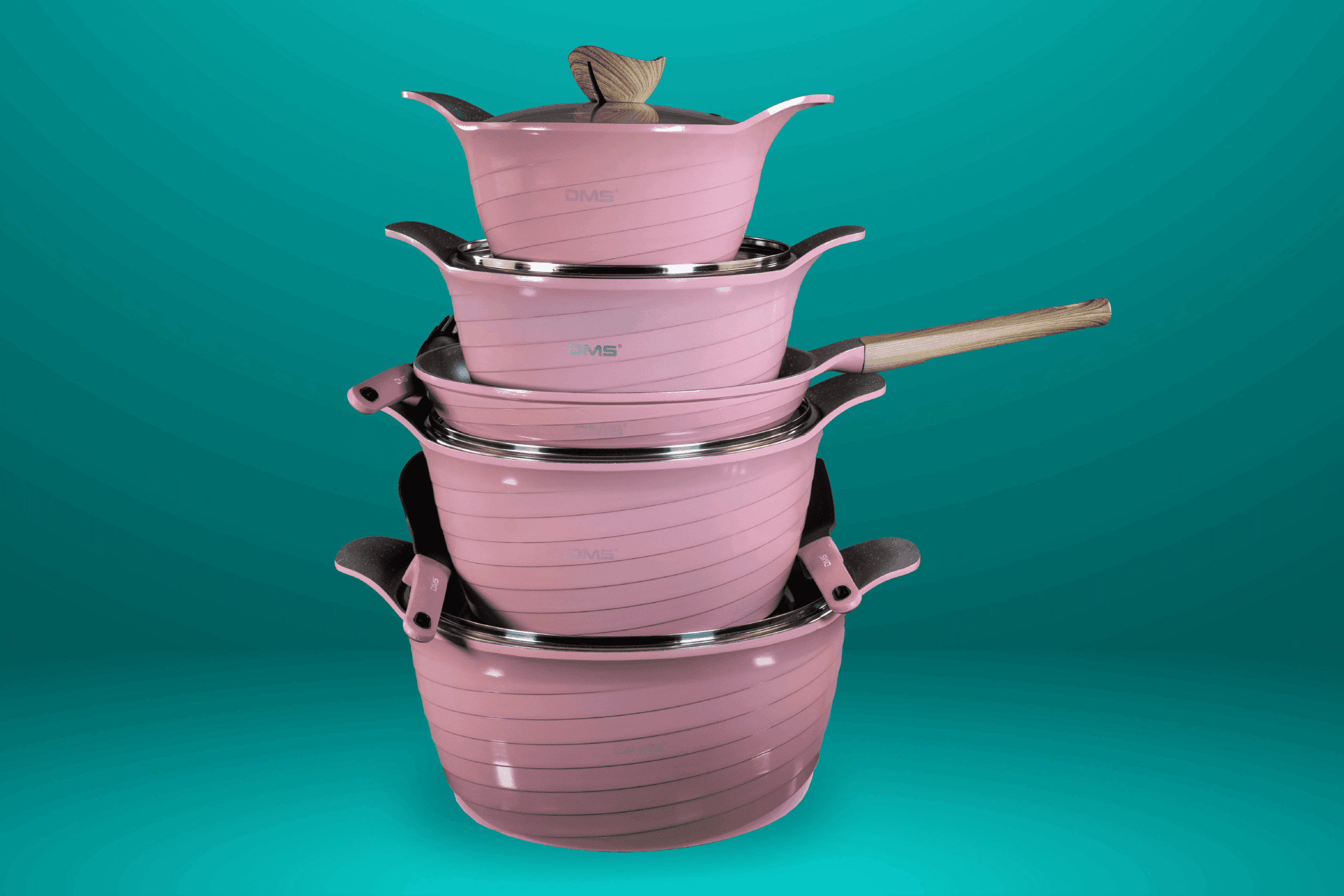 Kökskärl i 16 delar av aluminium med marmorbeläggning.