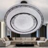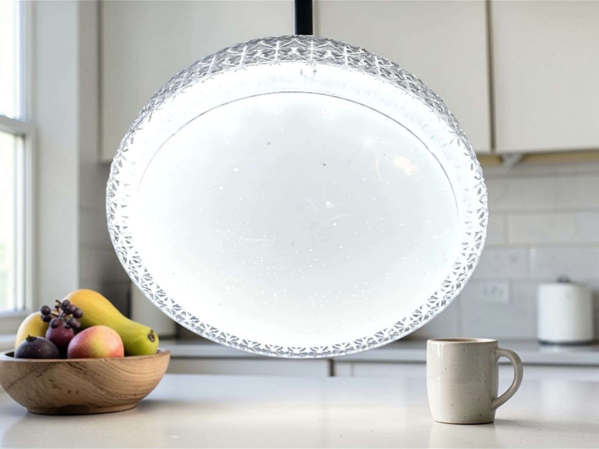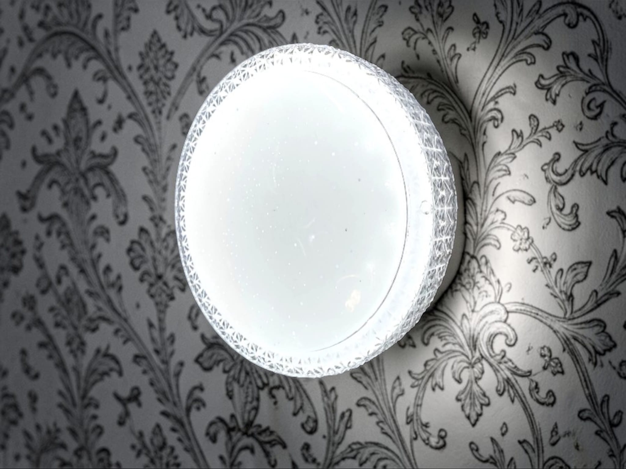 Kristallmönstrad ytterring: Lampans kant har en fasettslipad struktur som påminner om klassiskt kristallglas. Denna ram fångar upp ljuset och skapar vackra reflektioner längs taket eller väggen.