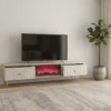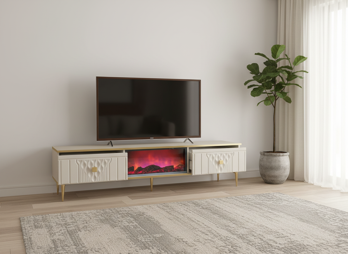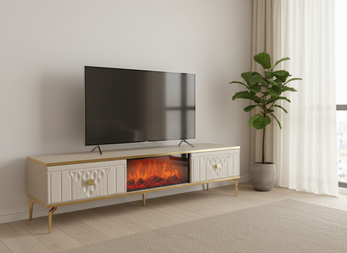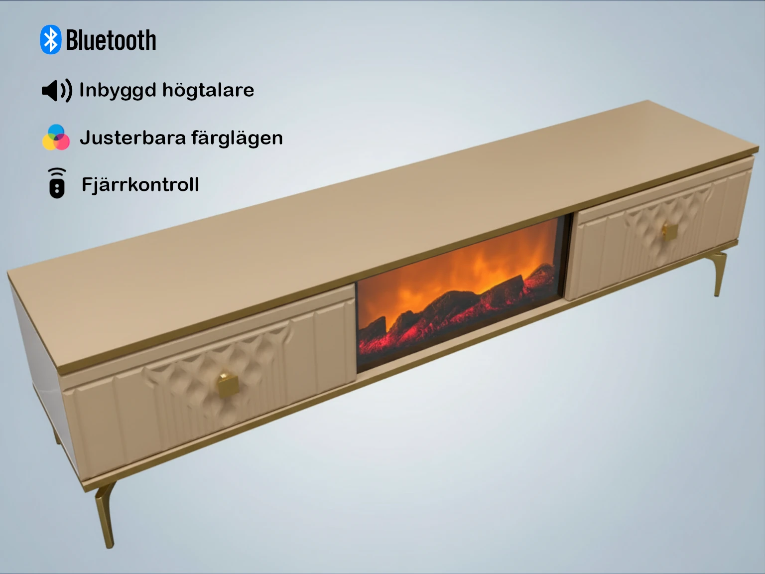 3-i-1 funktion: Kombinerar TV-möbel, stämningsfull eldstad och ljudsystem.