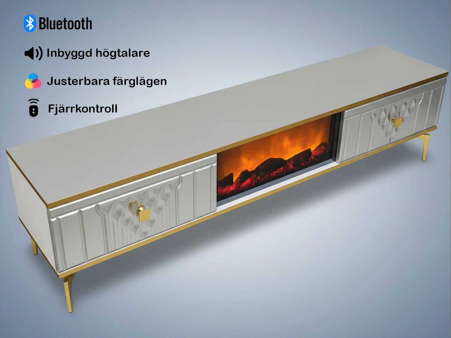 Upplev modern lyx med Göteborg TV-bänk (180 cm) i silver. Exklusiv design med skulpterade fronter, inbyggd elkamin, Bluetooth-högtalare och silverdetaljer. 1 års garanti. Köp här!