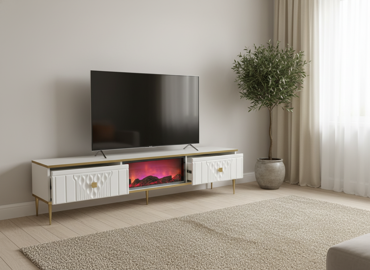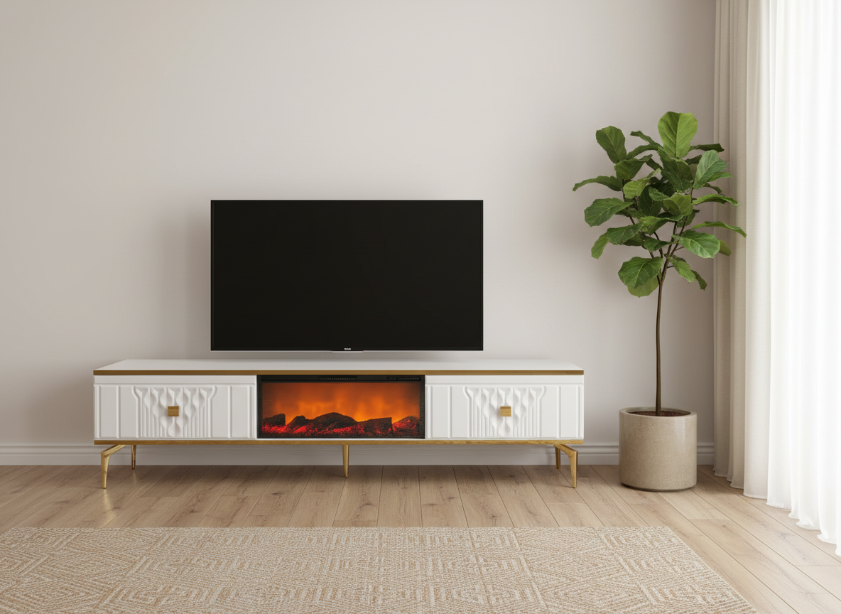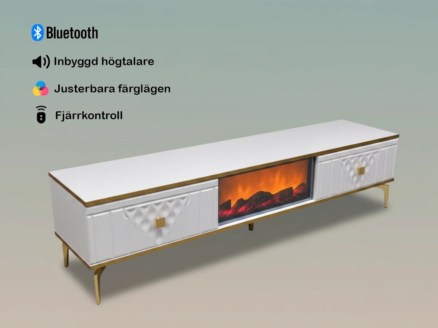 3-i-1 funktion: Kombinerar TV-möbel, stämningsfull eldstad och ljudsystem.