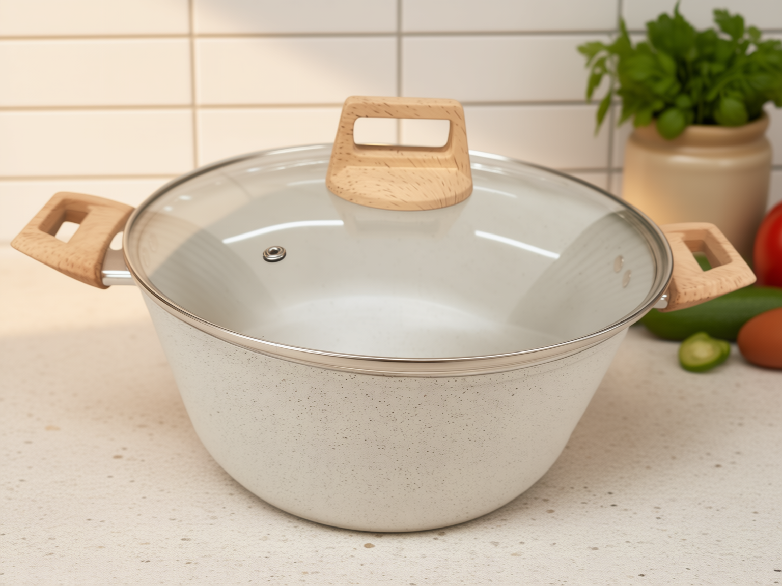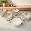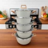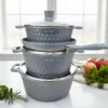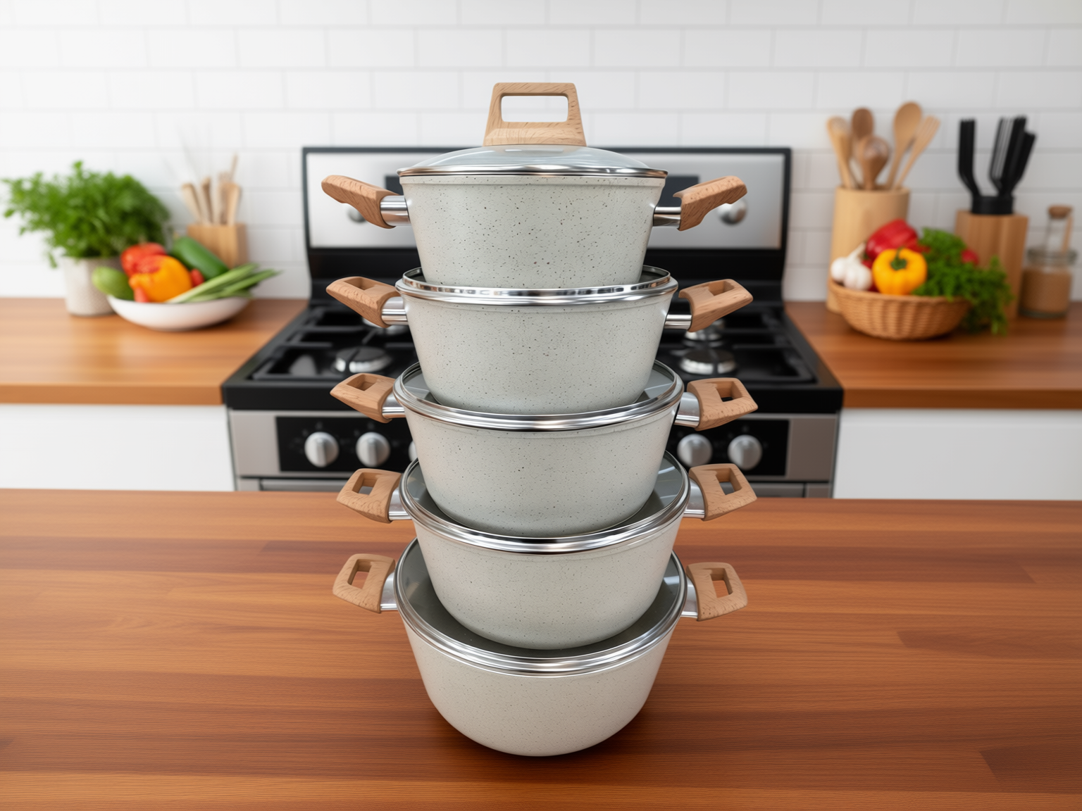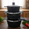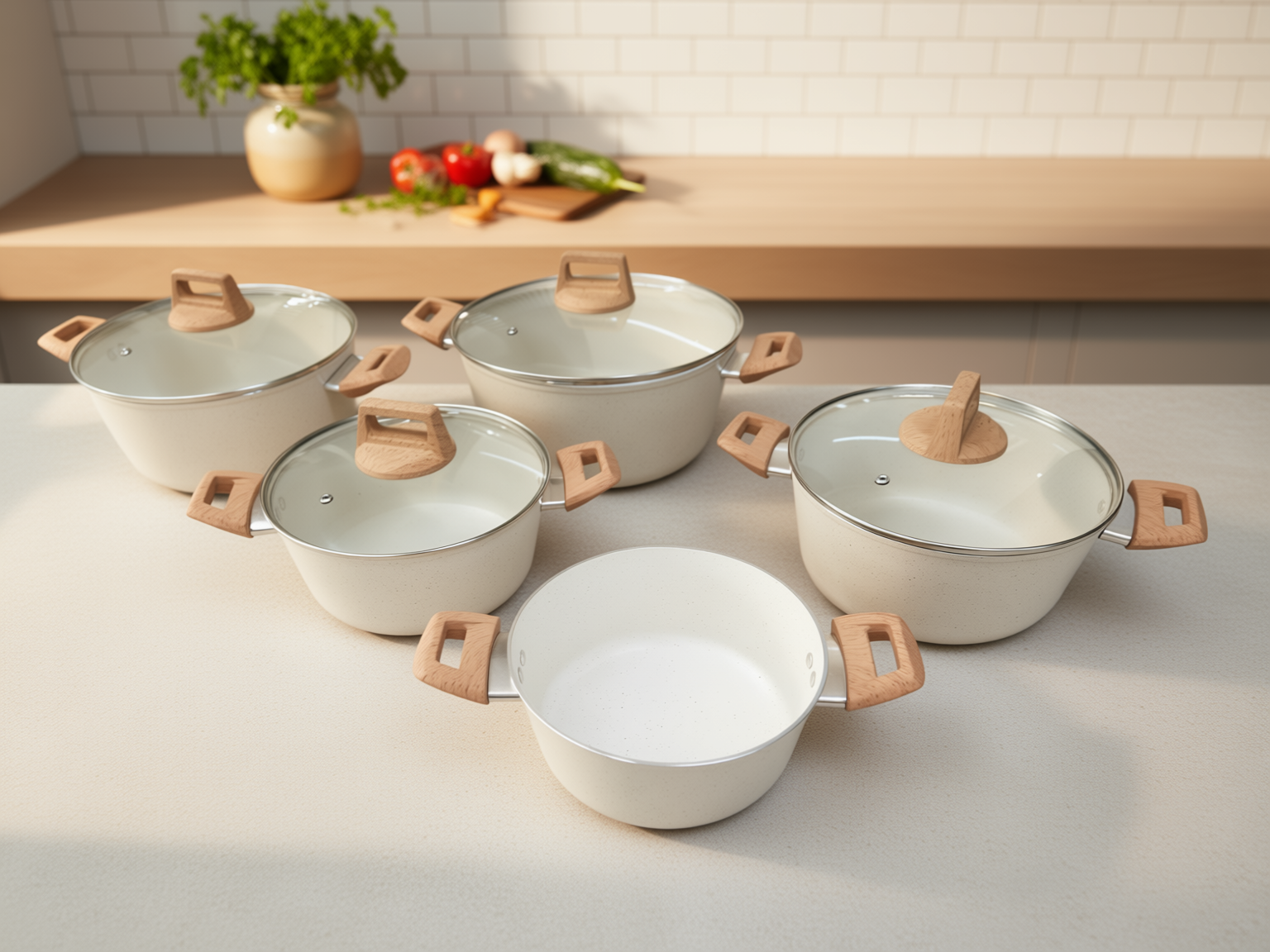 Ett komplett och lyxigt set i 10 delar (5 grytor + 5 lock) med en helt PFOA-fri granitbeläggning. Kärlen är tillverkade för hälsosam matlagning med minimalt matfett och är kompatibla med de flesta spistyper, såsom gas, el och keramik.