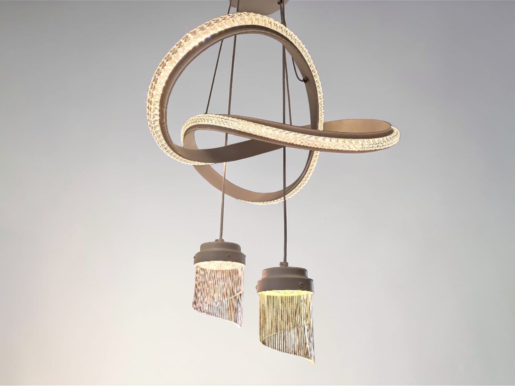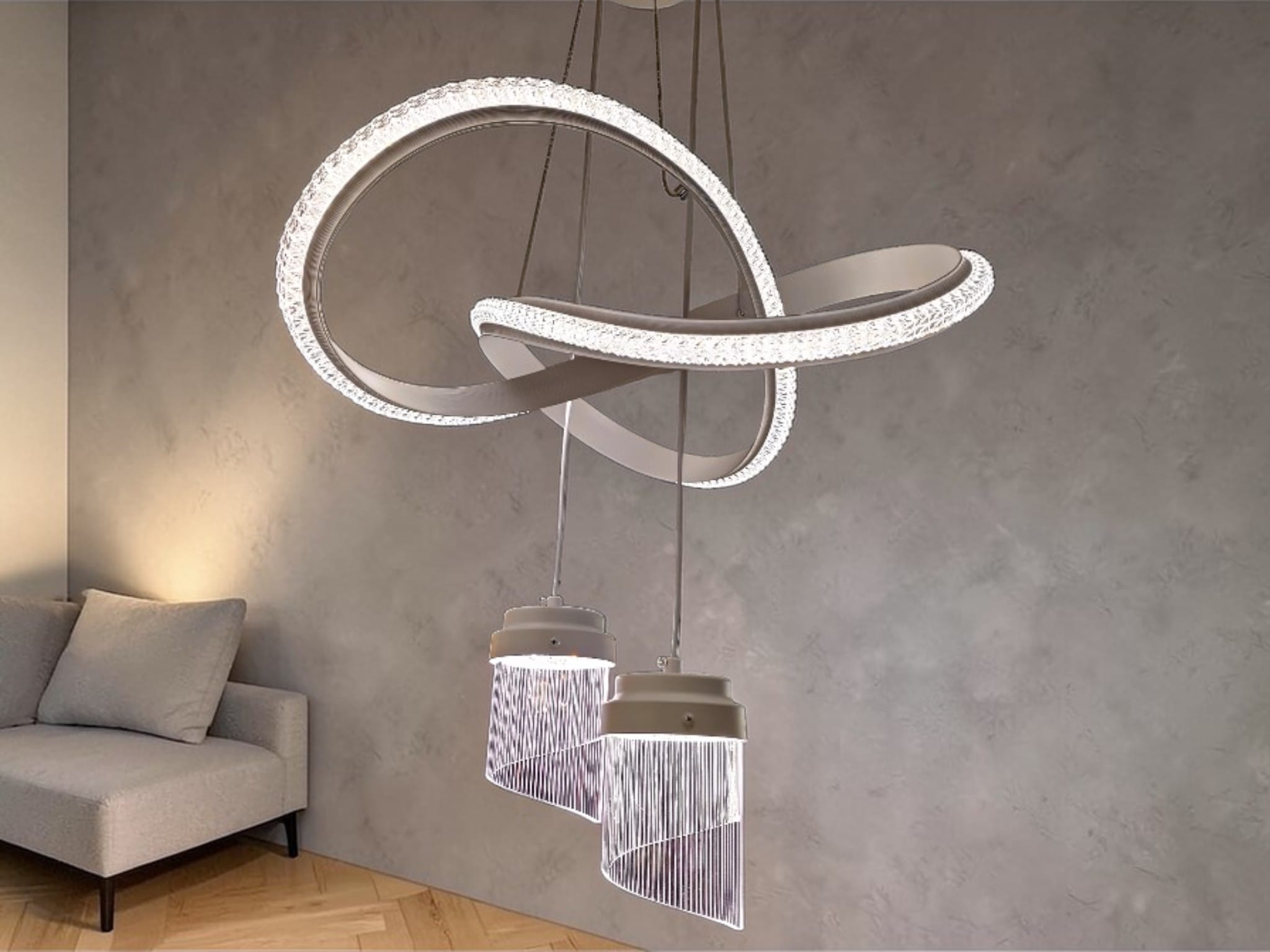 Låt Infinity bli rummets lysande hjärta. Denna takpendel är mer än bara belysning; det är ett modernt konstverk som kombinerar futuristiska former med en sofistikerad finish. Designen består av sammanflätade, vita ringar klädda i en gnistrande LED-struktur som påminner om krossad kristall.