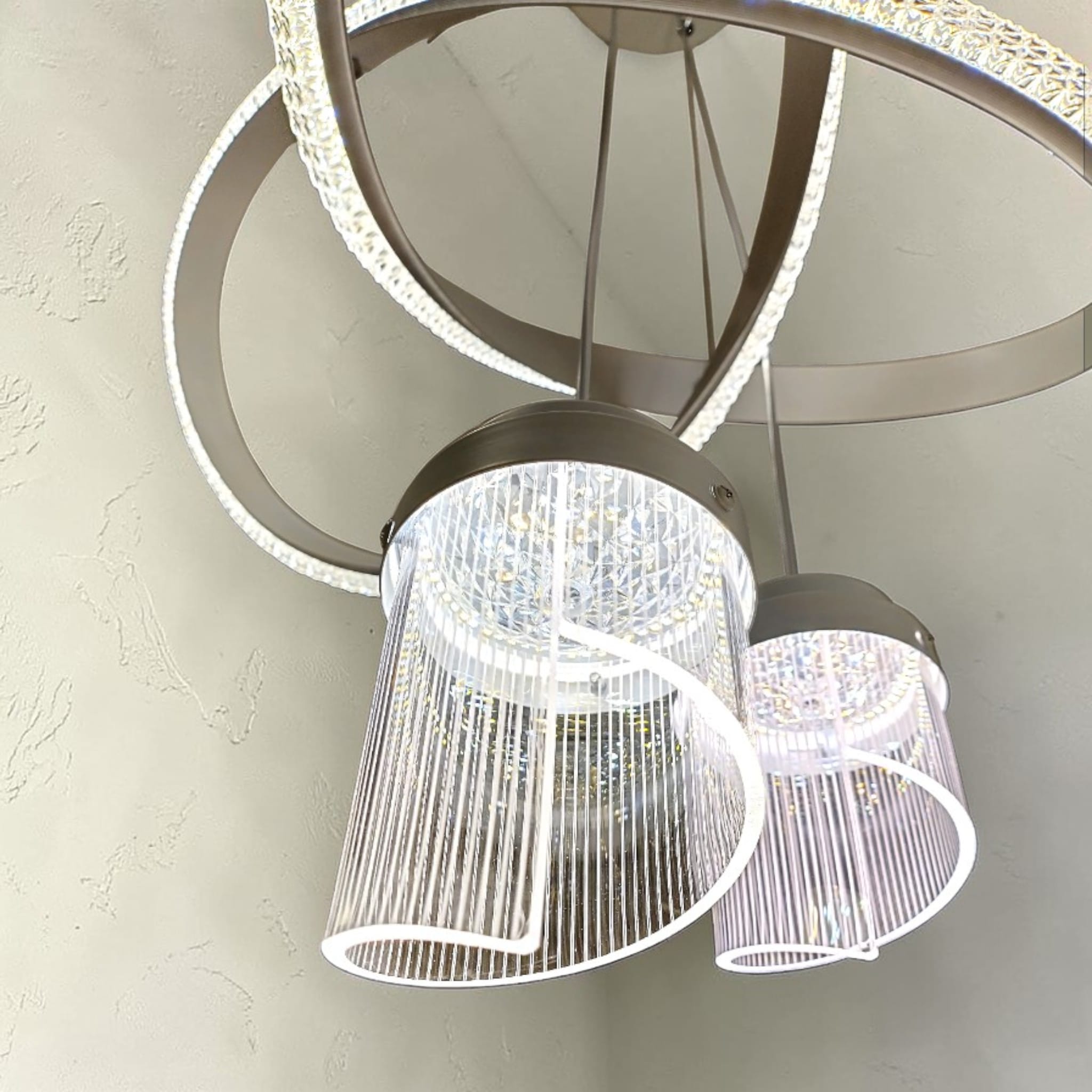 Från den orbitala stommen hänger två eleganta, cylinderformade pendlar med en vacker räfflad struktur. Dessa ger ett riktat men ändå mjukt ljus nedåt, vilket skapar en perfekt balans mellan dekorativt sken och funktionell belysning.