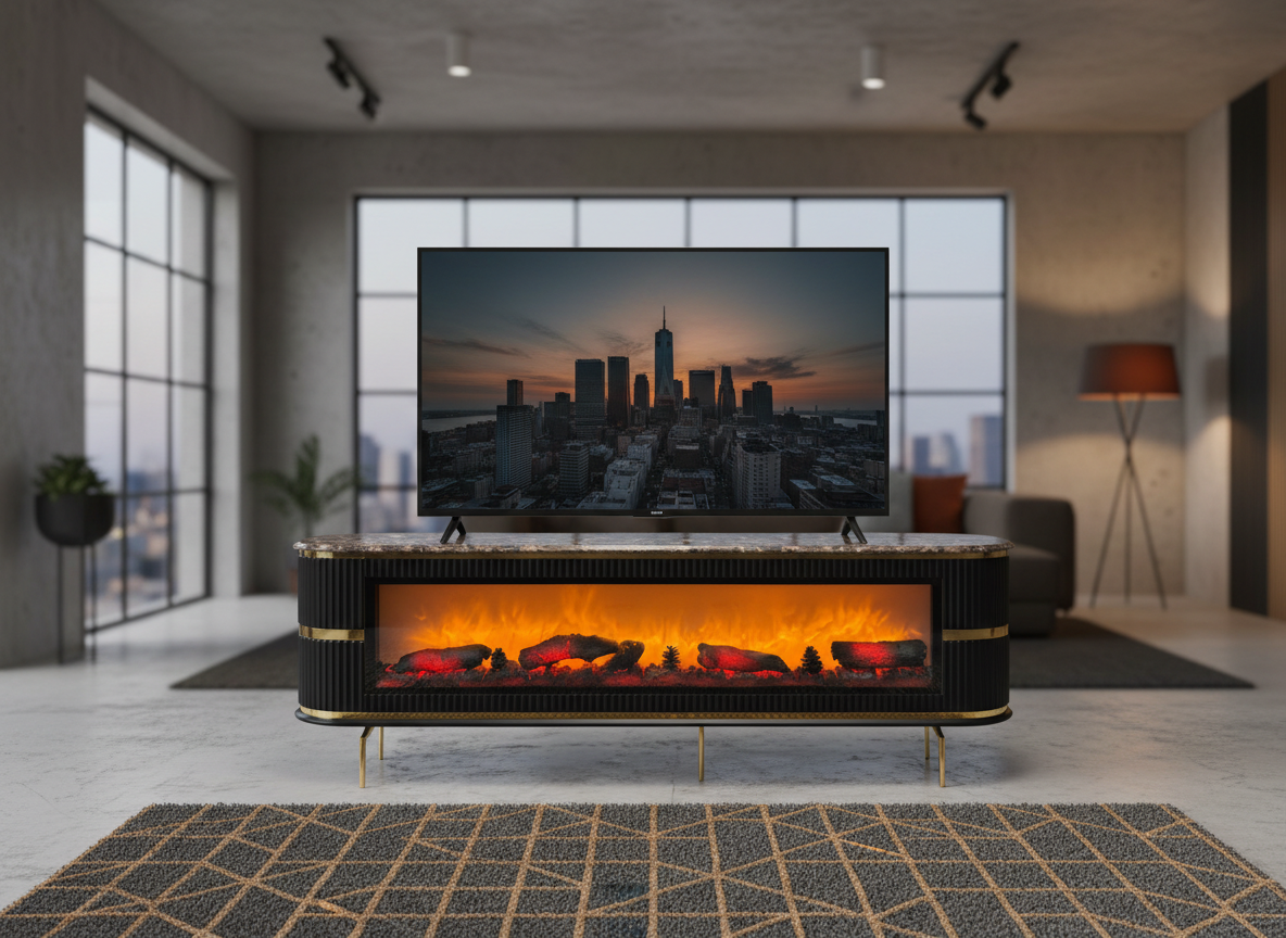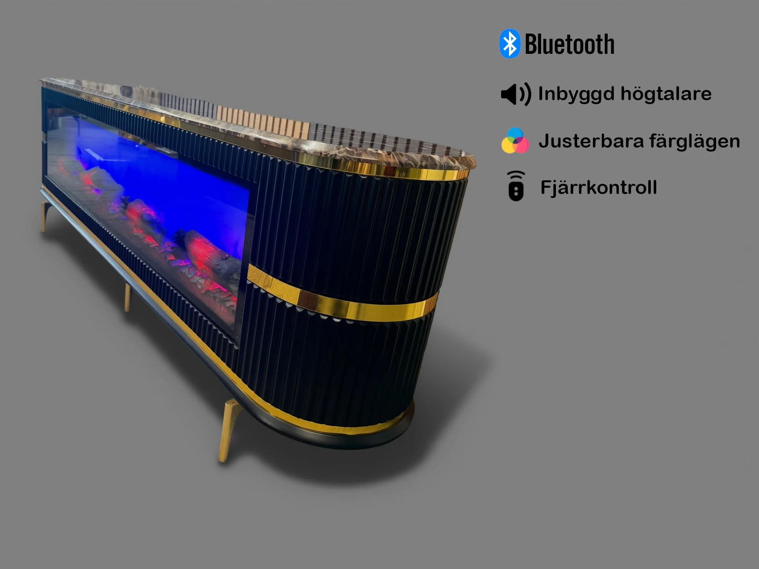 Förvandla ditt hem med Köpenhamn TV-bänk (200 cm). Exklusiv design med inbyggd elkamin, Bluetooth-högtalare och marmormönstrad toppskiva. 1 års garanti ingår. Köp här!