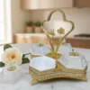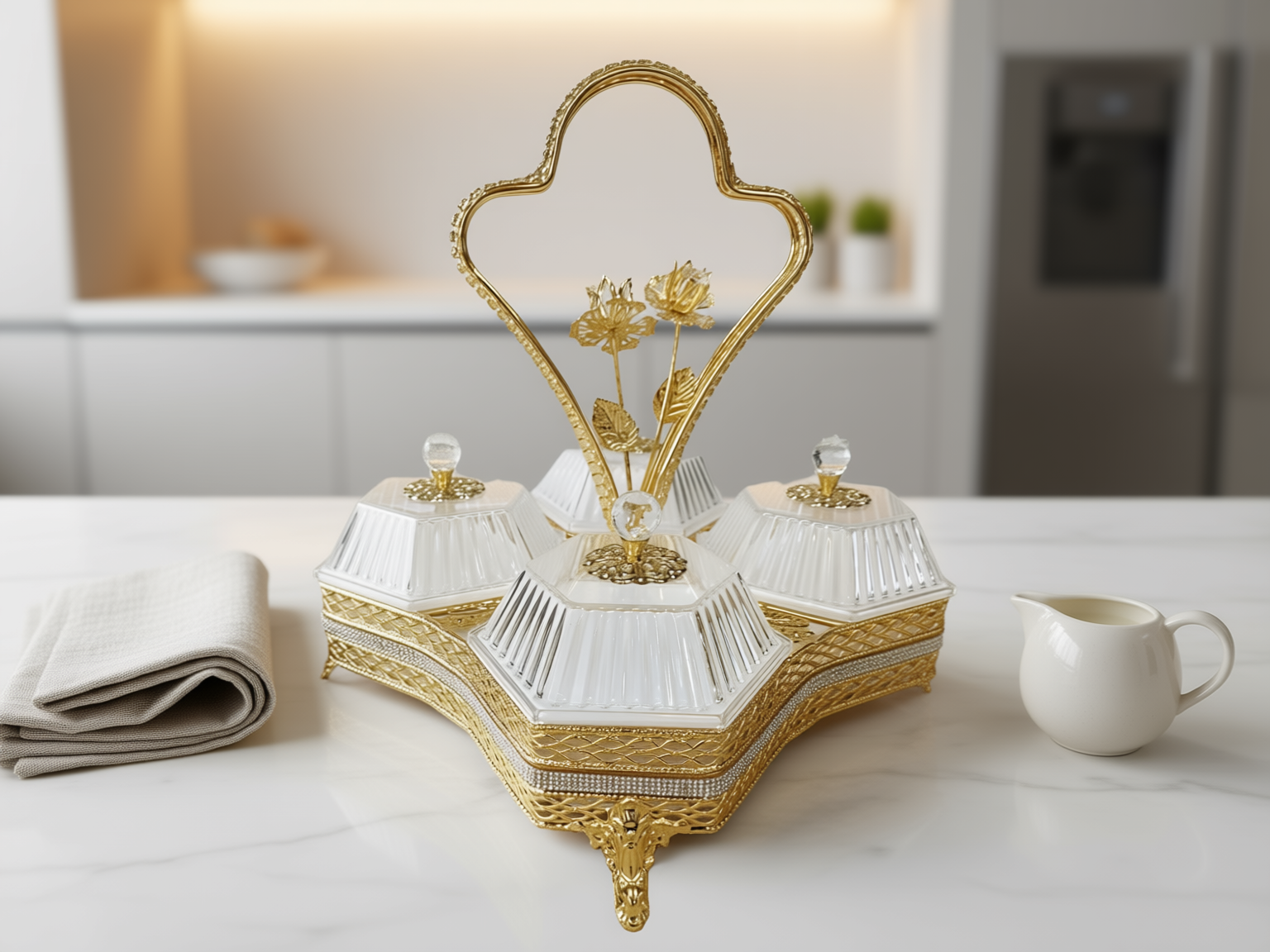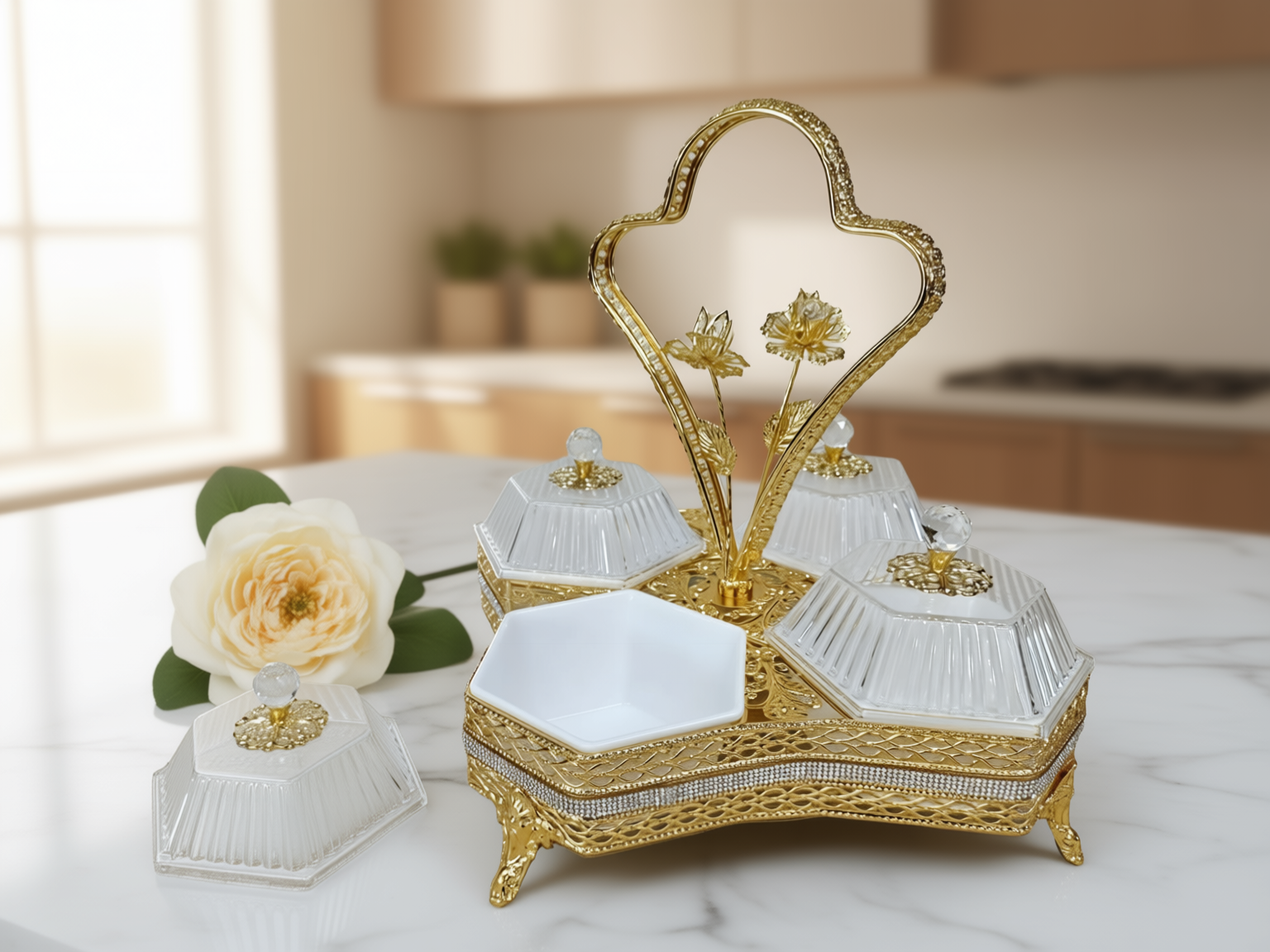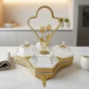 Ett magnifikt serveringsset (höjd 32 cm) bestående av fyra individuella skålar i fasetterat kristallglas monterade i en guldpläterad ställning. Setet kännetecknas av sitt intrikata filigranarbete och ett unikt roshandtag, vilket gör det till en omedelbar mittpunkt vid varje bjudning.