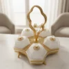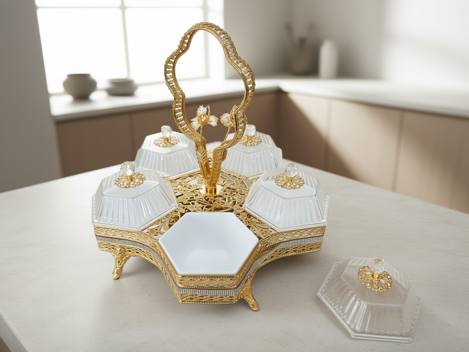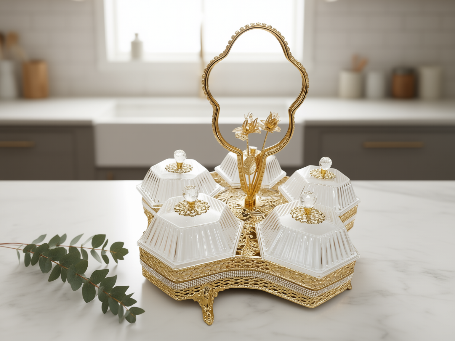 Förvandla varje servering till ett kungligt tillfälle med Rokoko Guld. Detta magnifika serveringsset, nu i en praktfull guldförgylld variant, som för tankarna till kungliga hov och barockens överdåd. Det är en hyllning till det finaste guldsmedskonsten, där intrikata filigranmönster möter en varm, inbjudande glöd. Setet kröns av ett graciöst, bågformat handtag, prytt med intrikata filigranmönster och toppat av en detaljrik rosknopp. De fem individuella kristallskålarna, med sina gnistrande fasetteringar, vilar stadigt i sina filigranmönstrade guldhållare och toppas av eleganta lock med matchande gyllene blomknoppar och kristalldetaljer. Den varma guldfärgen skapar en fantastisk kontrast mot kristallens renhet och gör detta set till en oemotståndlig juvel på det dukade bordet.