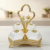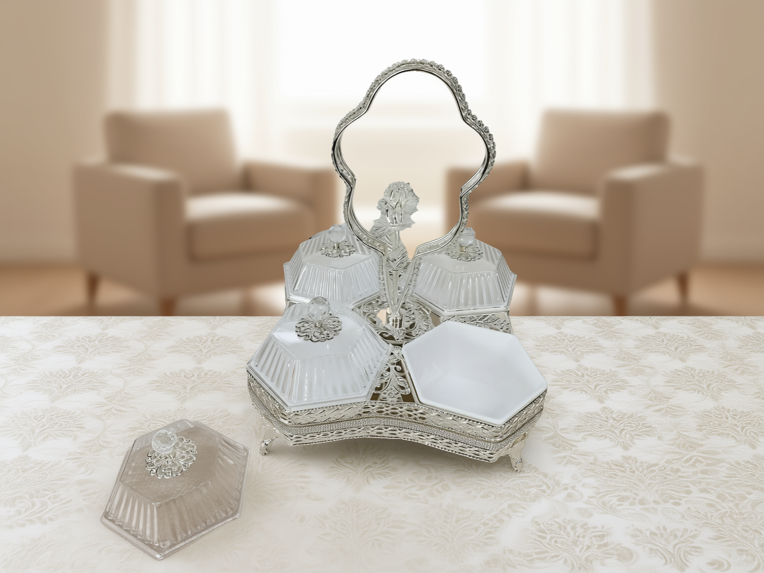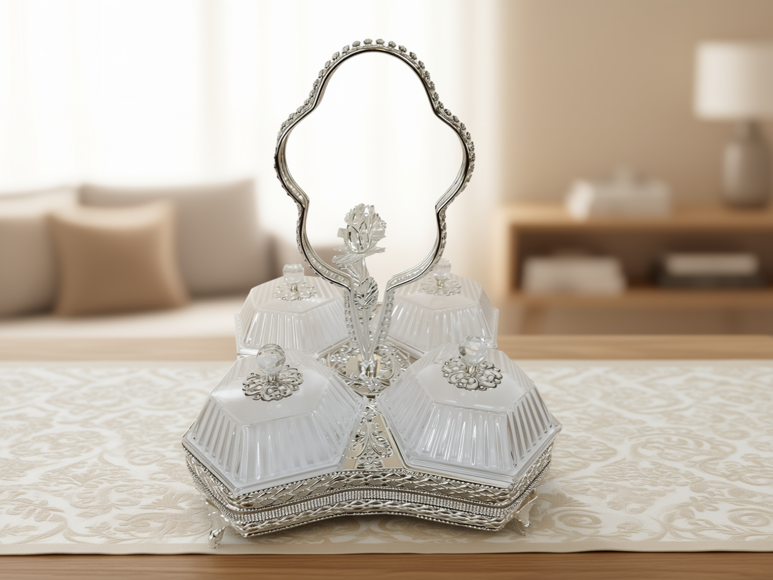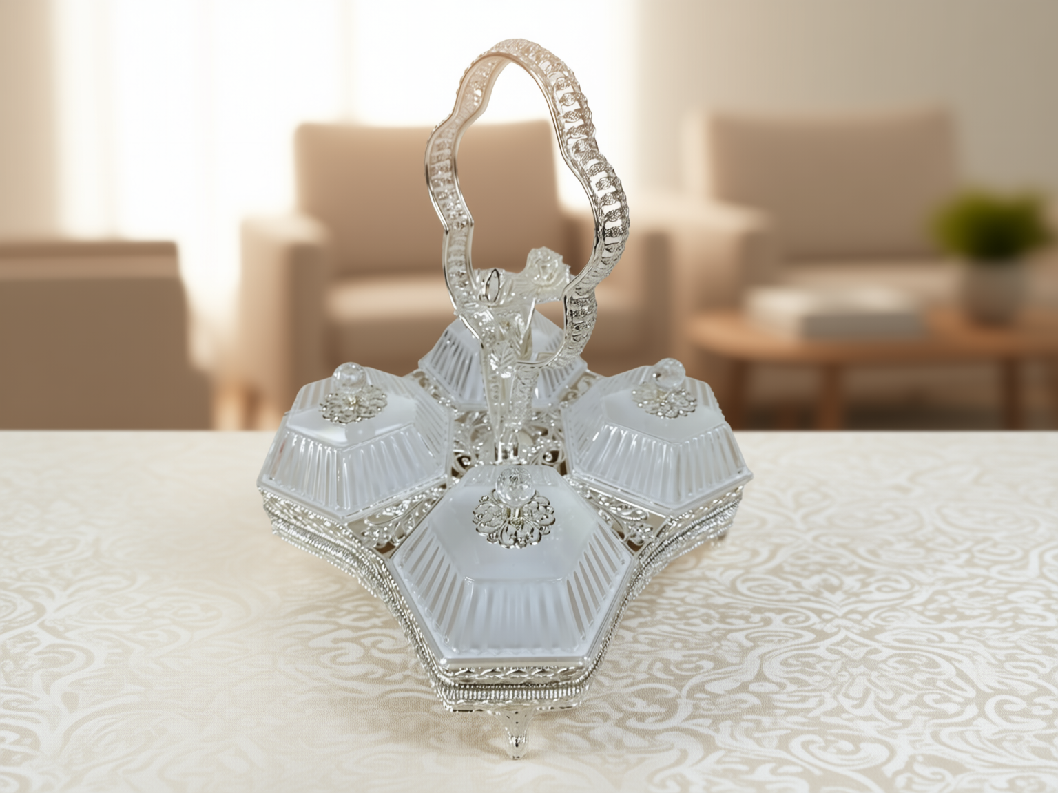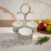 Ett magnifikt serveringsset (höjd 32 cm) bestående av fyra individuella skålar i fasetterat kristallglas monterade i en silverpläterad ställning. Setet kännetecknas av sitt intrikata filigranarbete och ett unikt roshandtag, vilket gör det till en omedelbar mittpunkt vid varje bjudning.
