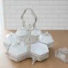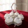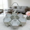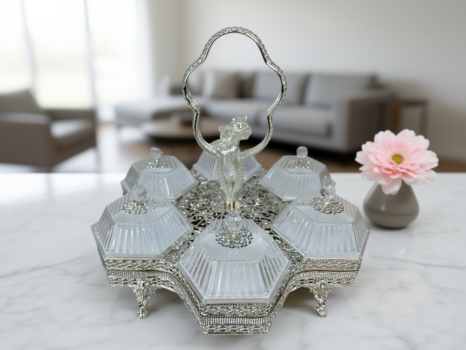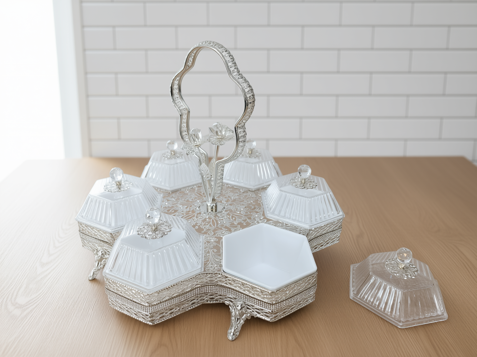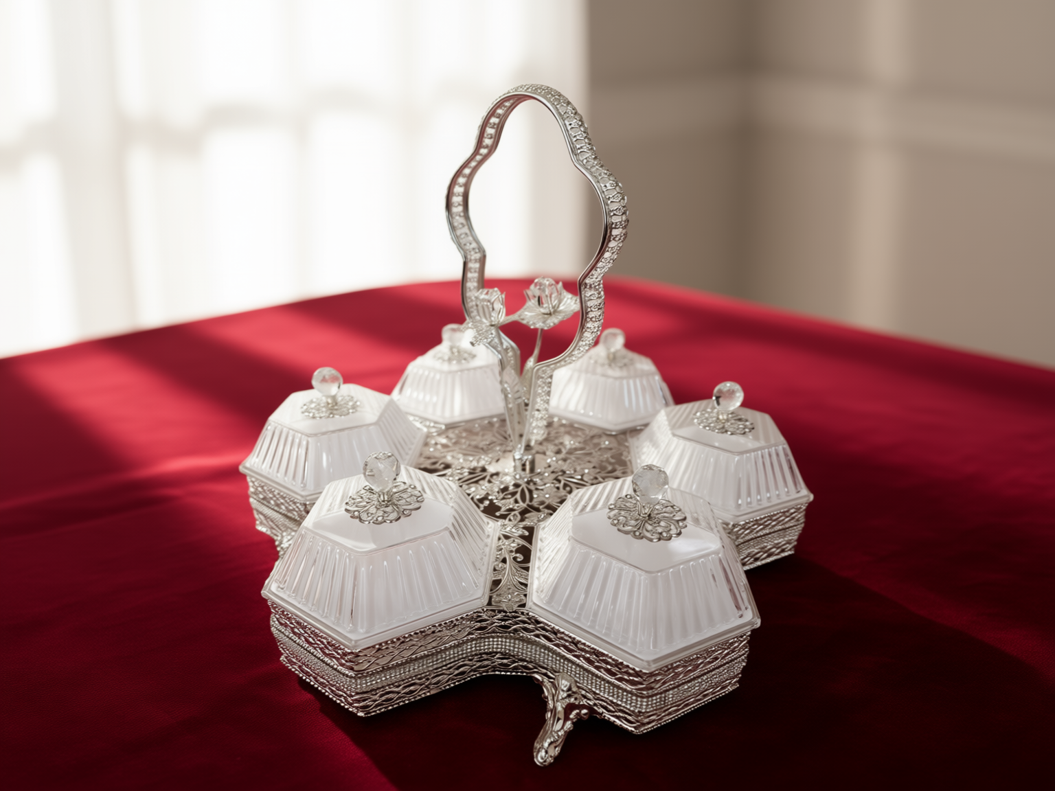 Ett magnifikt serveringsset (höjd 32 cm) bestående av sex individuella skålar i fasetterat kristallglas monterade i en silverpläterad ställning. Setet kännetecknas av sitt intrikata filigranarbete och ett unikt roshandtag, vilket gör det till en omedelbar mittpunkt vid varje bjudning.