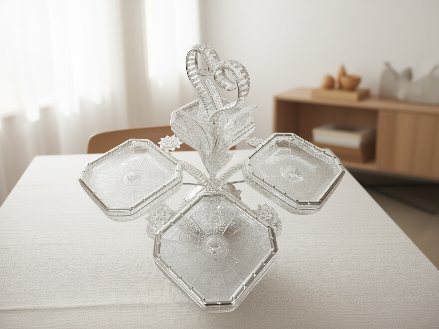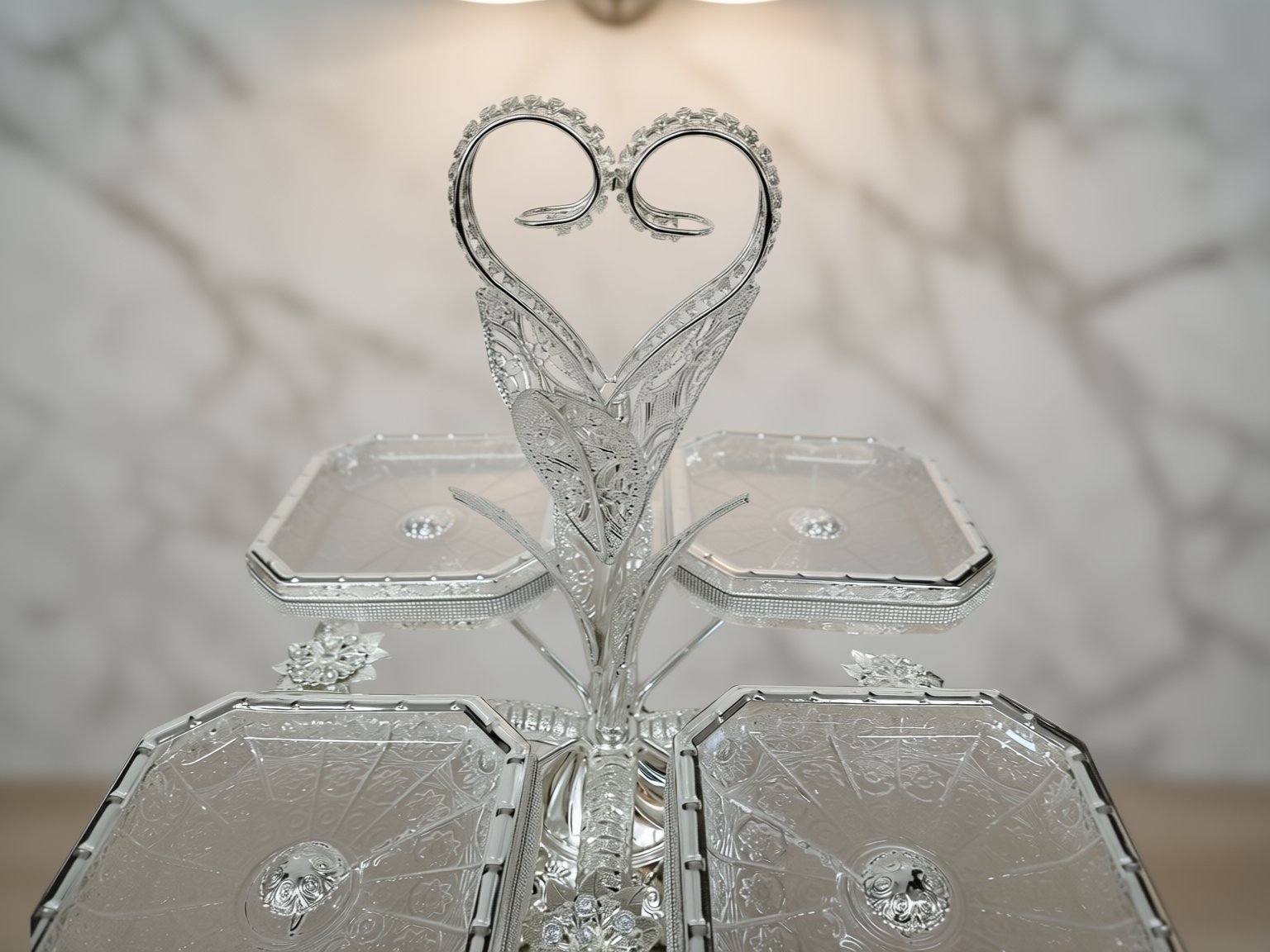 Förgyll festen med Silverhjärta – ett magnifikt serveringsfat i silver och glas med romantisk hjärtdekor. Perfekt för bröllop, bakverk och lyxig servering. Beställ här!
