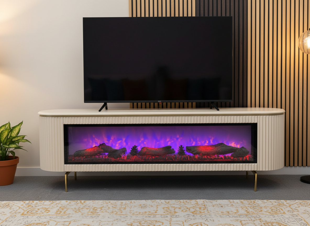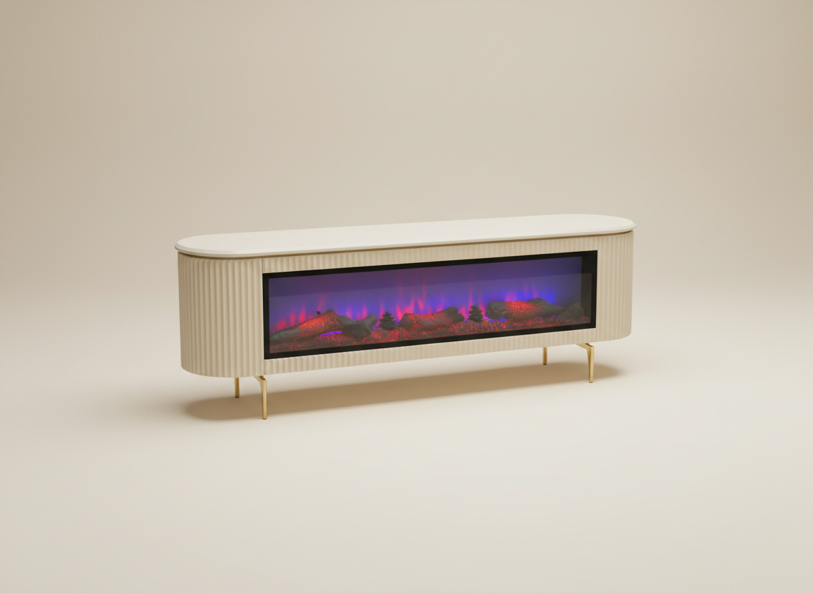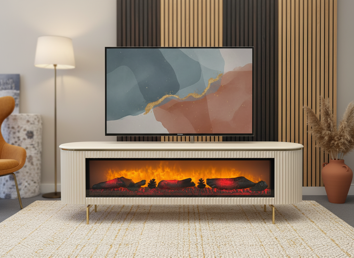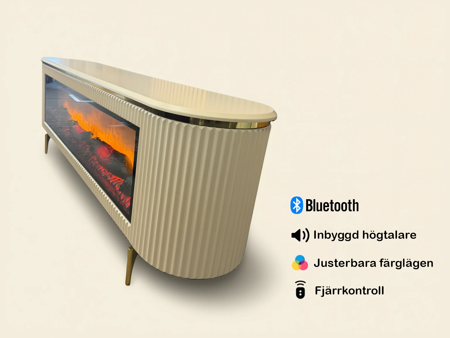 3-i-1 funktion: Kombinerar TV-möbel, stämningsfull eldstad och ljudsystem i en och samma enhet.