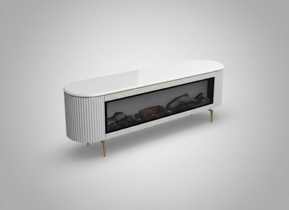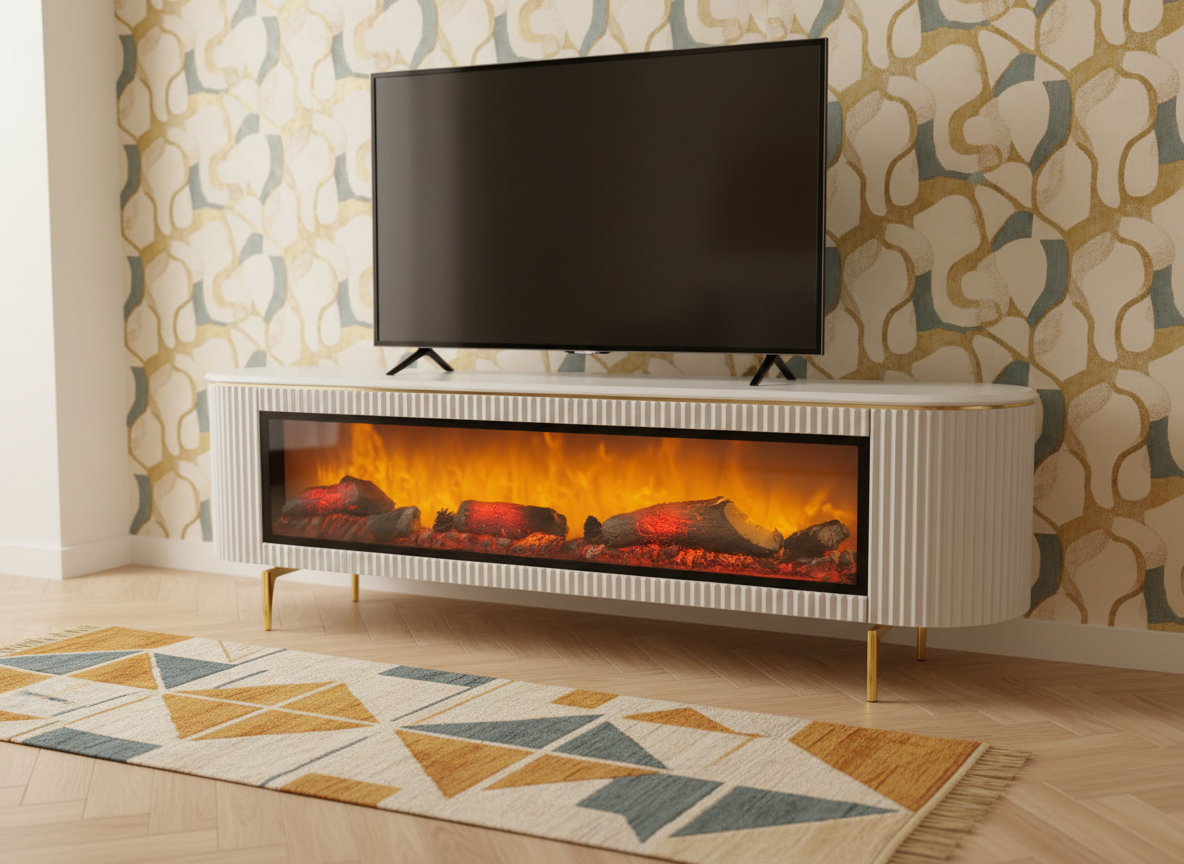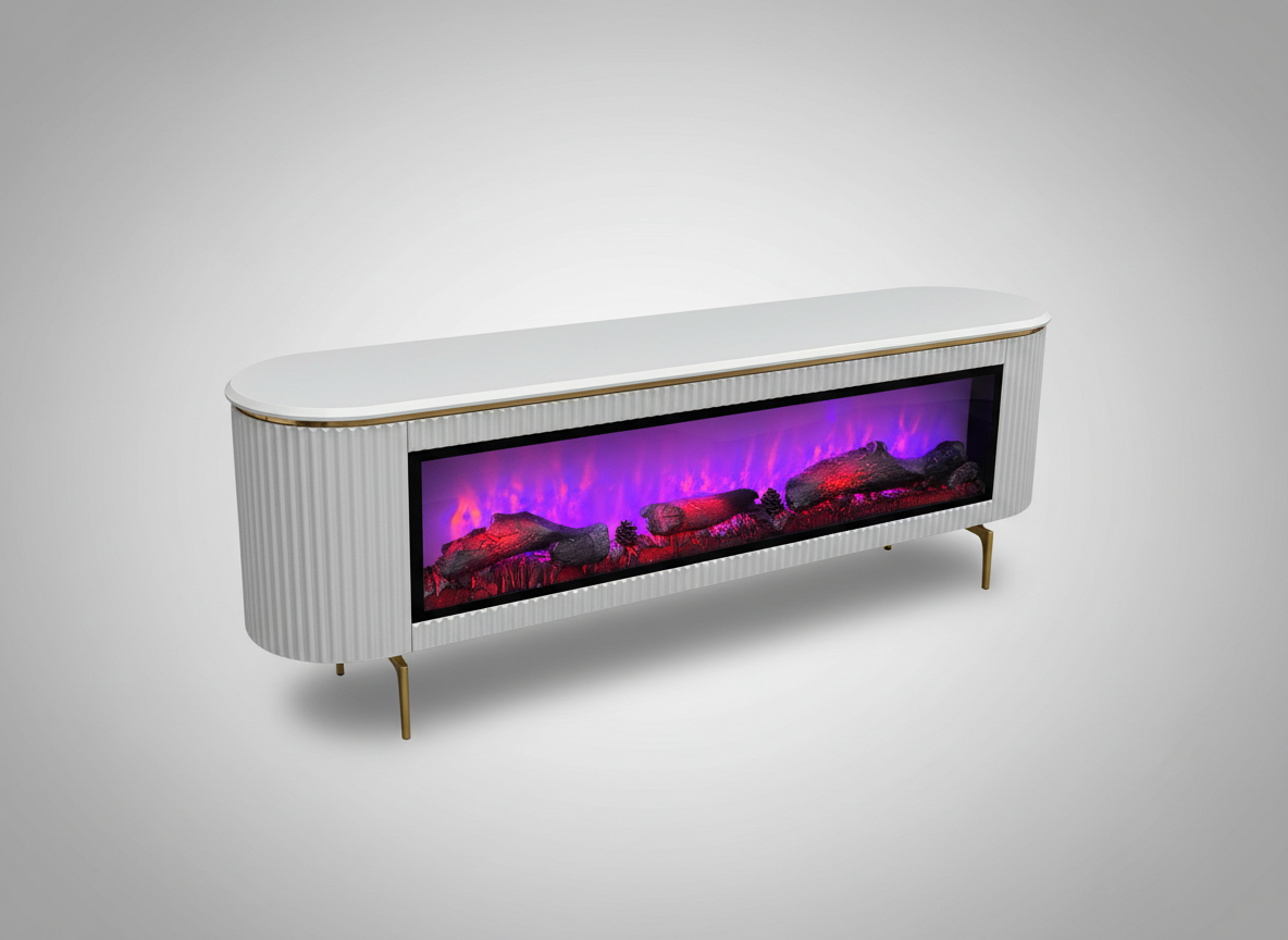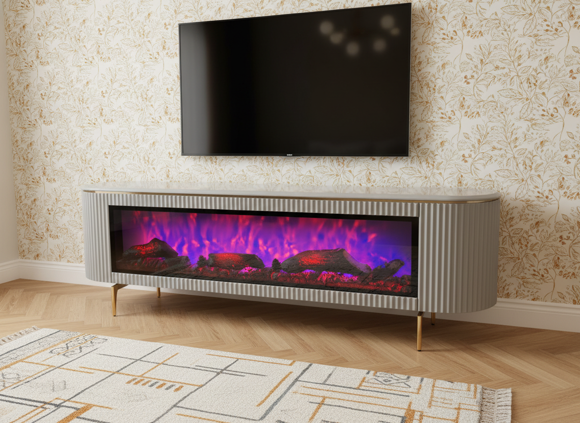 3-i-1 lösning: En kombinerad TV-möbel, stämningsfull elkamin och högkvalitativt ljudsystem.