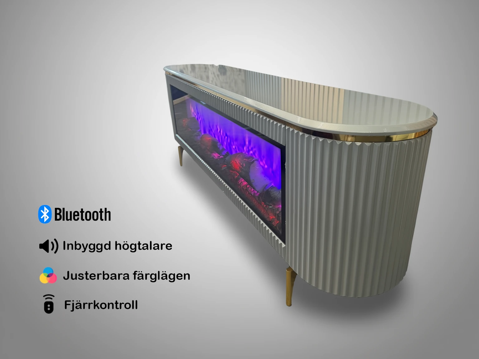 Bänken fungerar som rummets mittpunkt tack vare den integrerade elkaminen. Med fjärrkontrollen justerar du enkelt flammornas färg – välj mellan ett traditionellt varmt glödande sken eller skapa en modern stämning med lila och blå toner. För en totalupplevelse är bänken utrustad med inbyggda Bluetooth-högtalare, vilket gör det enkelt att streama musik eller förstärka TV-ljudet utan synliga sladdar eller extra enheter.