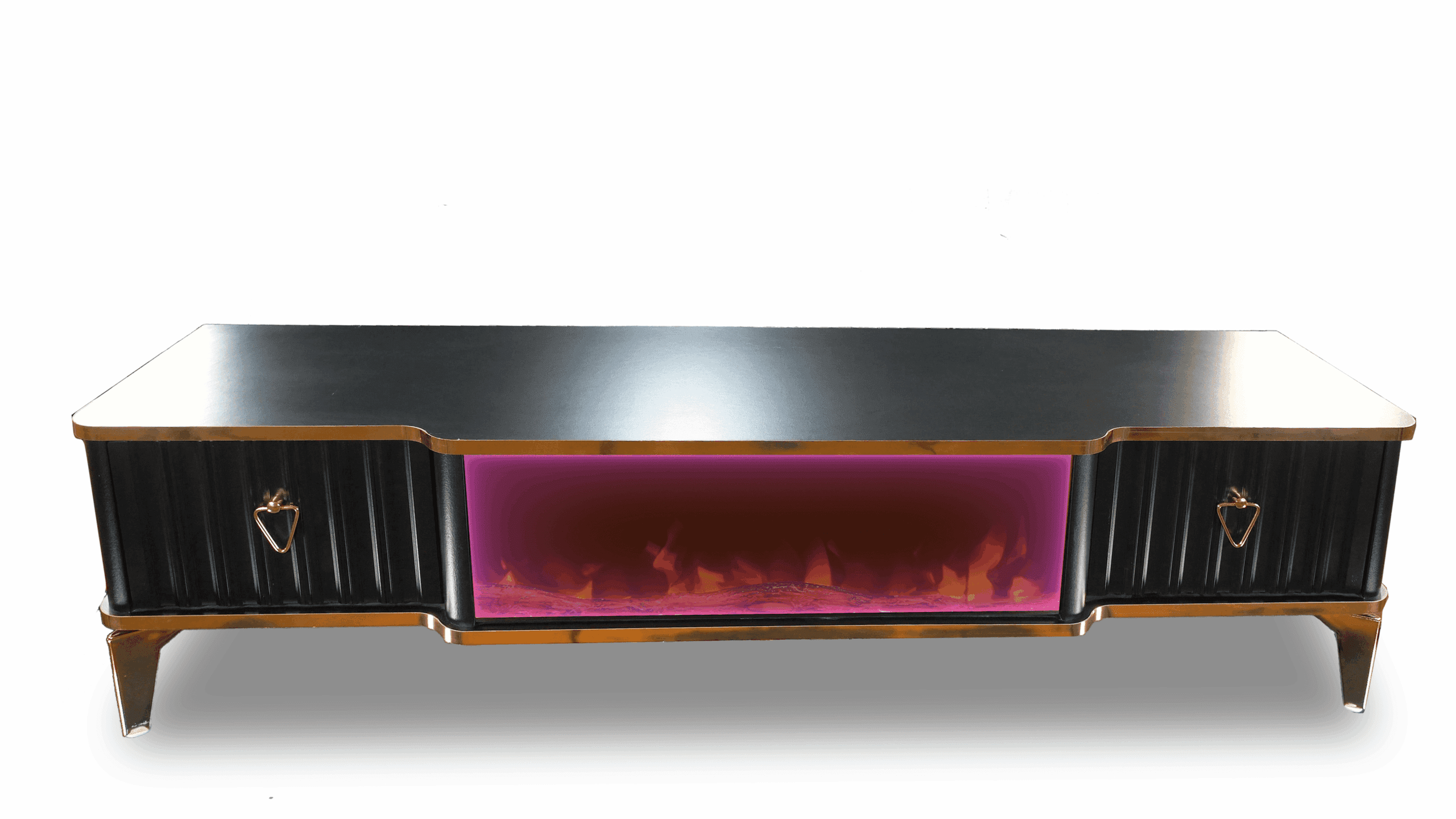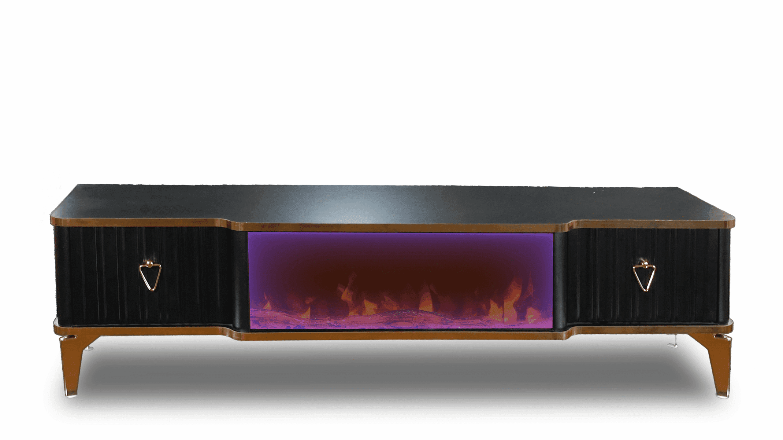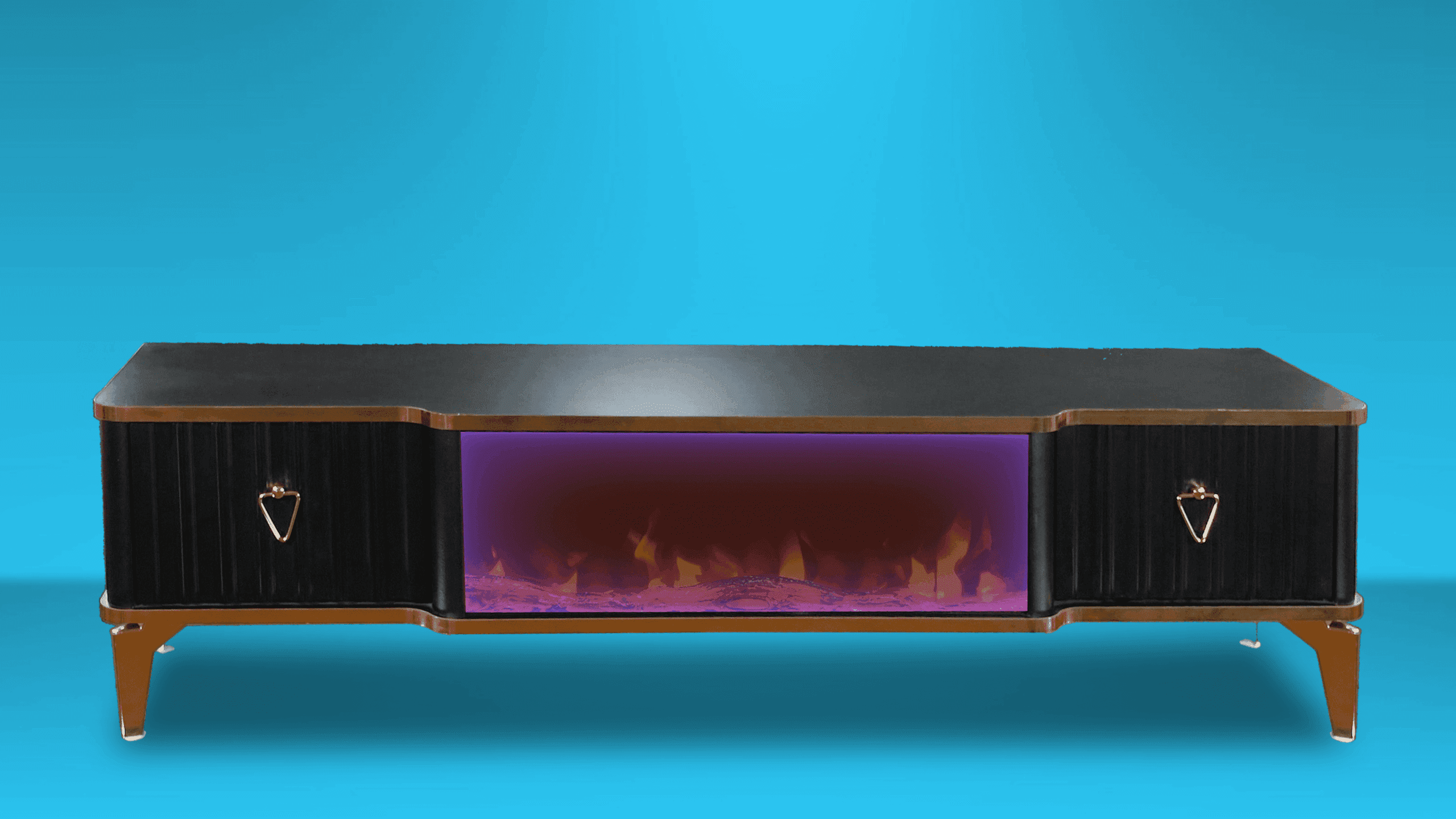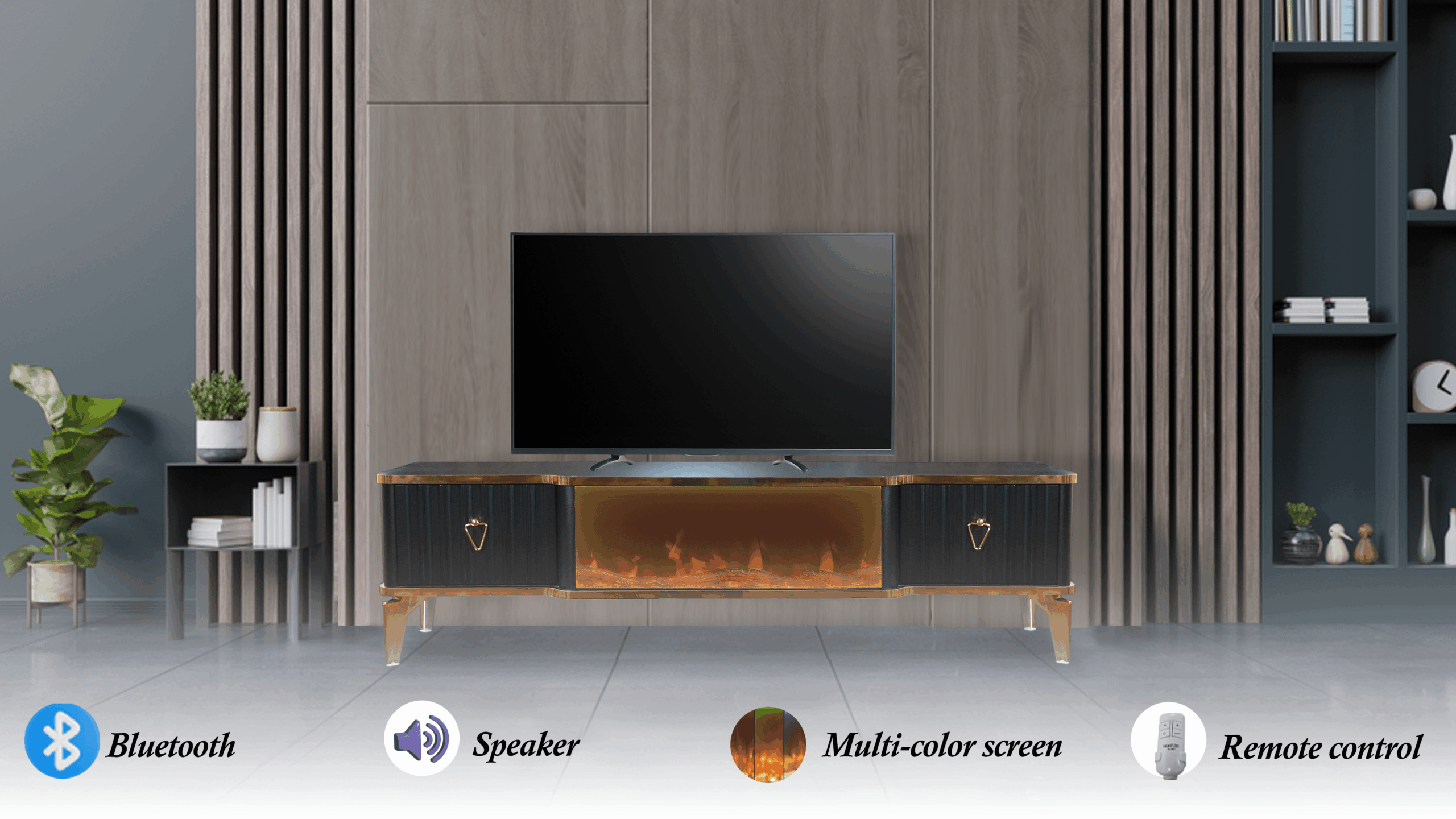 Denna tabell har många funktioner eftersom den har ett Bluetooth-system där du kan skapa en trådlös anslutning mellan bordet och mellan TV: n och även mellan mobilen eftersom bordet erbjuder en unik upplevelse när du ser eld, ved och glöd och burk Hör det brinnande ljudet och titta på det på ett trevligt sätt, så kan du alltid ändra belysningens färg genom styrenheten fäst vid bordet