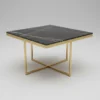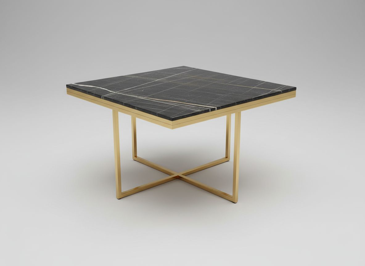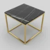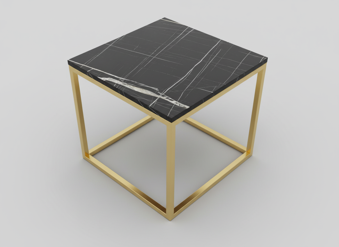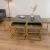 Designen präglas av eleganta kontraster där den djupa, svarta marmorimitationen möter en lyxig stomme i guldfärgad metall. De rätlinjiga ramarna ger borden en modern, arkitektonisk profil som lyfter hela rummet. Bordsskivorna är tillverkade i högkvalitativ laminerad MDF som erbjuder en slitstark och lättskött yta med ett vackert djup i marmormönstret.