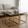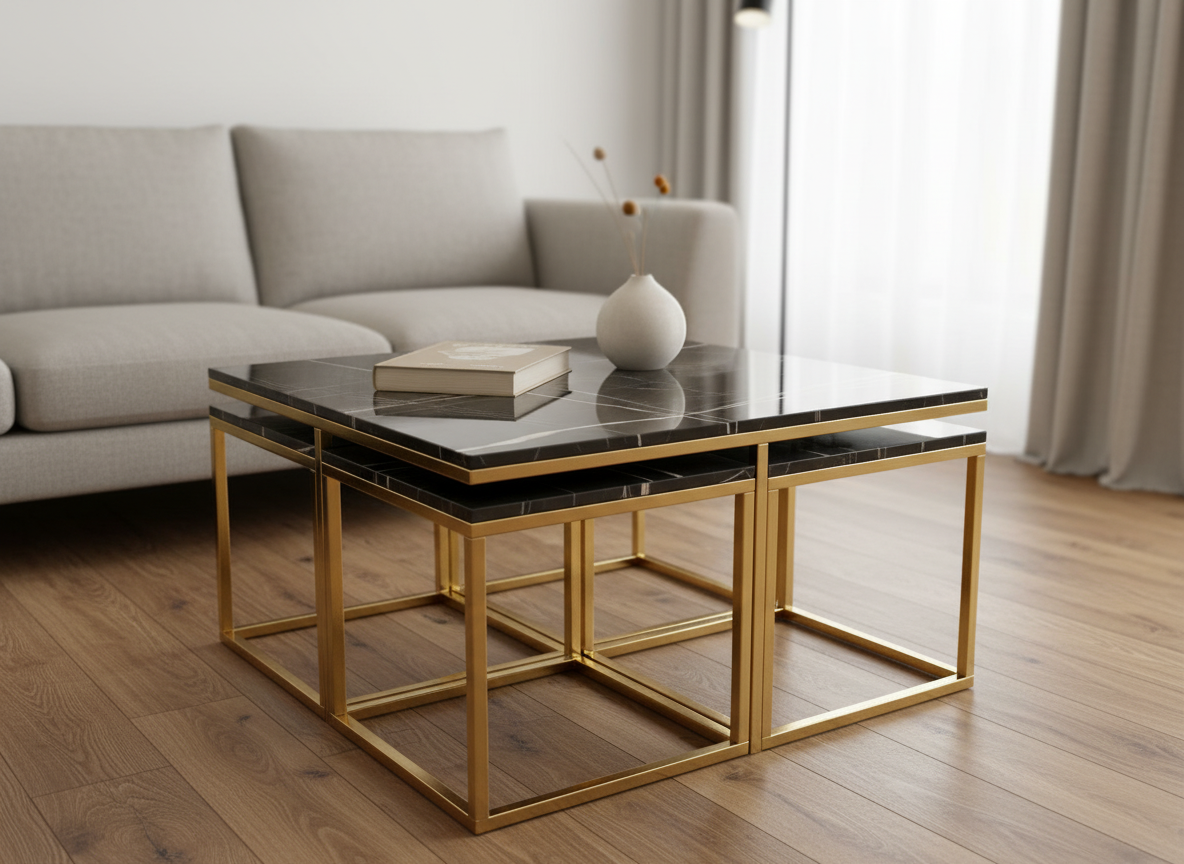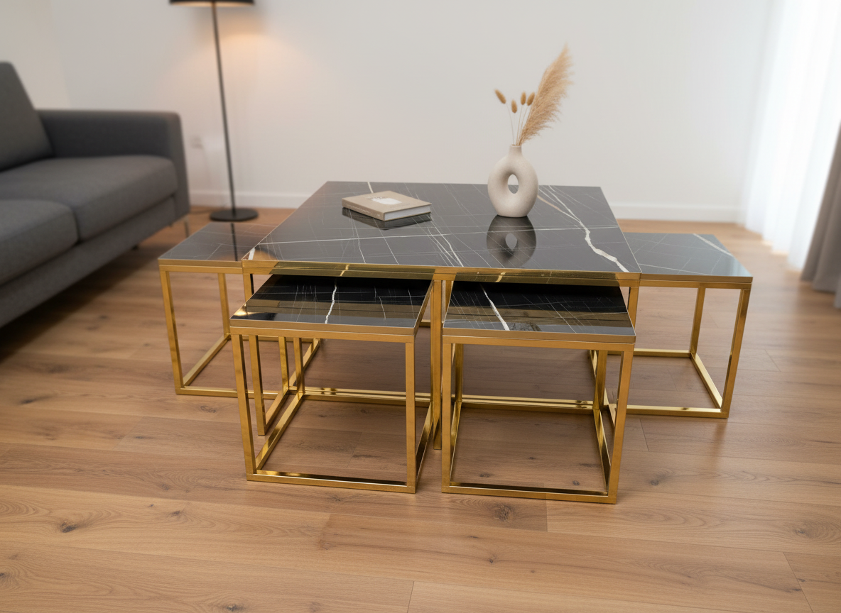 Maximera både stil och funktion i ditt vardagsrum med Valdivia, ett komplett set bestående av ett kvadratiskt soffbord och fyra matchande sidobord. Detta set är den ultimata lösningen för det sociala hemmet; sidoborden är designade för att smidigt kunna skjutas in under huvudbordet när de inte används, vilket sparar värdefull golvyta och skapar en snygg, kompakt enhet.