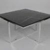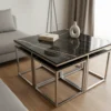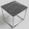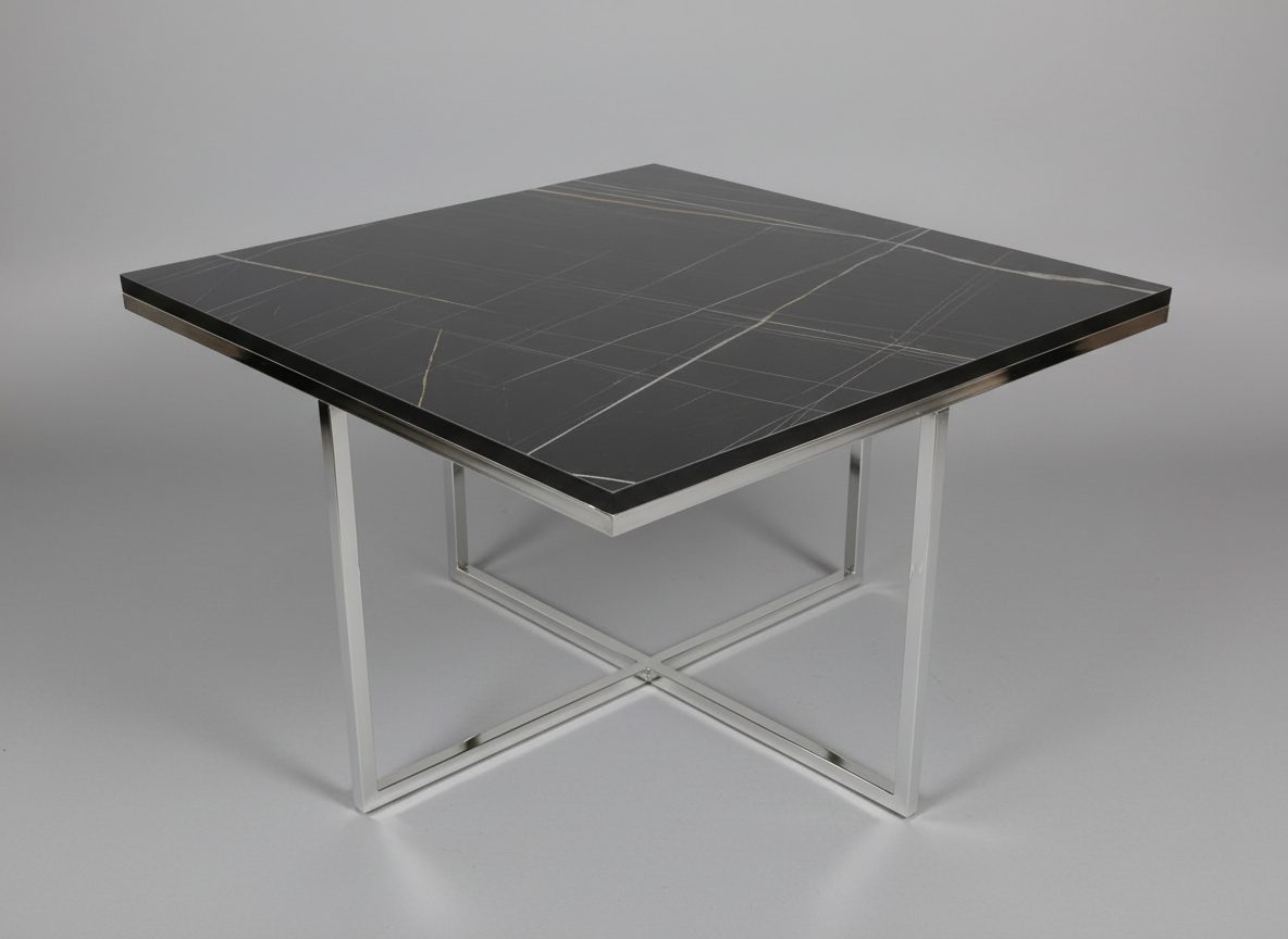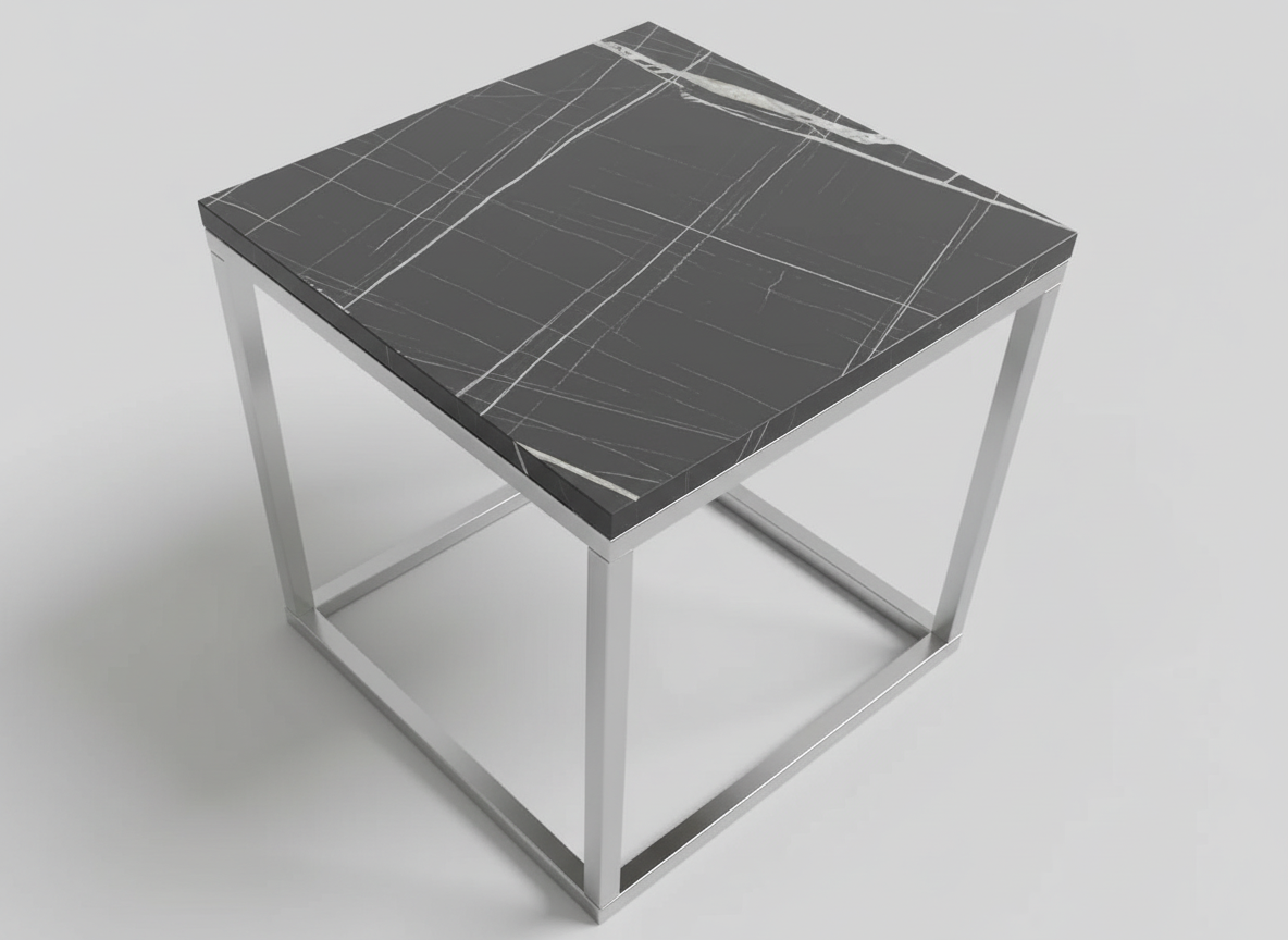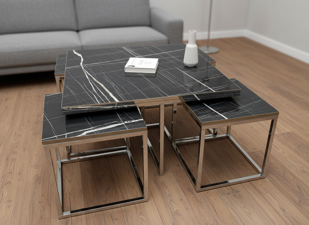 Designen präglas av eleganta kontraster där den djupa, svarta marmorimitationen möter en sval och glänsande stomme i silverfärgad metall. De rätlinjiga, kvadratiska ramarna ger borden en arkitektonisk profil som andas modern minimalism. Bordsskivorna är tillverkade i högkvalitativ laminerad MDF som erbjuder en slitstark och lättskött yta med ett vackert djup i det ådrade marmormönstret.