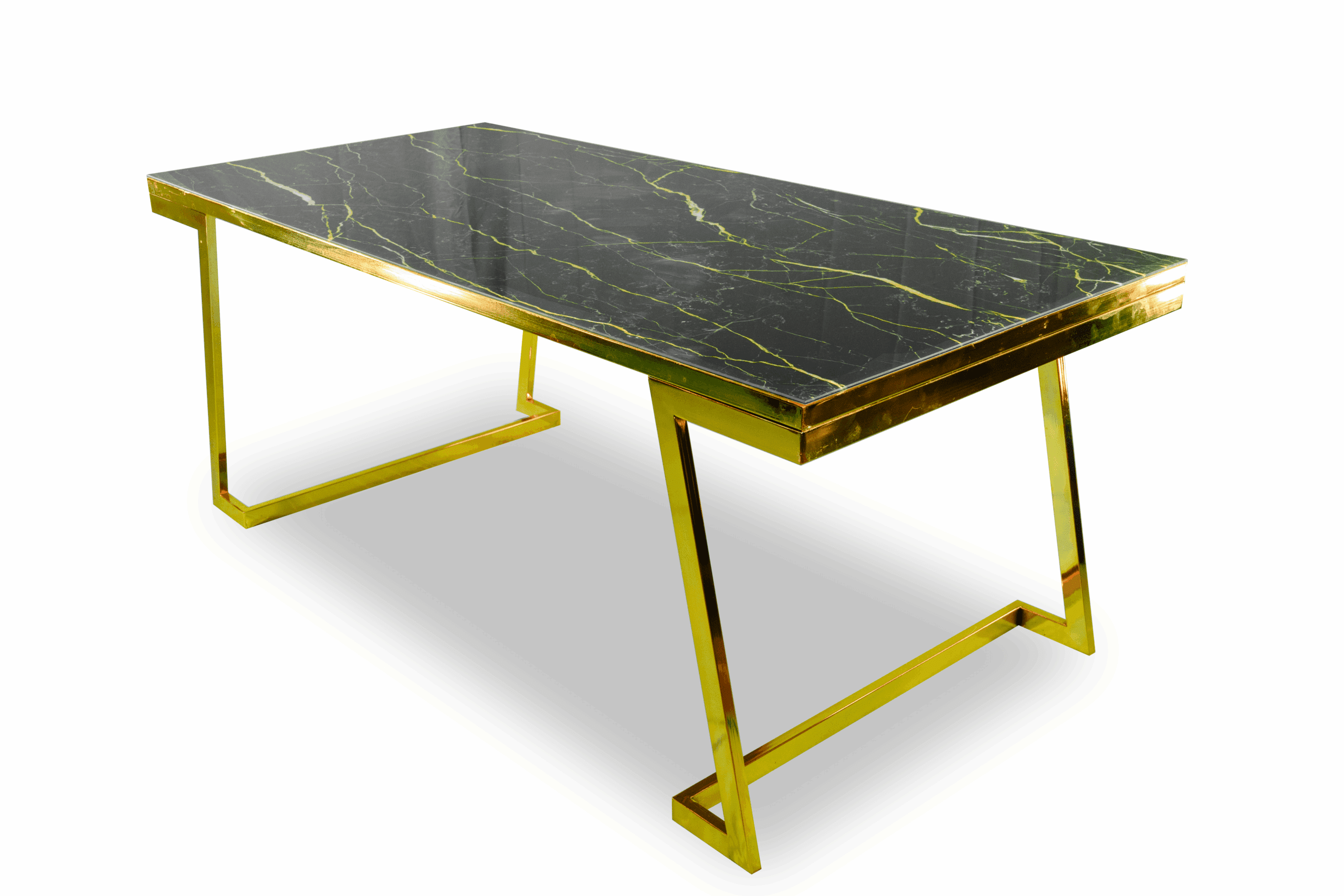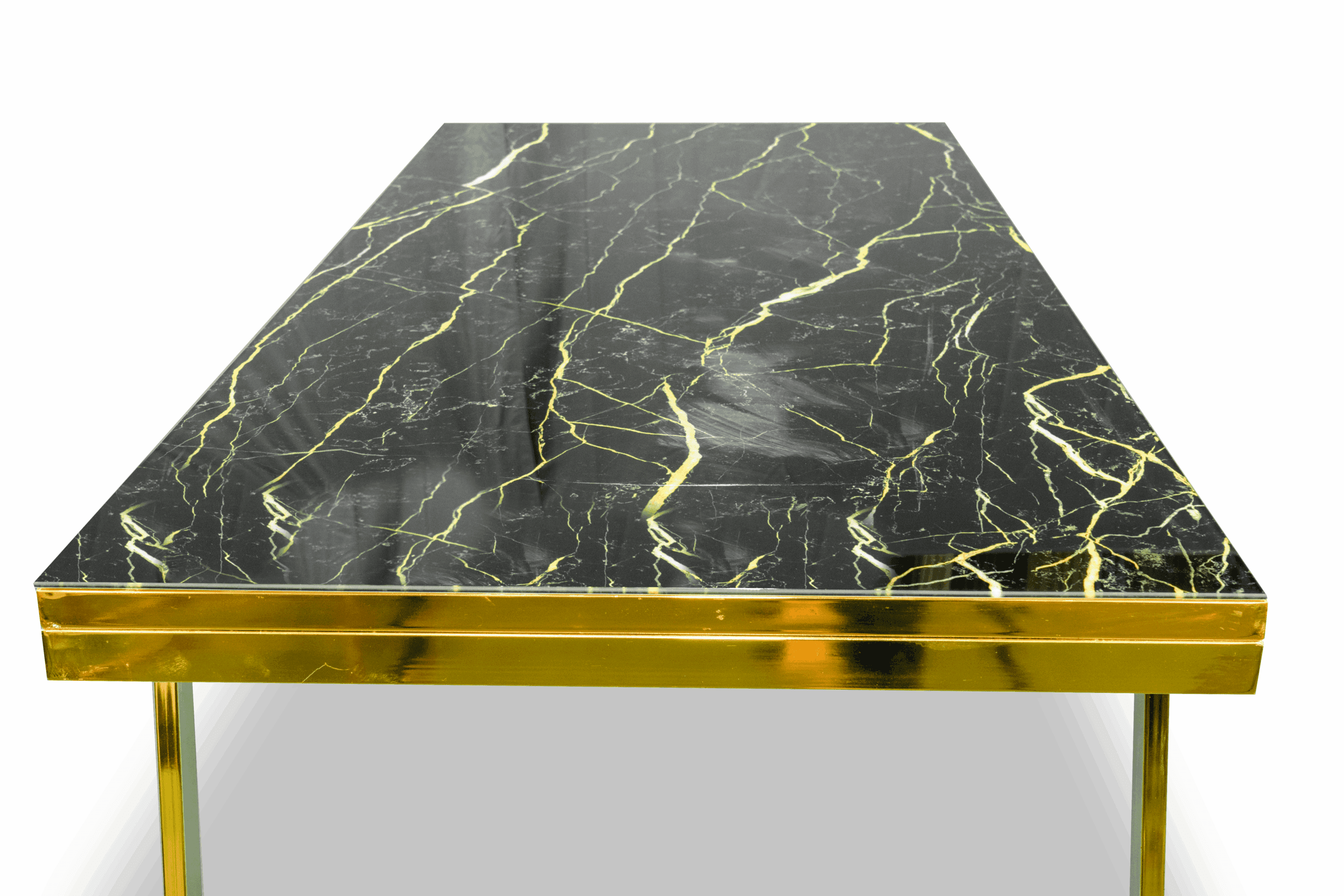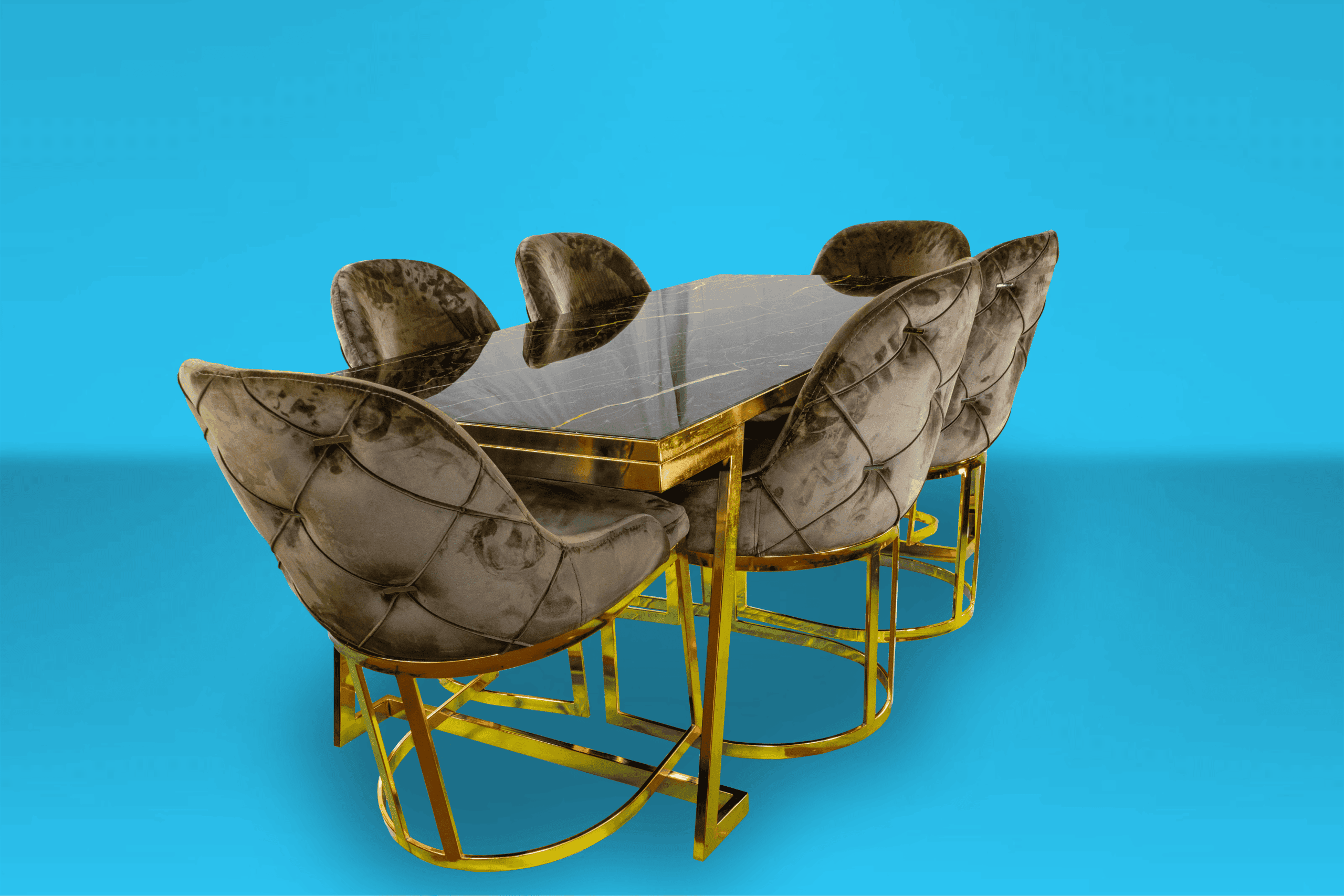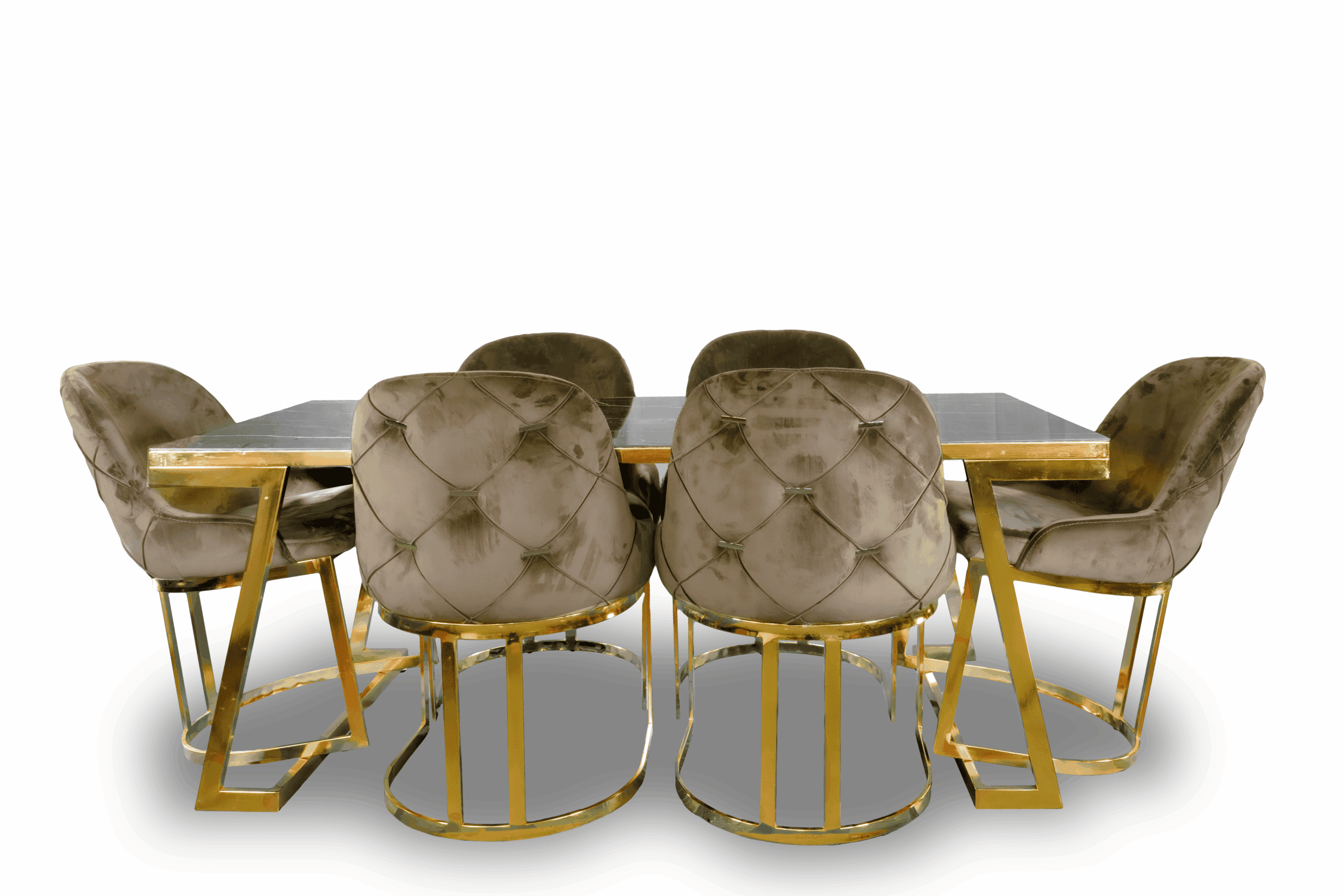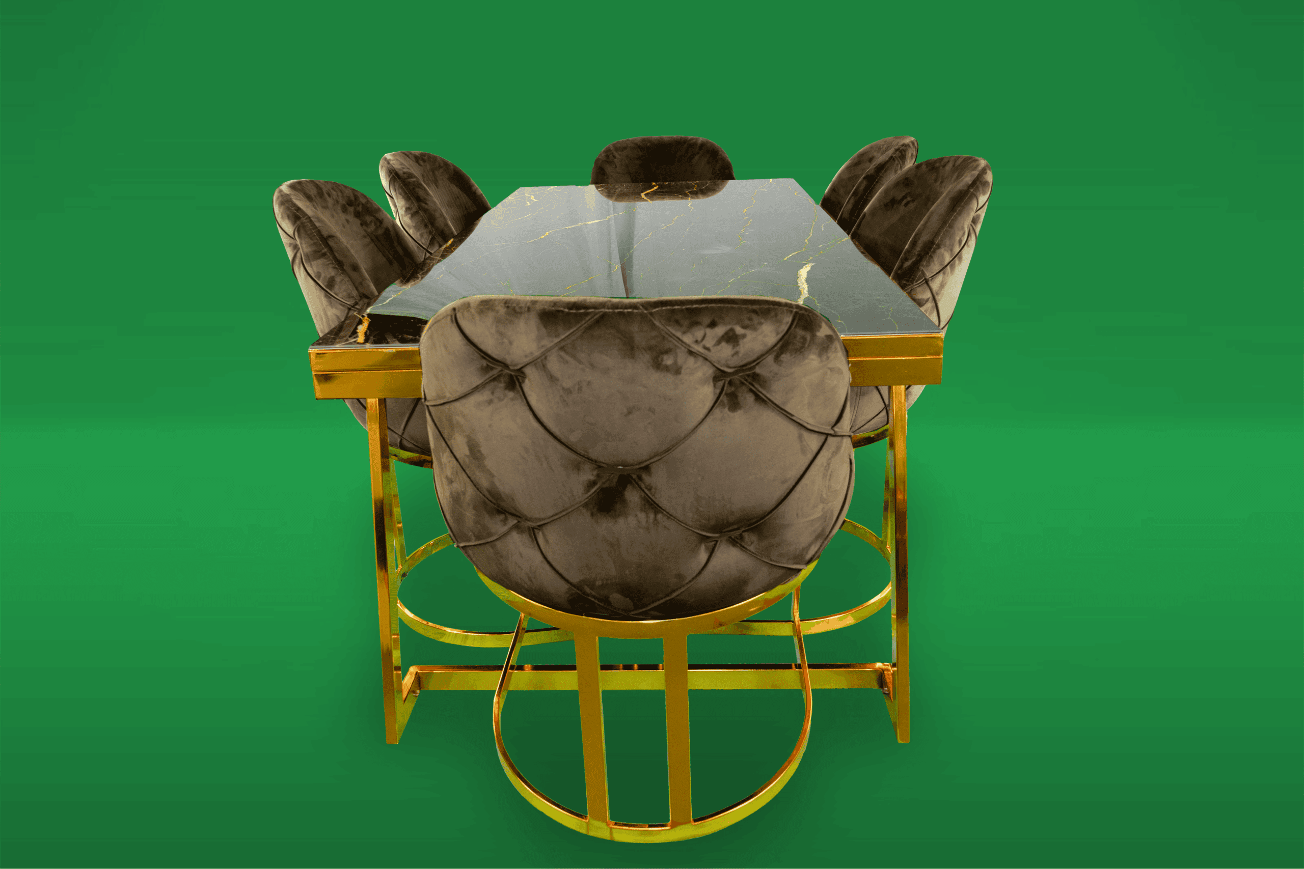 Den marmormönstrade glasskivan är minst lika vacker som äkta natursten, men är mer lättskött och beständig mot smuts och vätskor. Stolar är en klädd stol med vadderad sits och rygg. .och glaset är tillverkat av de finaste glastyperna som är splittringsbeständiga och även reptåliga.