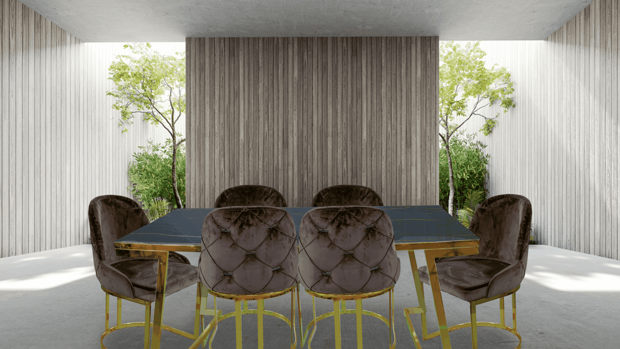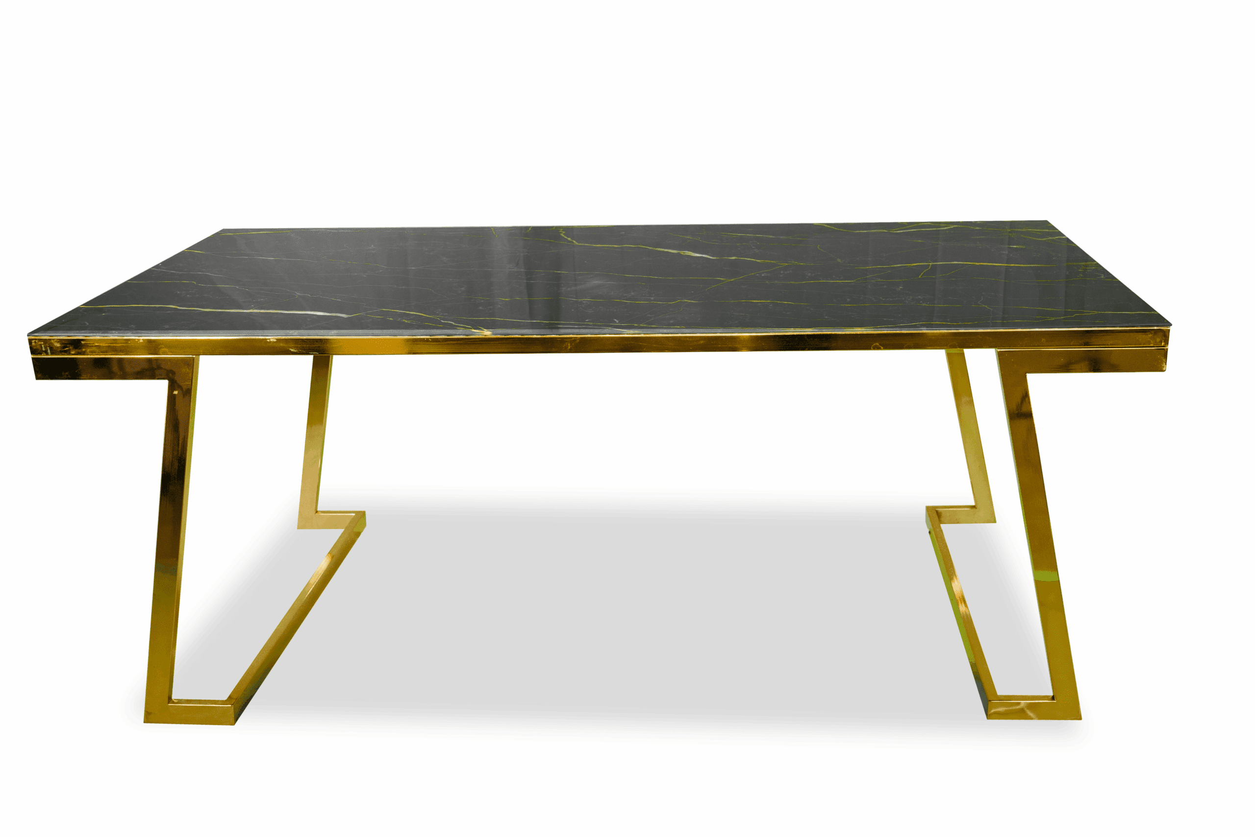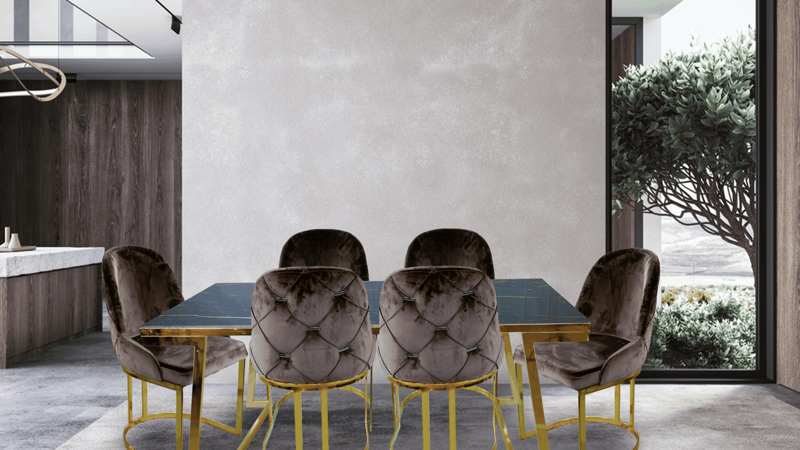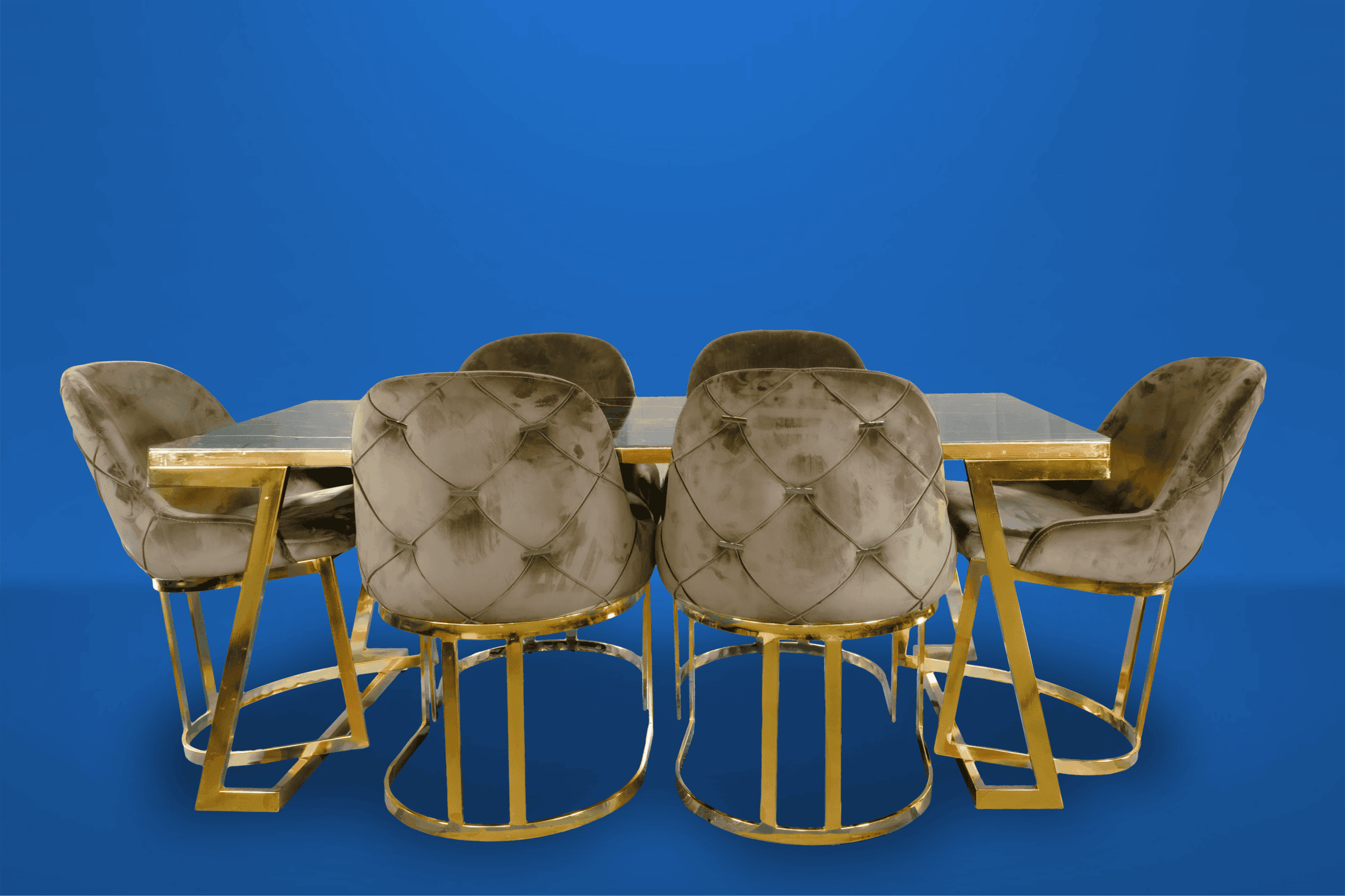 Den marmormönstrade glasskivan är minst lika vacker som äkta natursten, men är mer lättskött och beständig mot smuts och vätskor. Stolar är en klädd stol med vadderad sits och rygg. .och glaset är tillverkat av de finaste glastyperna som är splittringsbeständiga och även reptåliga.