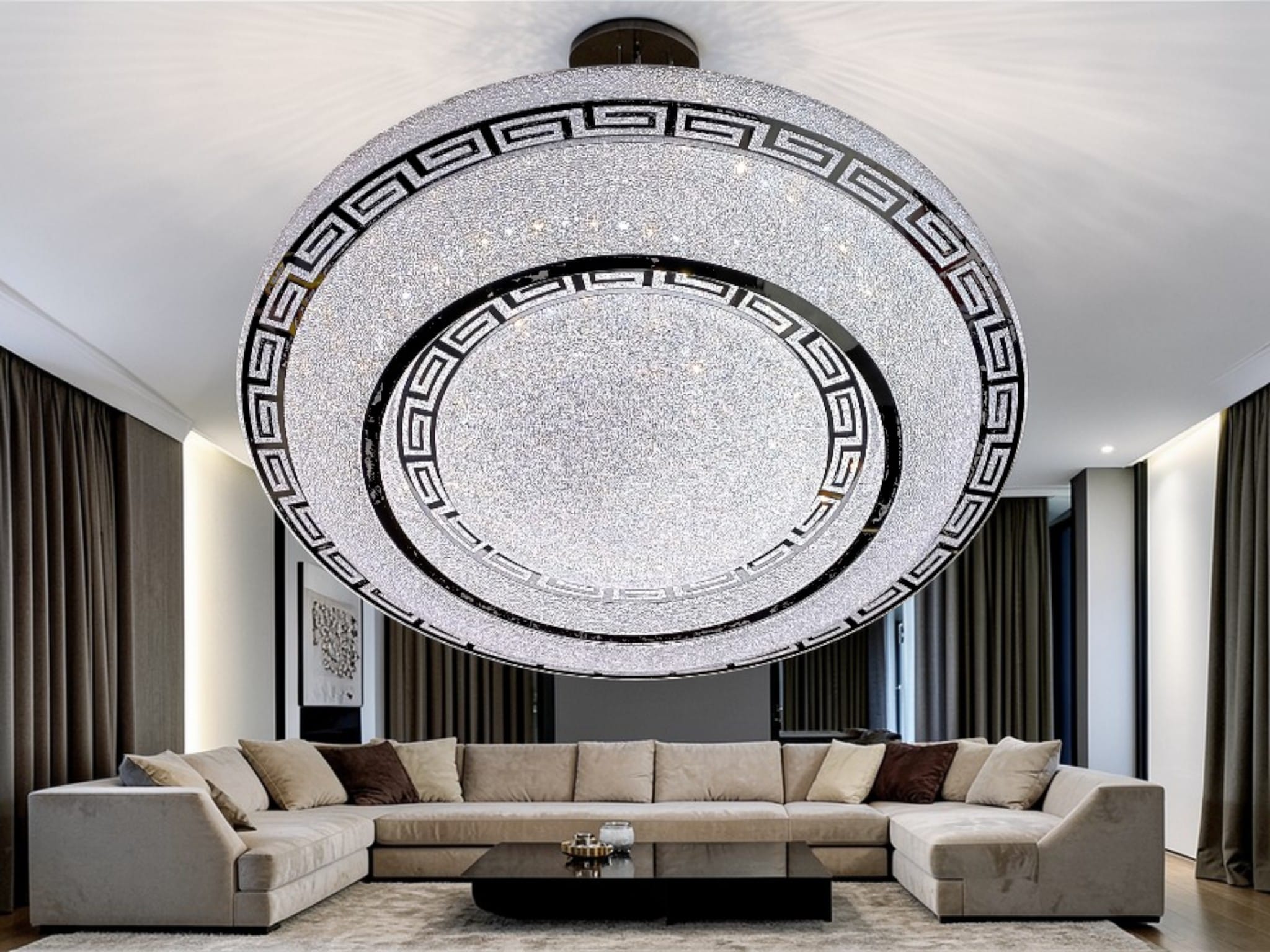 Gör ditt hem till en lyxig oas med Zenith. Denna storslagna plafond är ett arkitektoniskt mästerverk i storformat, designat för att vara rummets självklara mittpunkt och en konversationsstartare. Zenith kombinerar en storslagen kristallinramning med dolda speglar och modern smart hem-teknik, vilket ger dig full kontroll över atmosfären och känslan i rummet.
